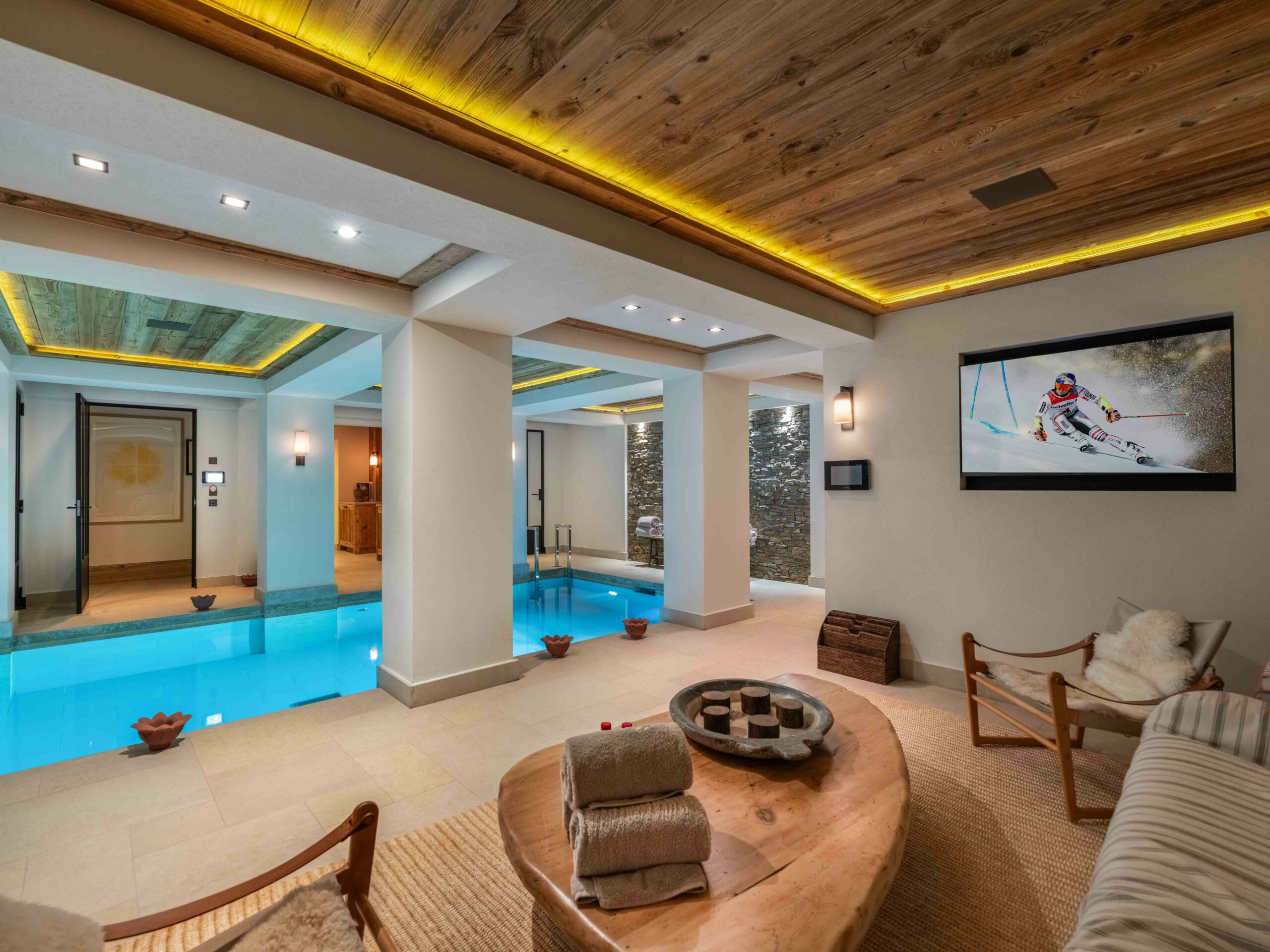 Après une journée de ski, le spa du chalet Manu devient un sanctuaire de détente. La piscine chauffée reflète la lumière douce des bougies, le hammam diffuse des senteurs d’eucalyptus, la salle de sport réveille l’énergie du corps. Plus loin, un salon de cinéma, une bibliothèque et un billard rappellent que la détente se décline aussi dans la convivialité. Tout ici respire le confort et la sérénité d’une vie alpine d’exception.