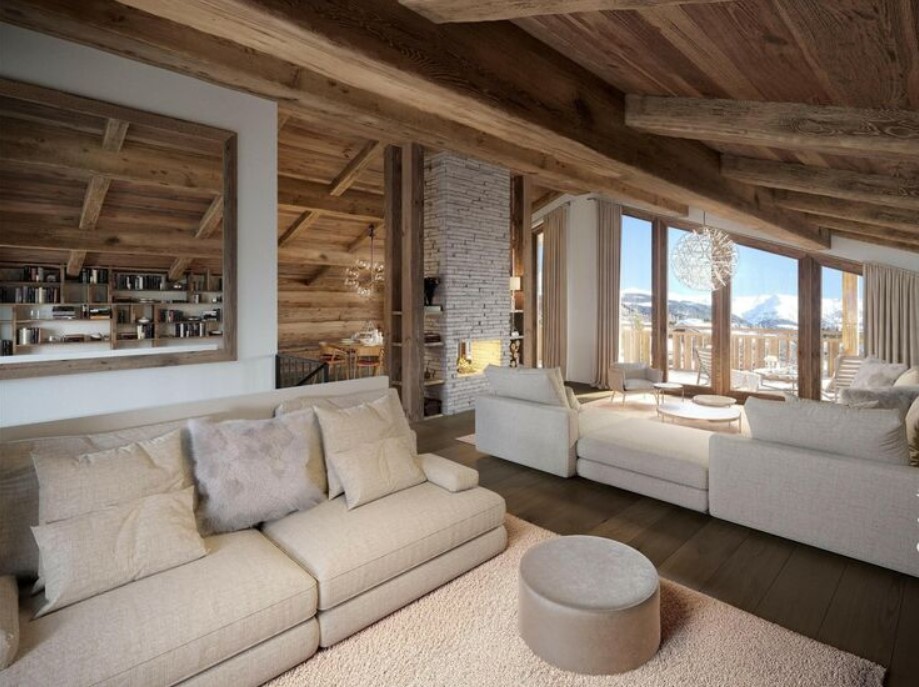 Ce majestueux chalet d’architecture moderne est fait de pierre et de boiseries. Il offre des volumes généreux, un espace de vie confortable. Puis ce chalet offre des vues spectaculaires sur la vallée en contrebas de la charpente.
