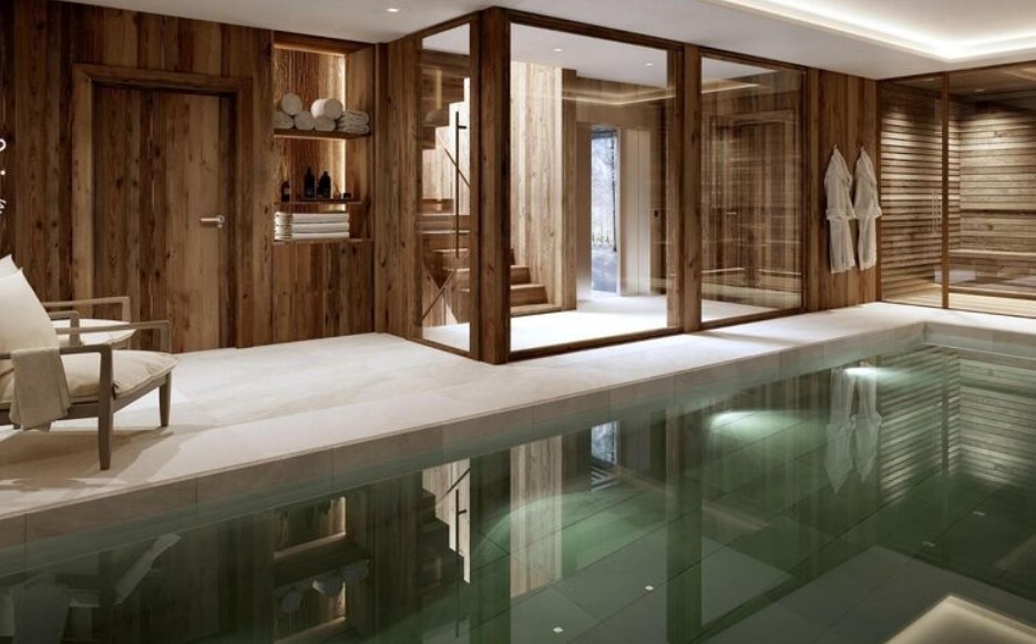 Le chalet dispose de 5 salles de bains attenantes aux 5 chambres adaptées aux personnes à mobilité réduite (PMR). Un espace bien-être avec piscine et sauna, une confortable salle de cinéma. De plus, nous avons aussi un spacieux espace de vie au 2ème étage lumineux. En fait, cette pièce de vie possède une grande cheminée centrale qui offre une ambiance chic et chaleureuse autour de laquelle vous pourrez passer des soirées cosy en famille ou entre amis.