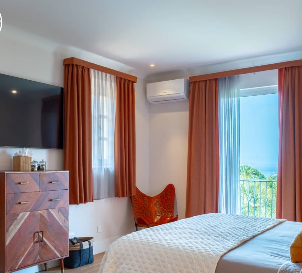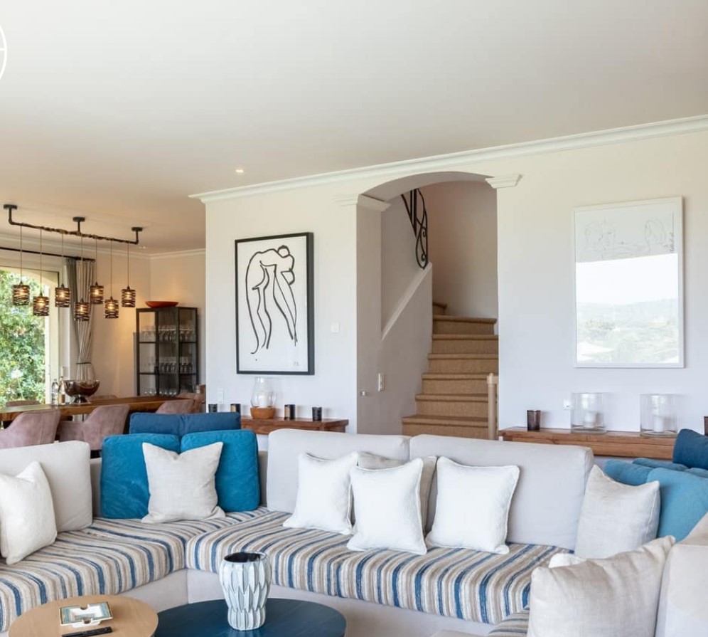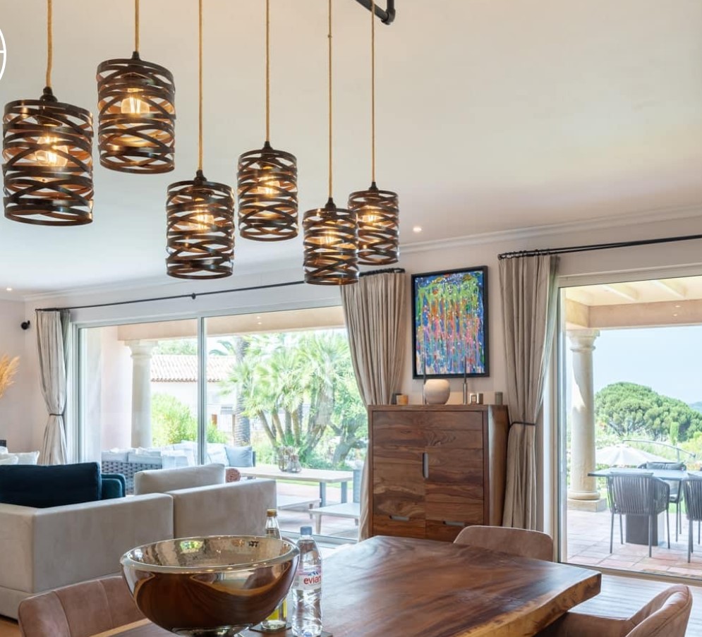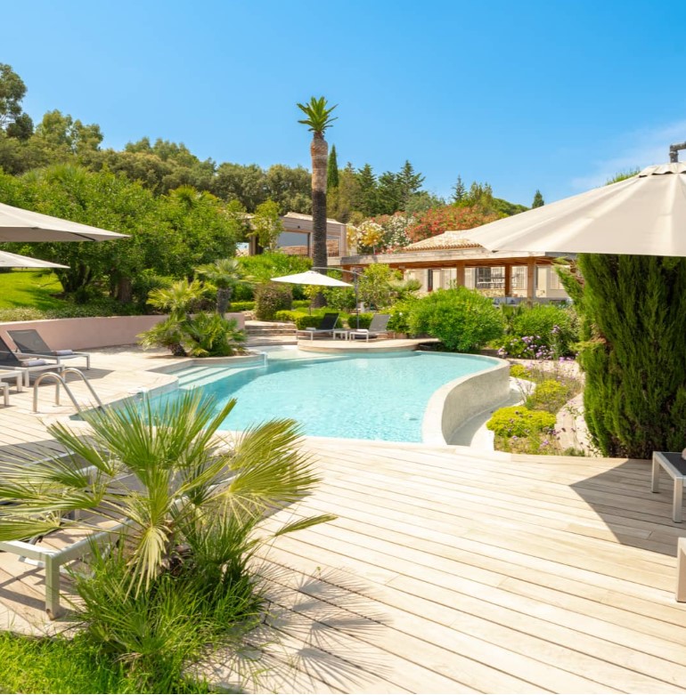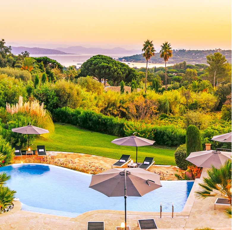 La villa s‘étends sur plus de 554 m² et offre 7 chambres et 7 salles de bain pour 18 personnes. Un grand espace de vie donnant sur la terrasse avec une vue imprenable sur la baie des Canoubiers, le château Borelli et en toile de fond la Belle Isnarde. Puis, nous avons également 2 chambres et 2 salles de bain dans l’annexe pour le personnel ou les invités.