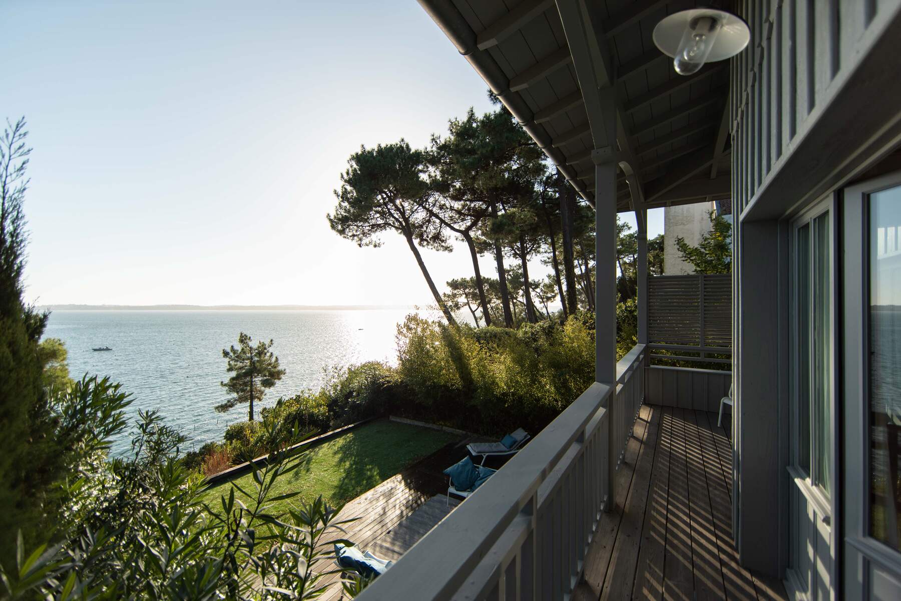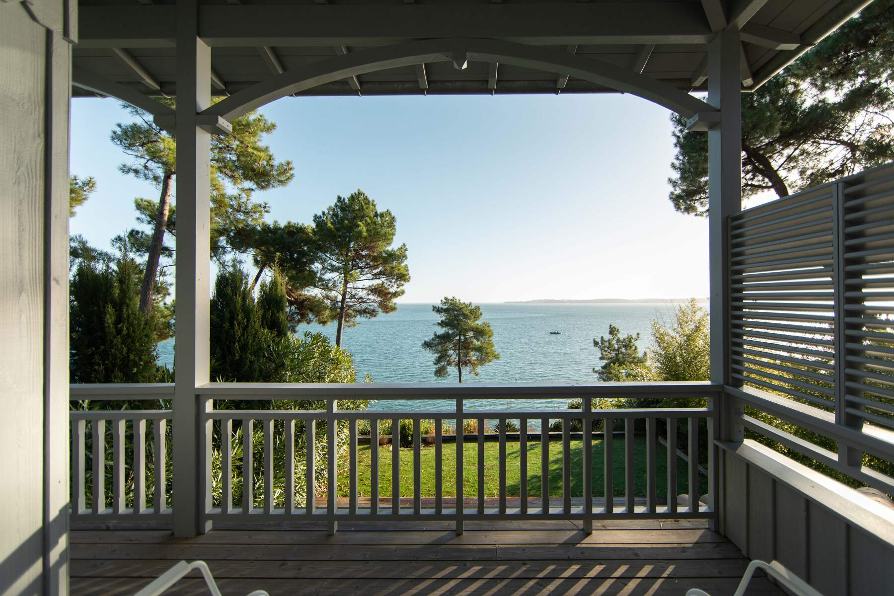 Un beau jardin qui donne directement à un petit ponton pour descendre dans l’eau.