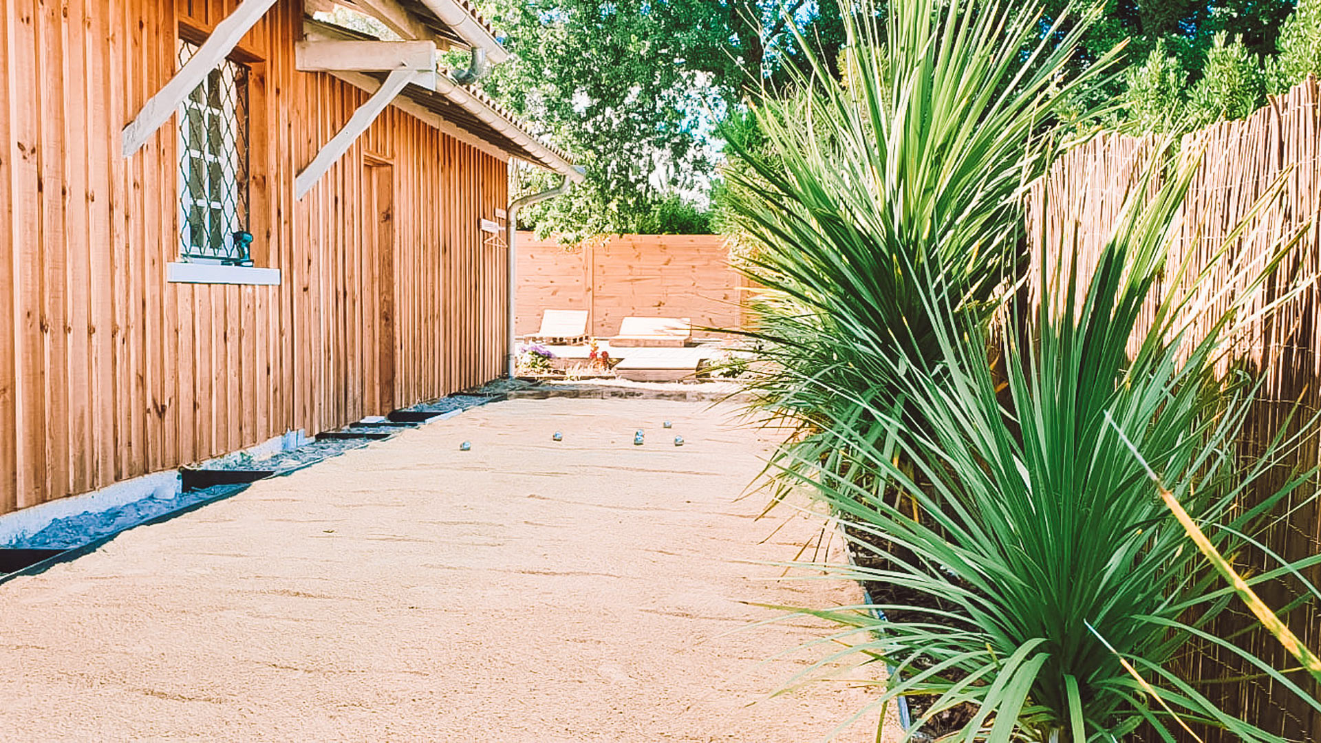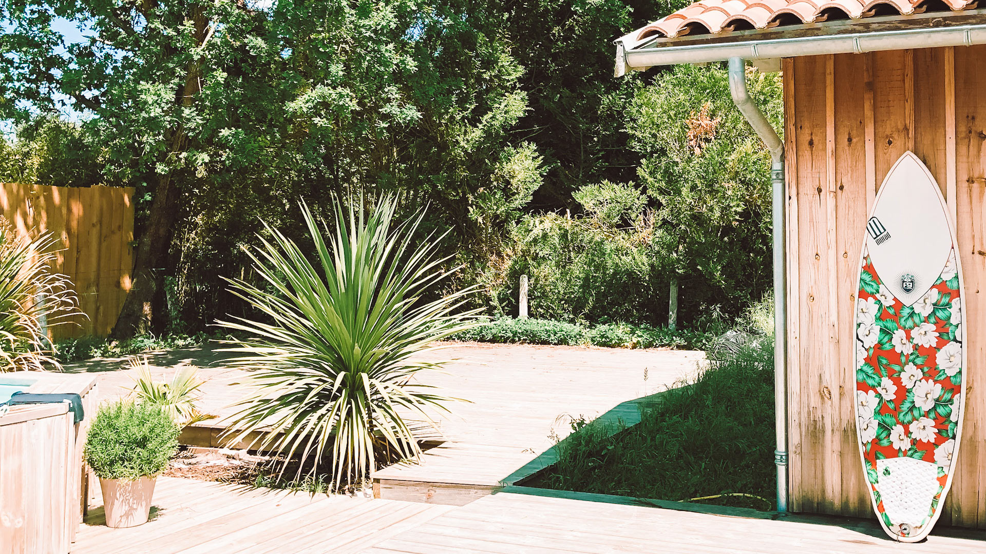 En effet, au cœur d’un jardin arboré de 1300 m² divisé en 2 avec la partie côté jardin ou côté terrasse. Certes, il est bon de profiter soit du côté jardin pour être au calme et lire un bon bouquin. Mais, le côté terrasse avec la piscine invite au bronzage les après midis ensoleillés. Puis, le soir, au calme, une partie de pétanque autour du verre de l’amitié est un bonheur pour toute la famille. La cabane dans le jardin est très pratique pour ranger vos surfs et vos affaires de plage. Un parking 5 voitures est à votre disposition.