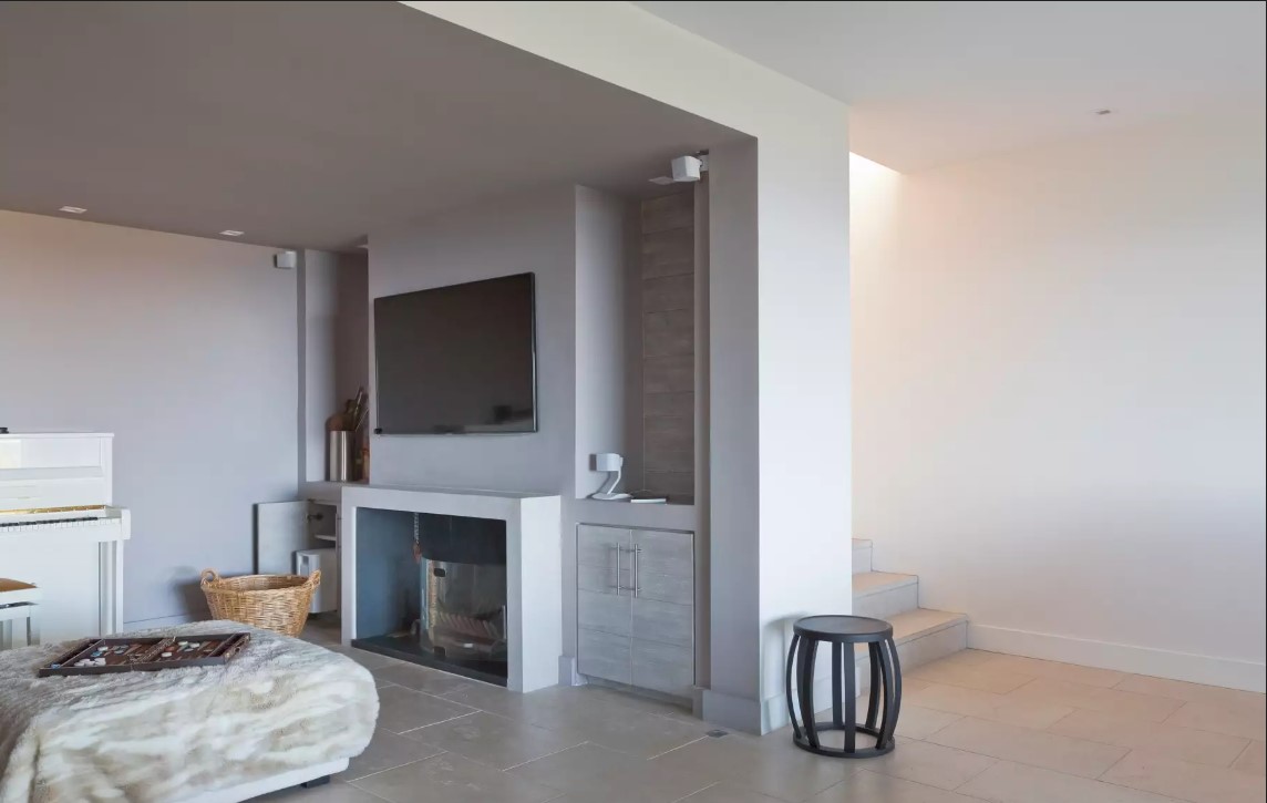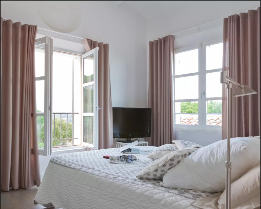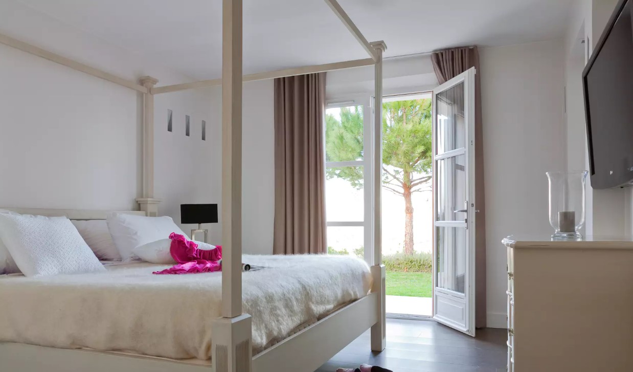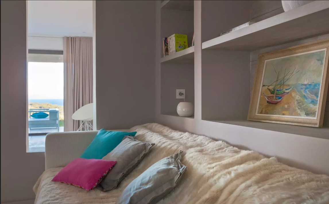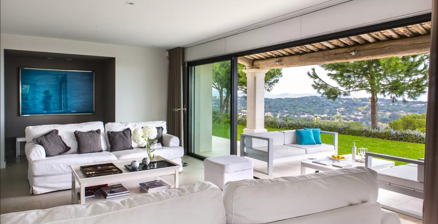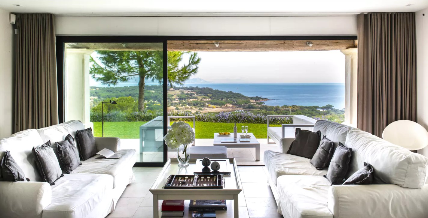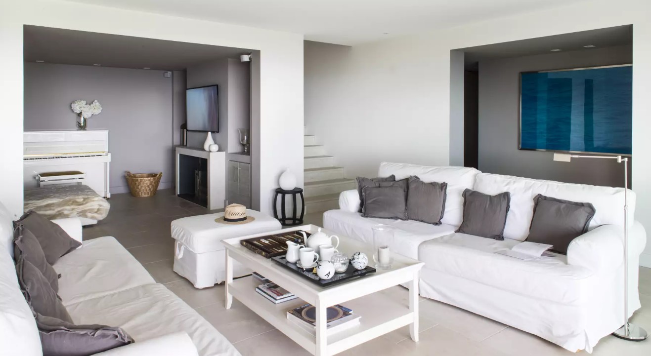 Le salon avec une vue imprenable sur la baie est divisé en deux zones. En fait, le salon principal possède un grand canapé blanc donnant sur la terrasse. Puis, la salle à manger d’été par la baie vitrée. Puis, un autre espace ouvert qui fait office de boudoir. Un endroit avec une télévision à écran plat et un beau piano.
