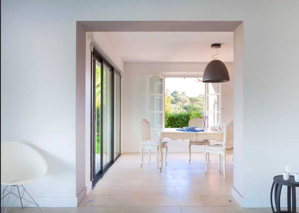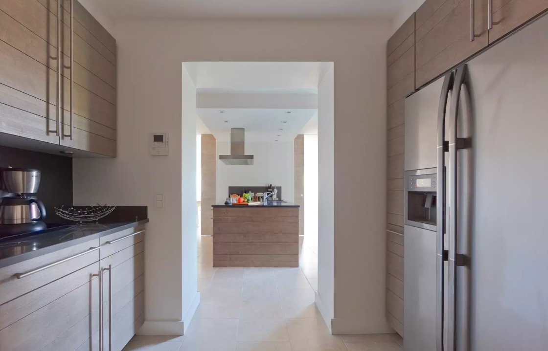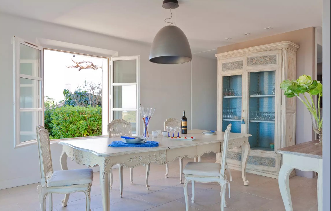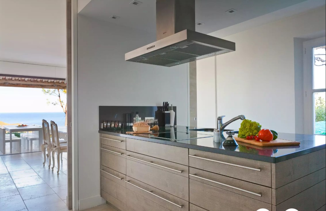 Puis, aménagée autour d’un îlot central, la cuisine offre une salle à manger donnant sur la terrasse pour partager de grands dîners en famille ou entre amis.