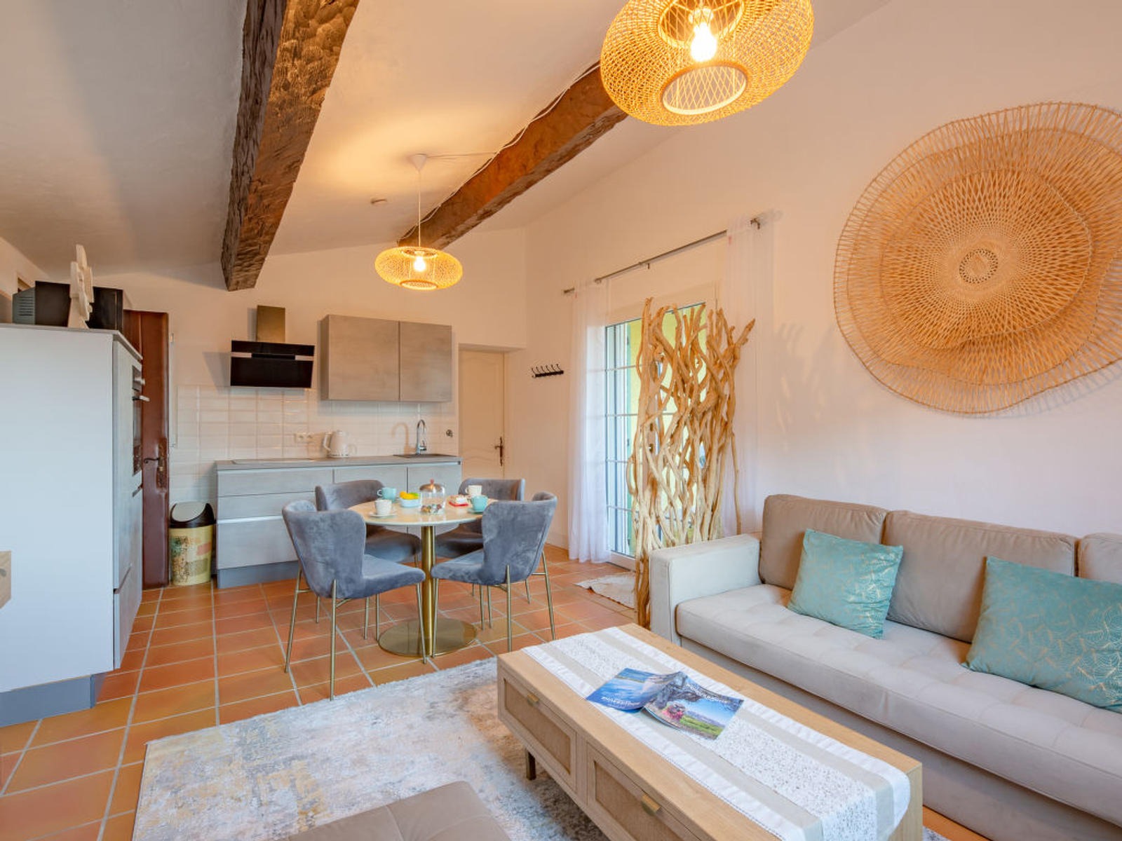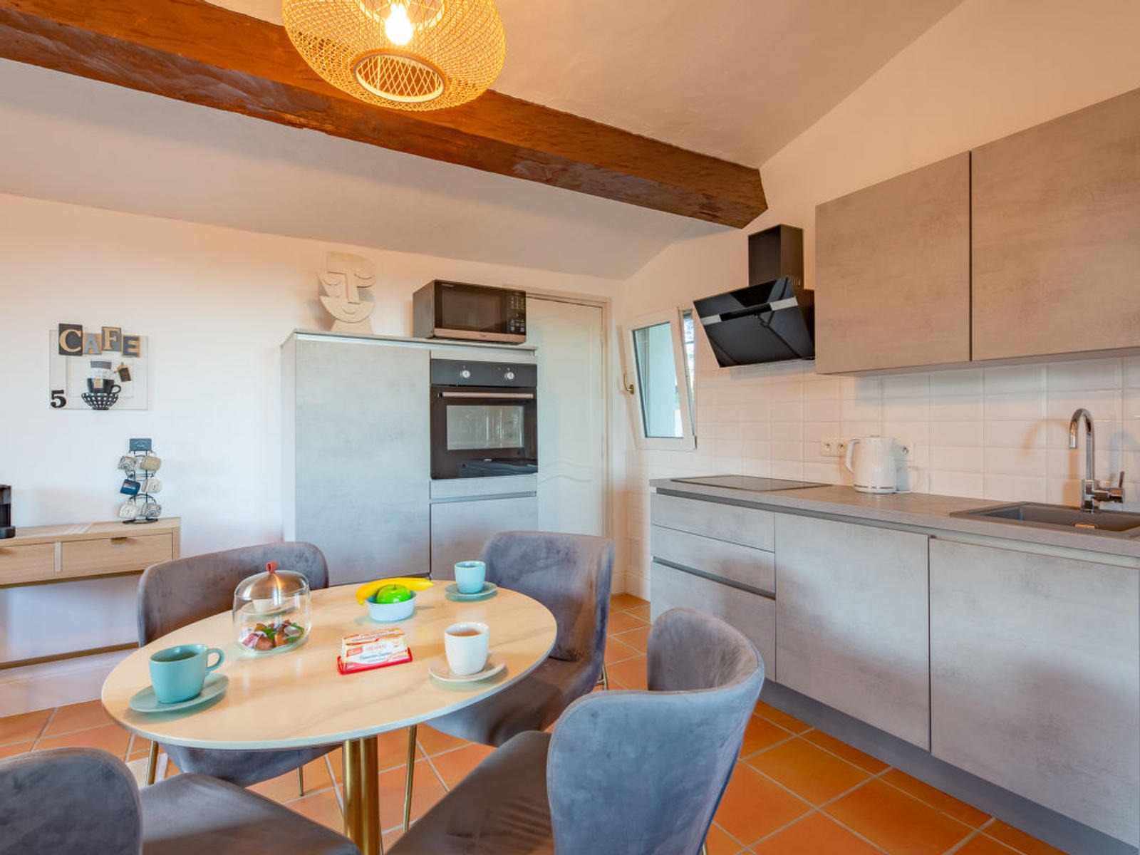 La cuisine ouverte est entièrement équipée avec four, micro-ondes, plaques à induction, lave-vaisselle, congélateur, cafetière électrique, grille-pain et bouilloire. Vous pourrez préparer de délicieux repas à partager sur la terrasse, équipée d’un barbecue et de mobilier de jardin.