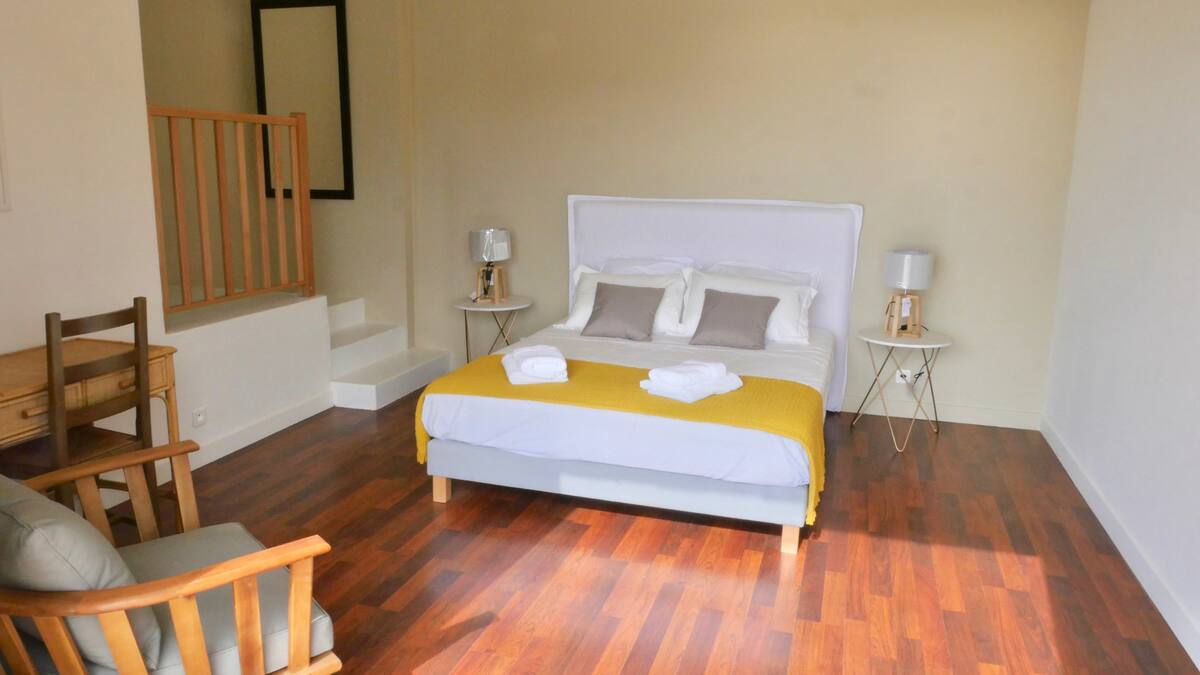 Rez-de-jardin: charmant studio indépendant (entrée indépendante) d’une surface de 20 m2 avec sa salle de bain et kitchenette Un petit plafond bas (1,85 m) pour un esprit zen et cocooning, En fait, Il s’agit plutôt d’une pièce supplémentaire (sorte de pool house fermé) qui permet de prendre un café ou de se reposer le jour au frais près de la piscine.