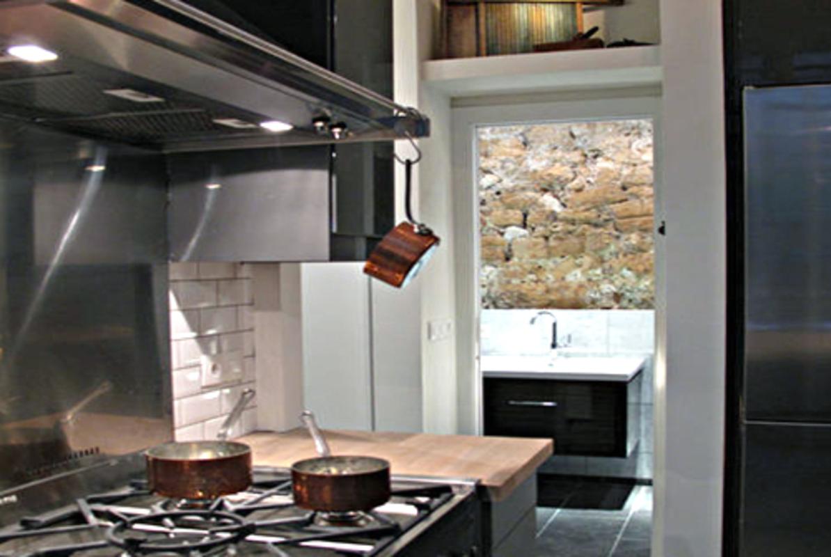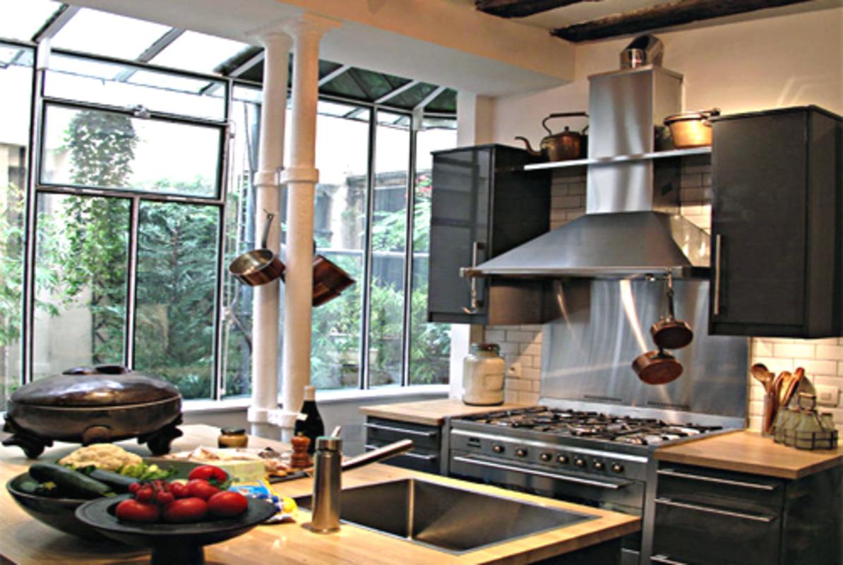 L’appartement est situé au rez-de-chaussée et au premier étage de l’immeuble, auquel on accède par l’ancienne cour où l’on est accueilli par une oasis luxuriante de plantes et de verdure. L’appartement ou ancien "atelier" ; a été utilisé par de nombreux artisans parisiens du passé. La paroi de verre de 10 mètres de long signifie qu’il y a toujours beaucoup de lumière.