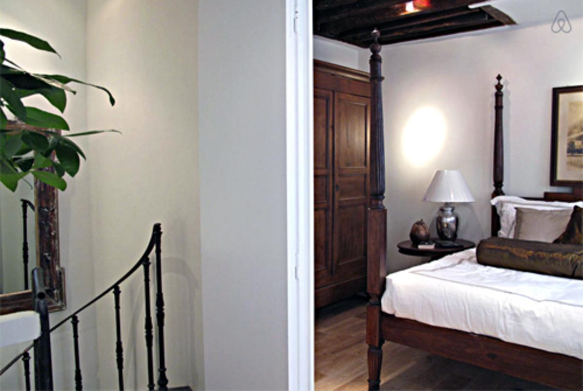 Situé dans une rue étroite et intéressante au milieu du Marais, l’appartement fait partie d’un bâtiment du 18ème siècle qui était autrefois une ancienne imprimerie. Heureusement, de nombreux éléments anciens et originaux ont été conservés, y compris les poutres de plafond et les murs de pierre exposés, ce qui a permis à la propriété d’avoir des masses de caractère