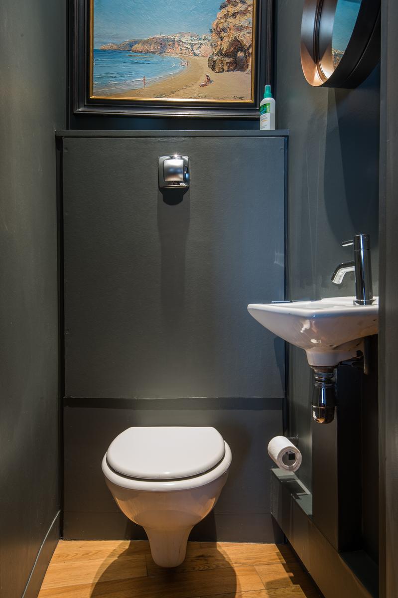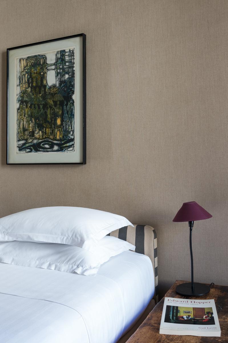 Il y a de la place pour six autres dans la salle à manger peinte à la moutarde, et à gauche vous trouverez la chambre des maîtres. Une chaise pourpre et une commode en bois font face au lit queen-size, tandis que la salle de bains a une palette naturelle. Au bout du couloir, la deuxième chambre a des murs taupe et un bureau à côté de la fenêtre. L’art encadré est suspendu entre les deux lits simples, et il y a des tuiles d’ardoise dans la salle de bains contemporaine.