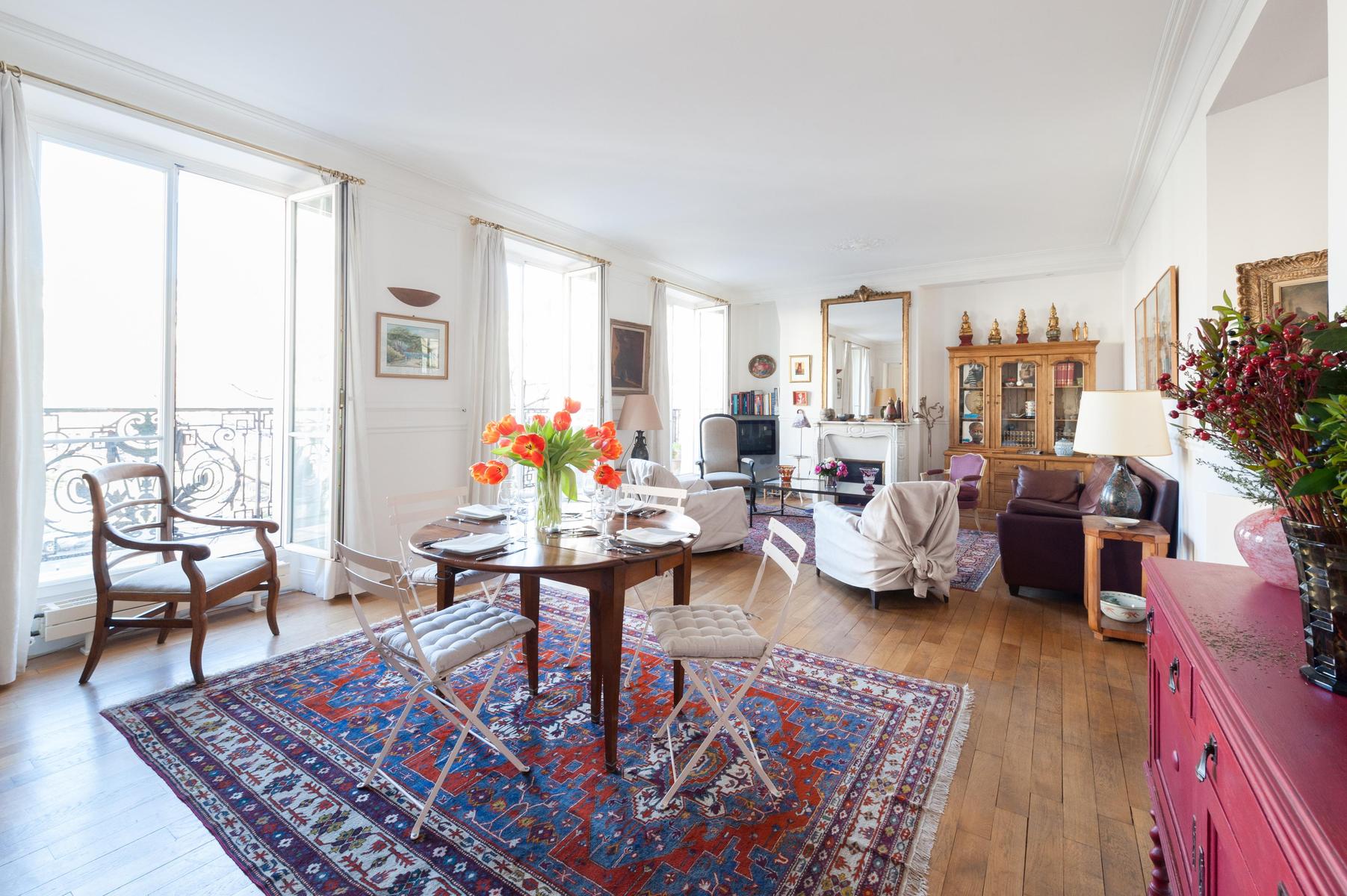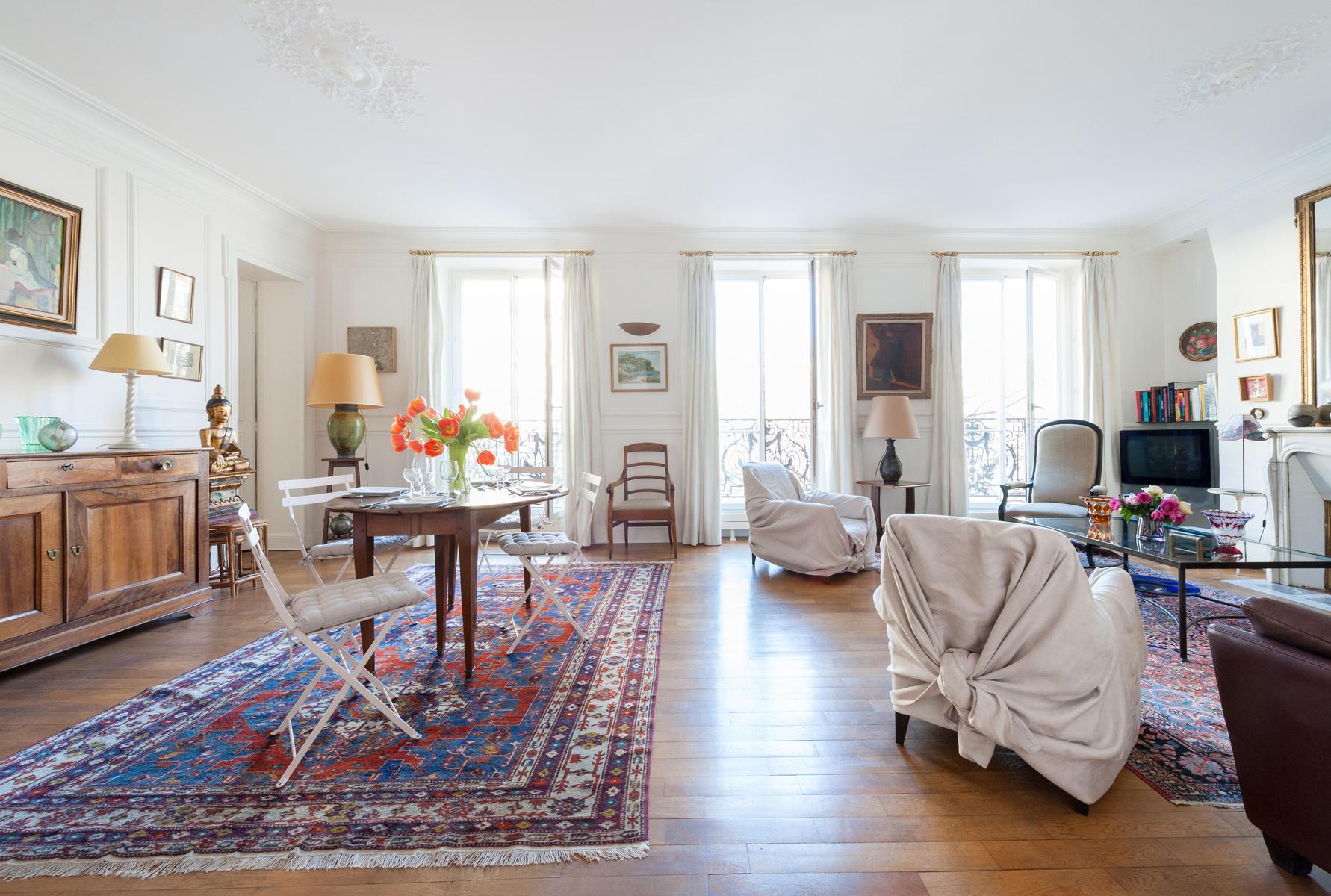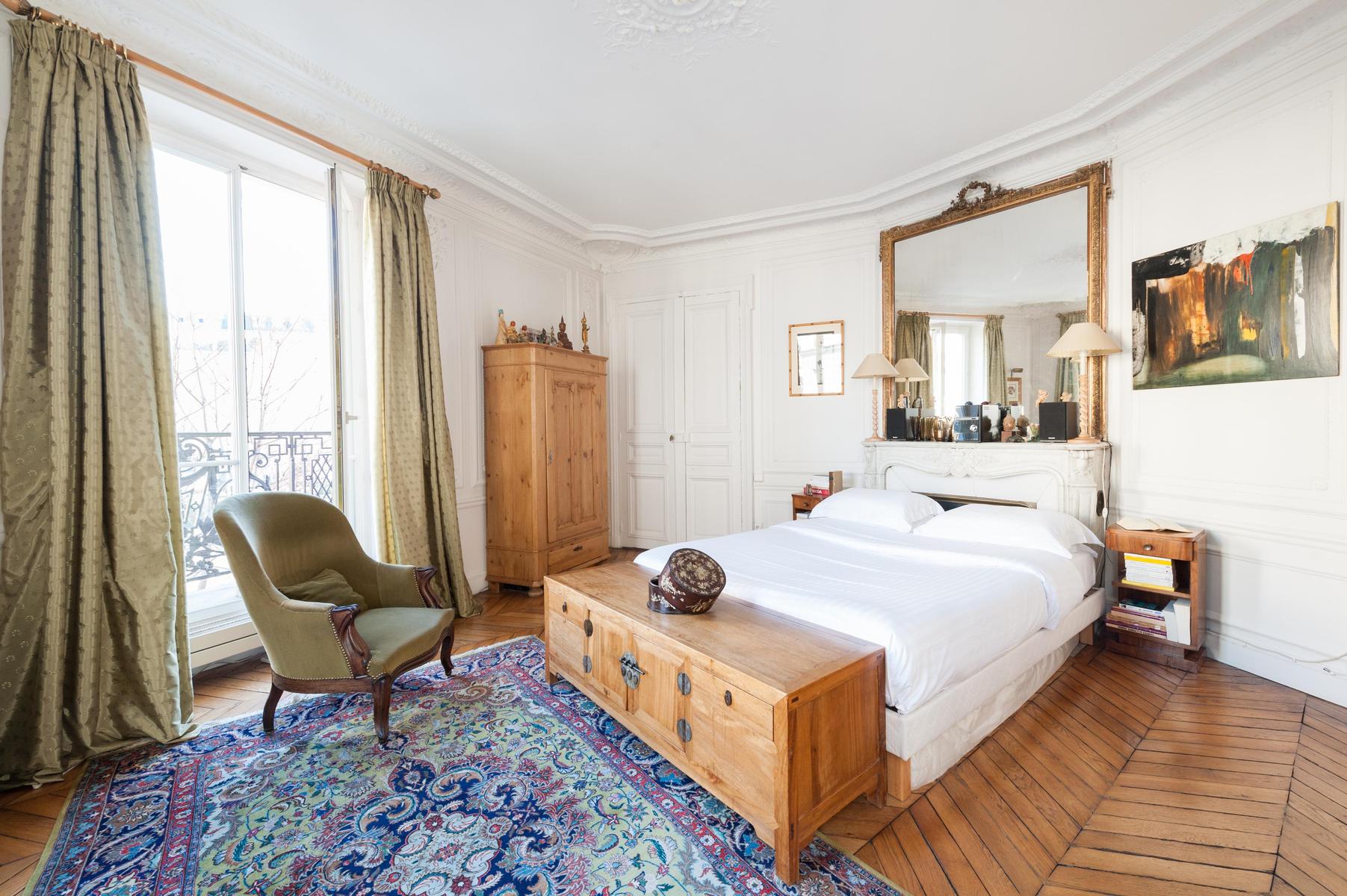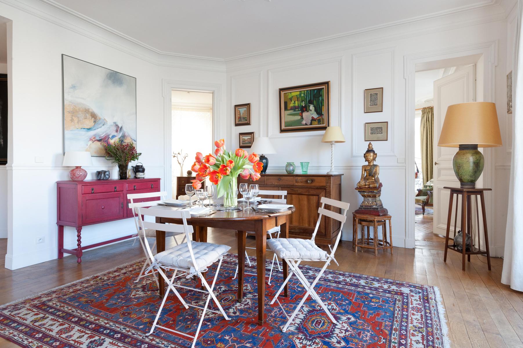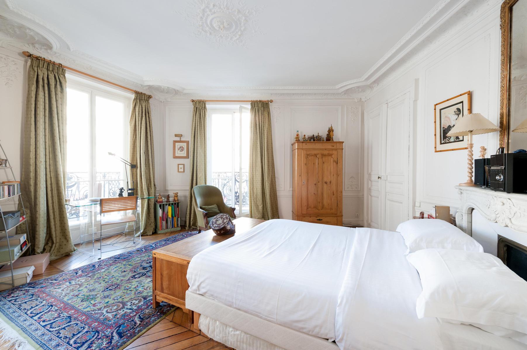 Avec ses proportions spacieuses et ses plâtres complexes, c’est l’appartement parisien dans toute sa splendeur. Mais l’Orient est là aussi, dans les tapis tissés à la main, les livres qui remplissent les étuis, les meubles en terre cuite et les boîtes à bonbons incrustés de fougères et de fleurs plumeuses. Le salon a été accroché avec des peintures à l’huile expressives, avec des sièges à la table à manger ou sur un canapé en cuir chocolaté, et il y a plus de perchoirs dans la cuisine. Les deux chambres sont doubles, avec des murs en albâtre blanc, et le maître est particulièrement agréable avec des bois miellés et deux fenêtres donnant sur le fer forgé.