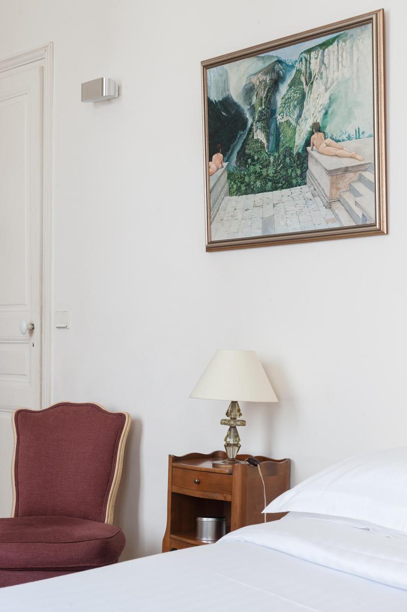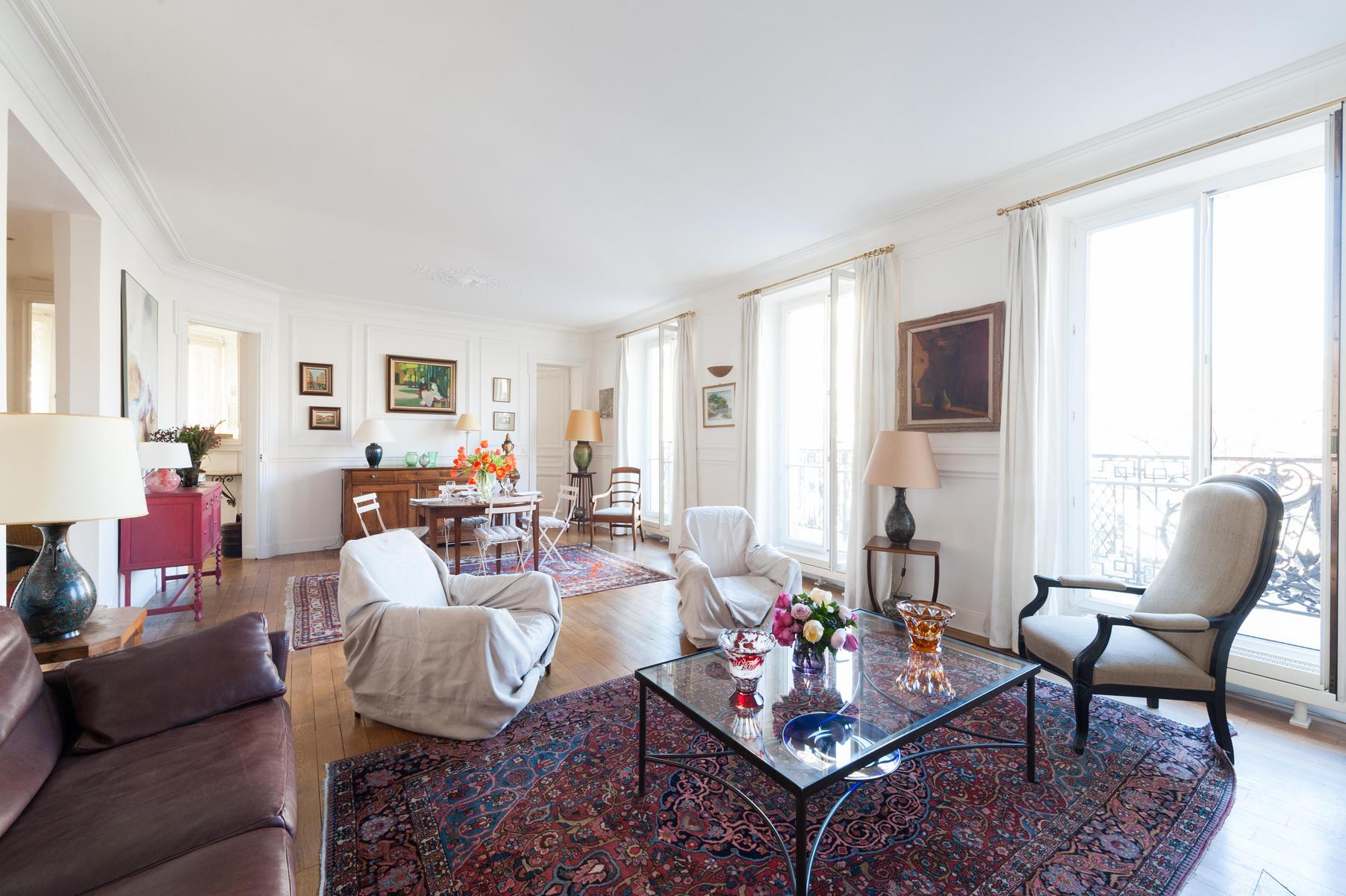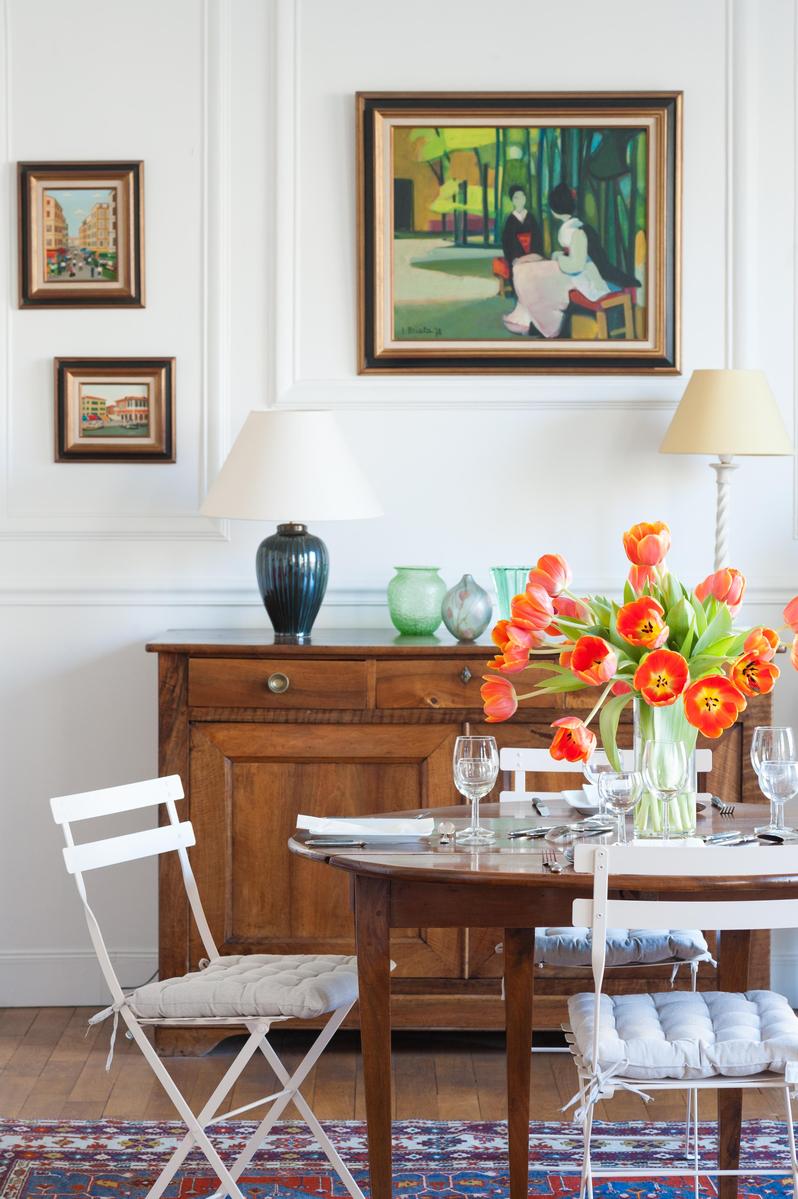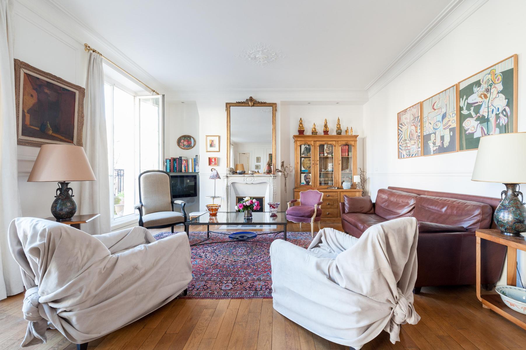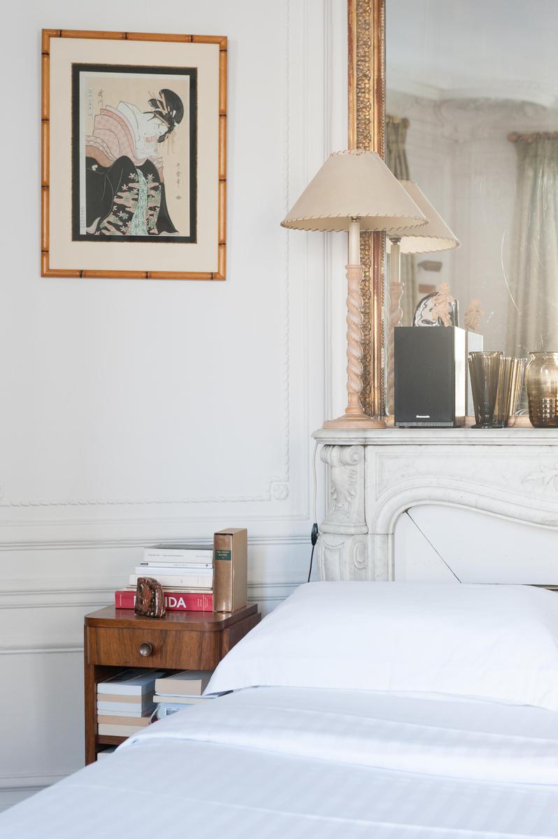 Avec ses proportions spacieuses et ses plâtres complexes, c’est l’appartement parisien dans toute sa splendeur. Mais l’Orient est là aussi, dans les tapis tissés à la main, les livres qui remplissent les étuis, les meubles en terre cuite et les boîtes à bonbons incrustés de fougères et de fleurs plumeuses. Le salon a été accroché avec des peintures à l’huile expressives, avec des sièges à la table à manger ou sur un canapé en cuir chocolaté, et il y a plus de perchoirs dans la cuisine. Les deux chambres sont doubles, avec des murs en albâtre blanc, et le maître est particulièrement agréable avec des bois miellés et deux fenêtres donnant sur le fer forgé.
