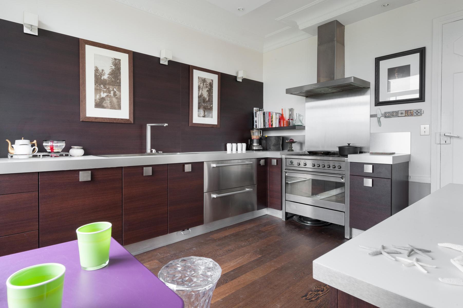 Malgré la collection de l’avenue de Suffren – le buste d’une vache égyptienne, la peinture à l’huile à cadre doré, un mystérieux tronc d’arbre à feuilles d’or – il n’y a pas d’étouffement muséal dans cette maison. Une bonne dose de design contemporain le rend dynamique et distinctif : les unités intégrées intelligentes de la cuisine, le mur orange audacieux de la salle d’eau (c’est un thème), les deux agencements lumineux et modernes de la salle à manger. Et les alentours de la Tour Eiffel ont aussi un côté énergique. Avec de nombreux magasins et restaurants animés, et la tour elle-même à quelques pas, le meilleur de Paris est votre exposition.