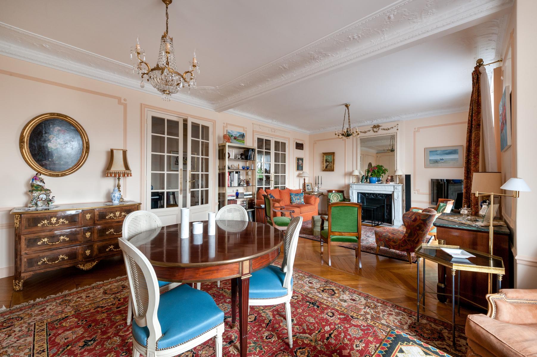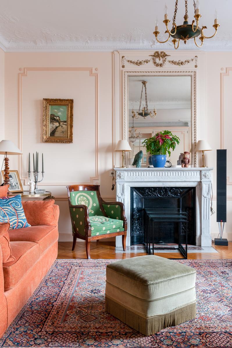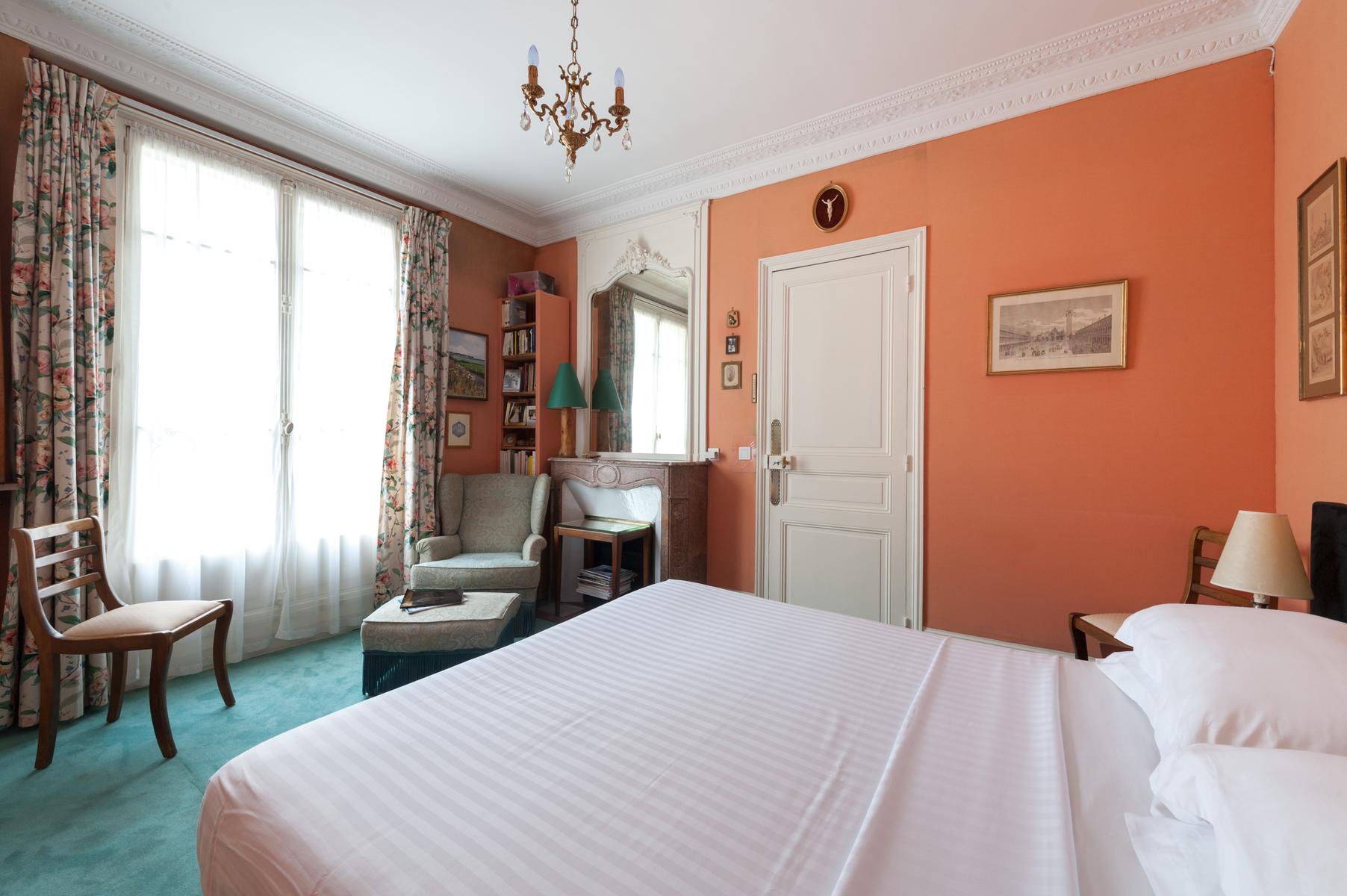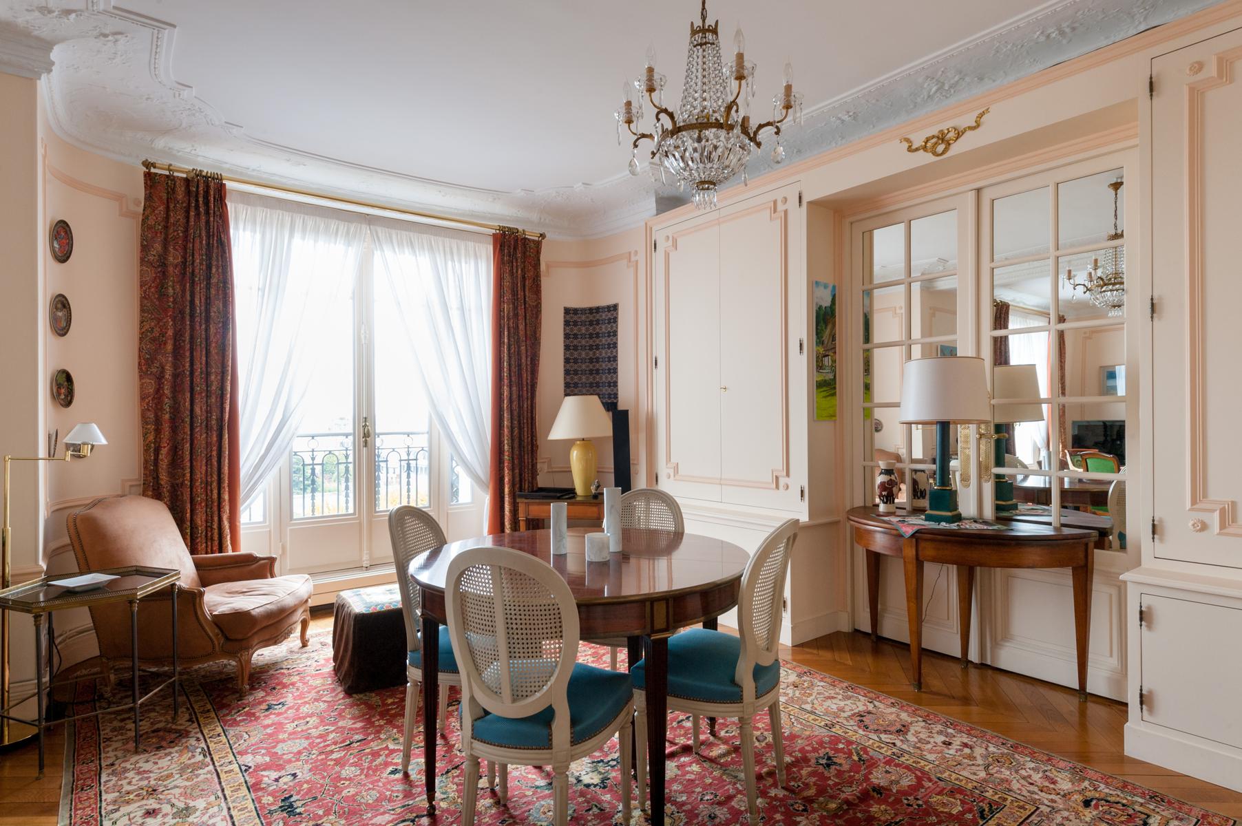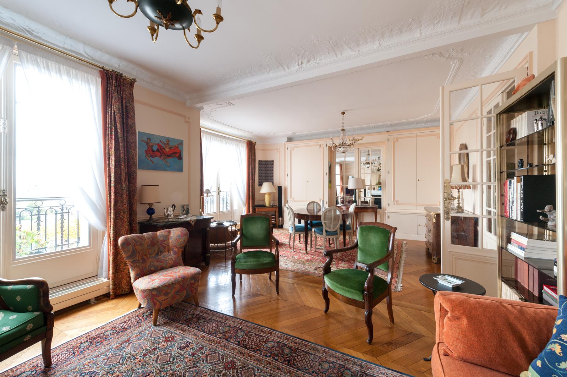 Au sixième étage d’un imposant édifice, l’avenue du Général Leclerc est ornement sculptée. Le salon est orné de planchers à chevrons et de murs moulurés, et une collection de chaises anciennes et un canapé souple sont disposés autour du foyer. Juste au-delà, la table à manger laquée se trouve sous un grand chandelier, et les fenêtres françaises offrent une vue sur la rue verdoyante. Alésia est un endroit tranquille, avec des marchés quotidiens à la rue Daguerre et de nombreux parcs à proximité. La seule entrée publique aux Catacombes se trouve aussi à quelques pas de la porte.