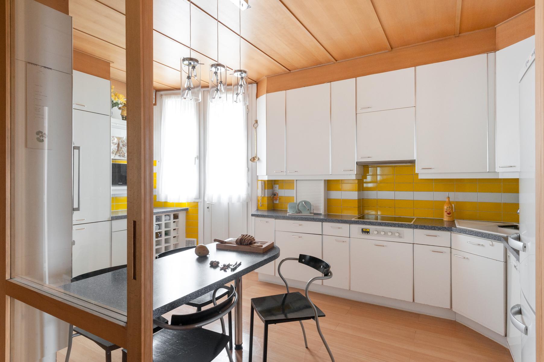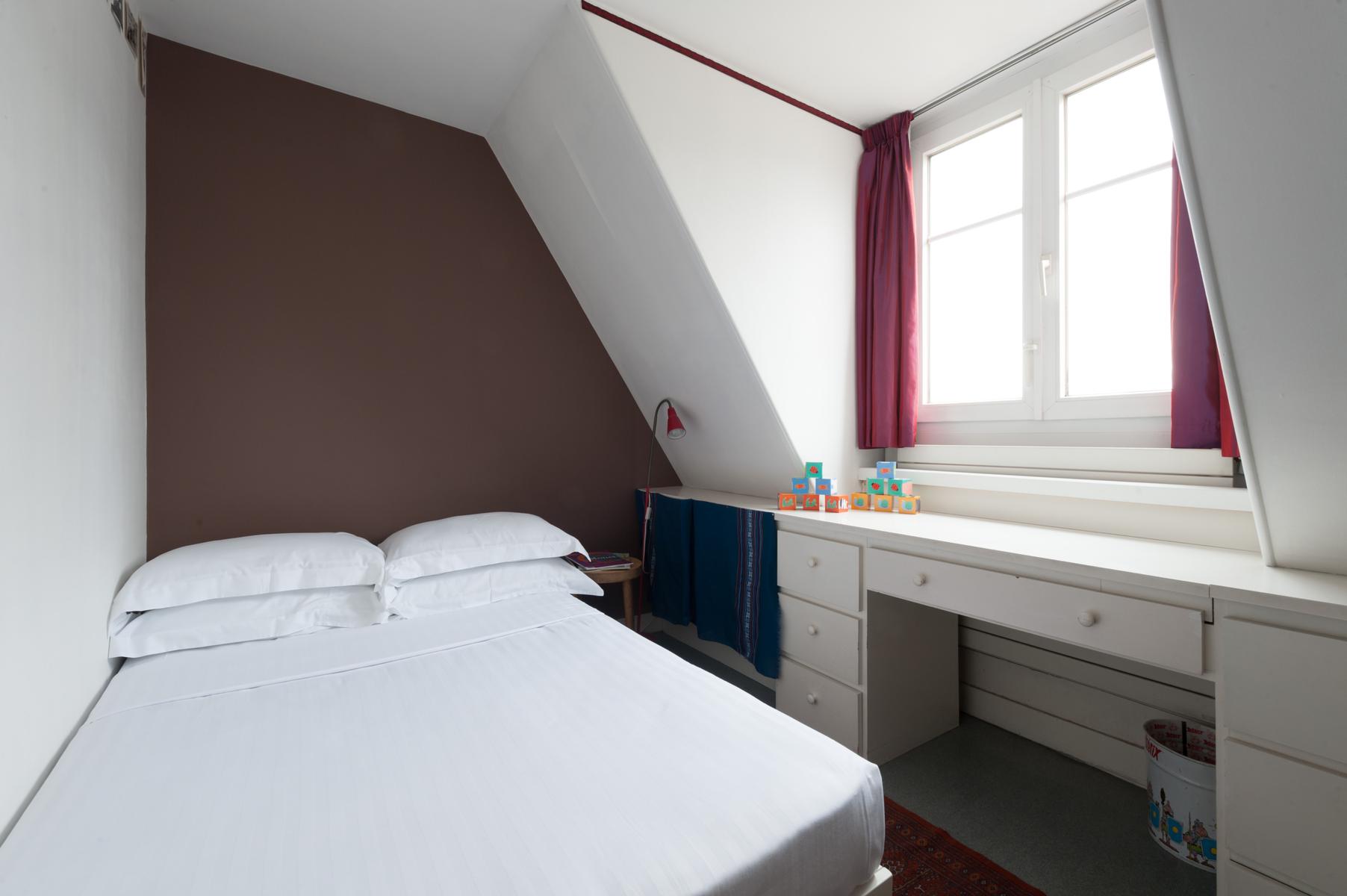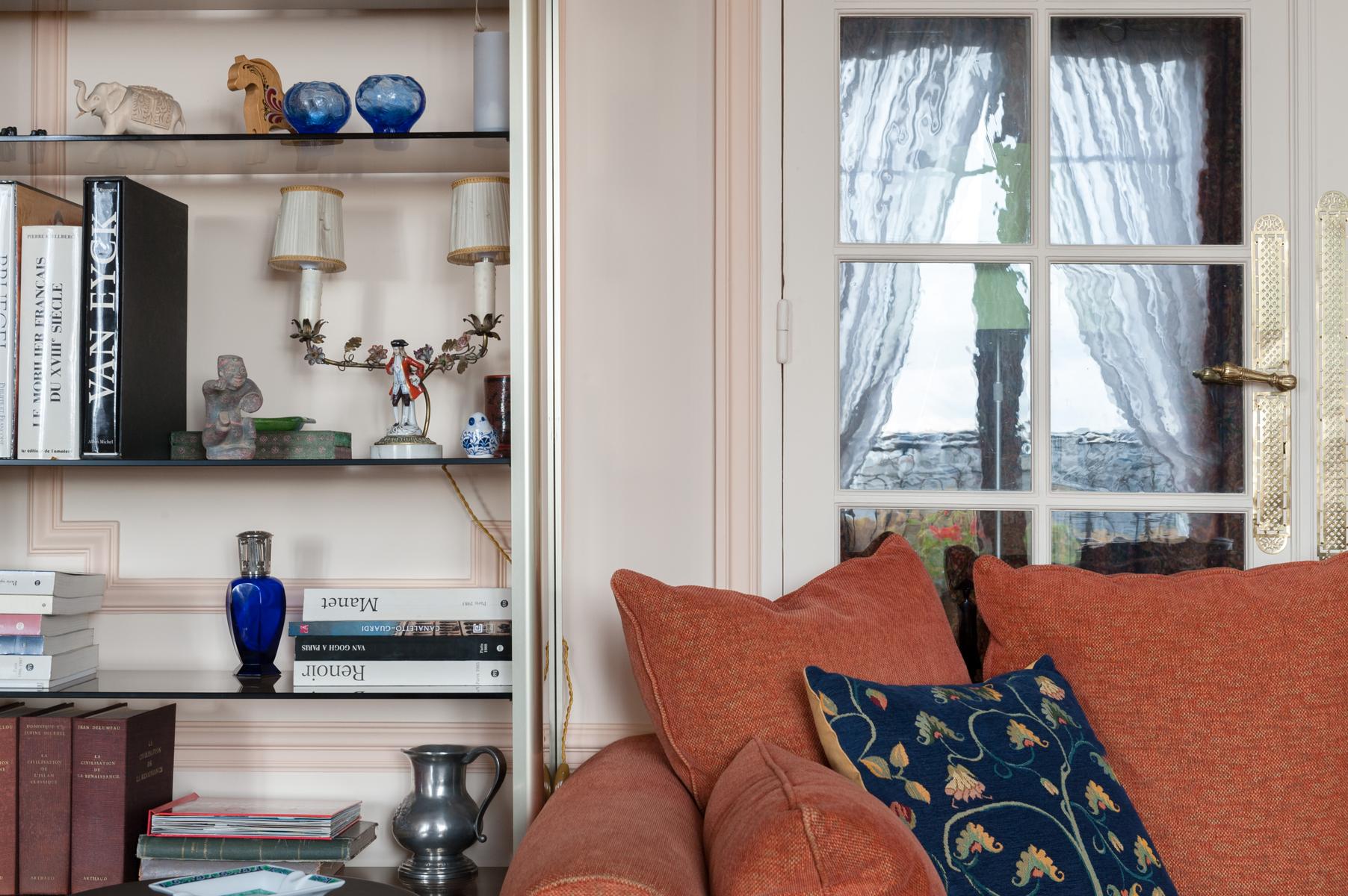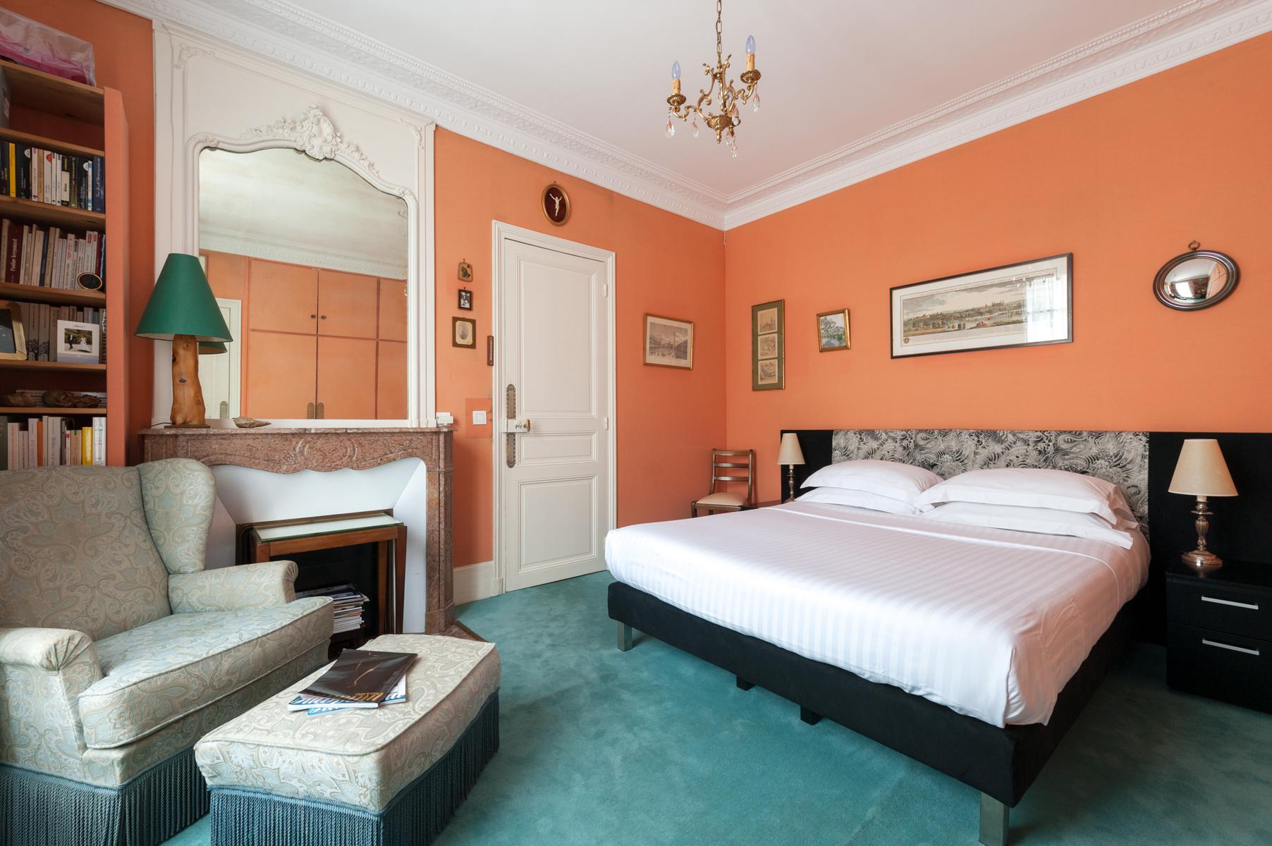 Au sixième étage d’un imposant édifice, l’avenue du Général Leclerc est ornement sculptée. Le salon est orné de planchers à chevrons et de murs moulurés, et une collection de chaises anciennes et un canapé souple sont disposés autour du foyer. Juste au-delà, la table à manger laquée se trouve sous un grand chandelier, et les fenêtres françaises offrent une vue sur la rue verdoyante. Alésia est un endroit tranquille, avec des marchés quotidiens à la rue Daguerre et de nombreux parcs à proximité. La seule entrée publique aux Catacombes se trouve aussi à quelques pas de la porte.