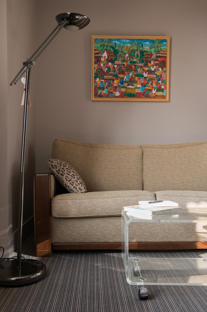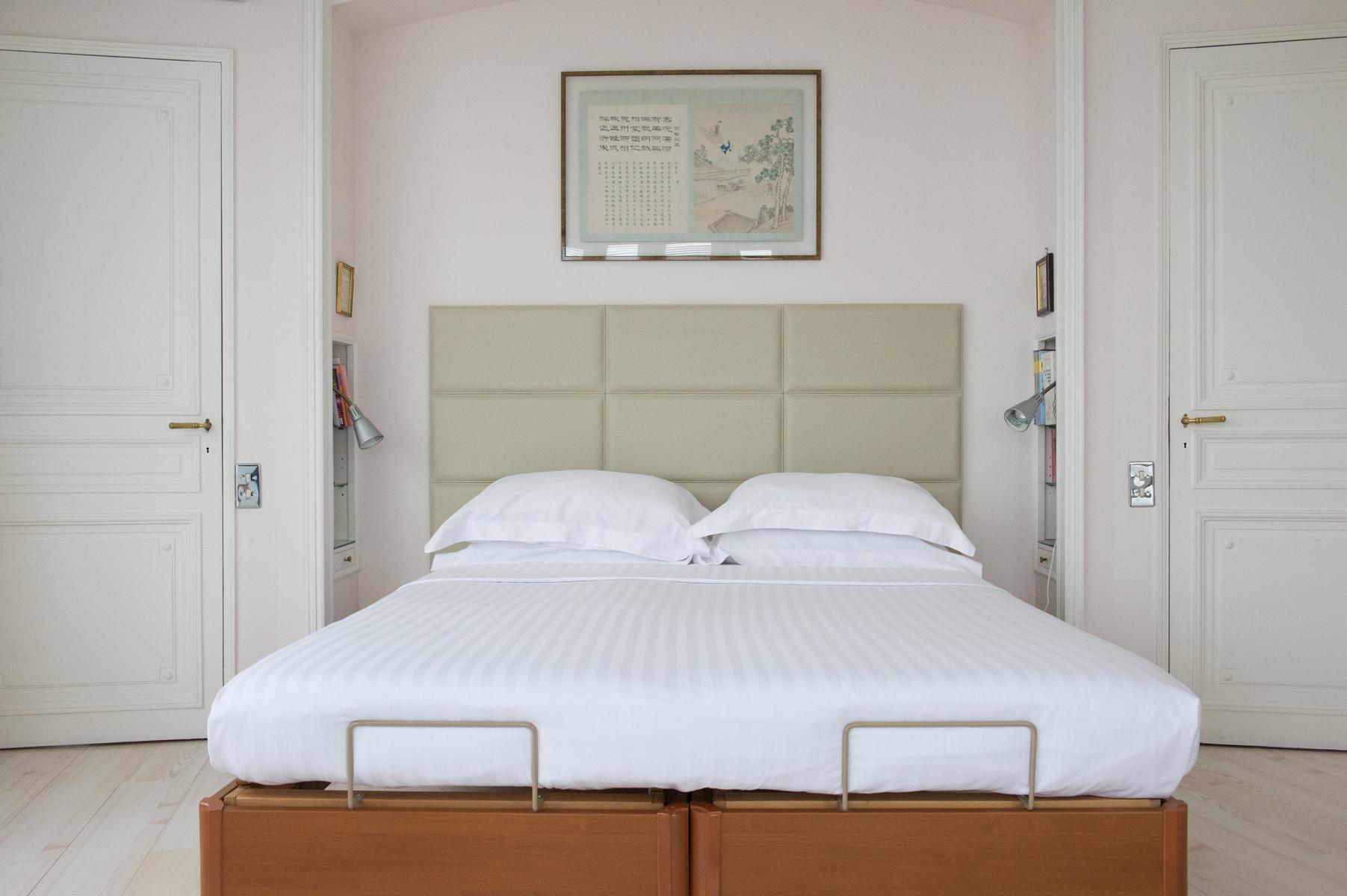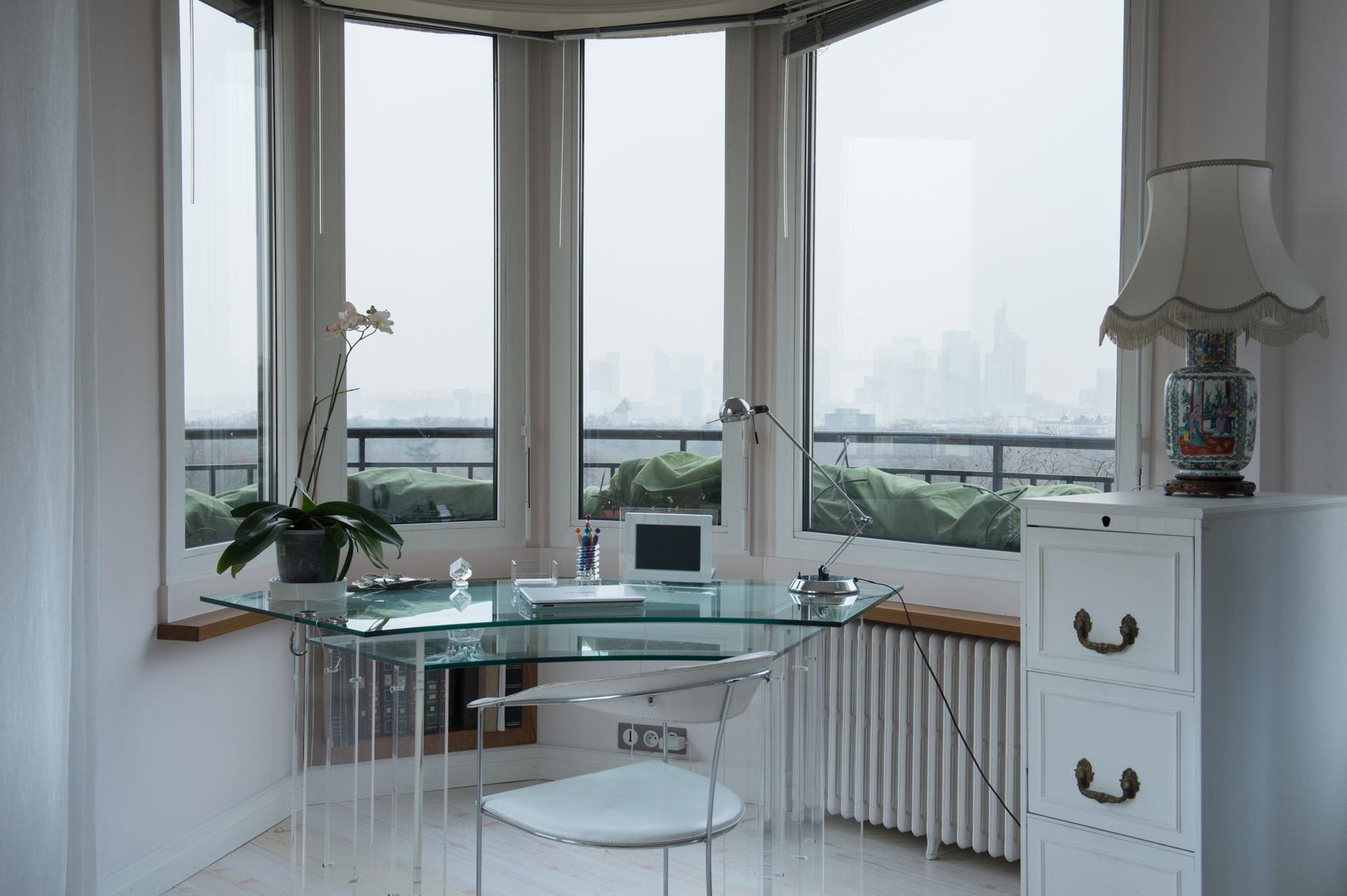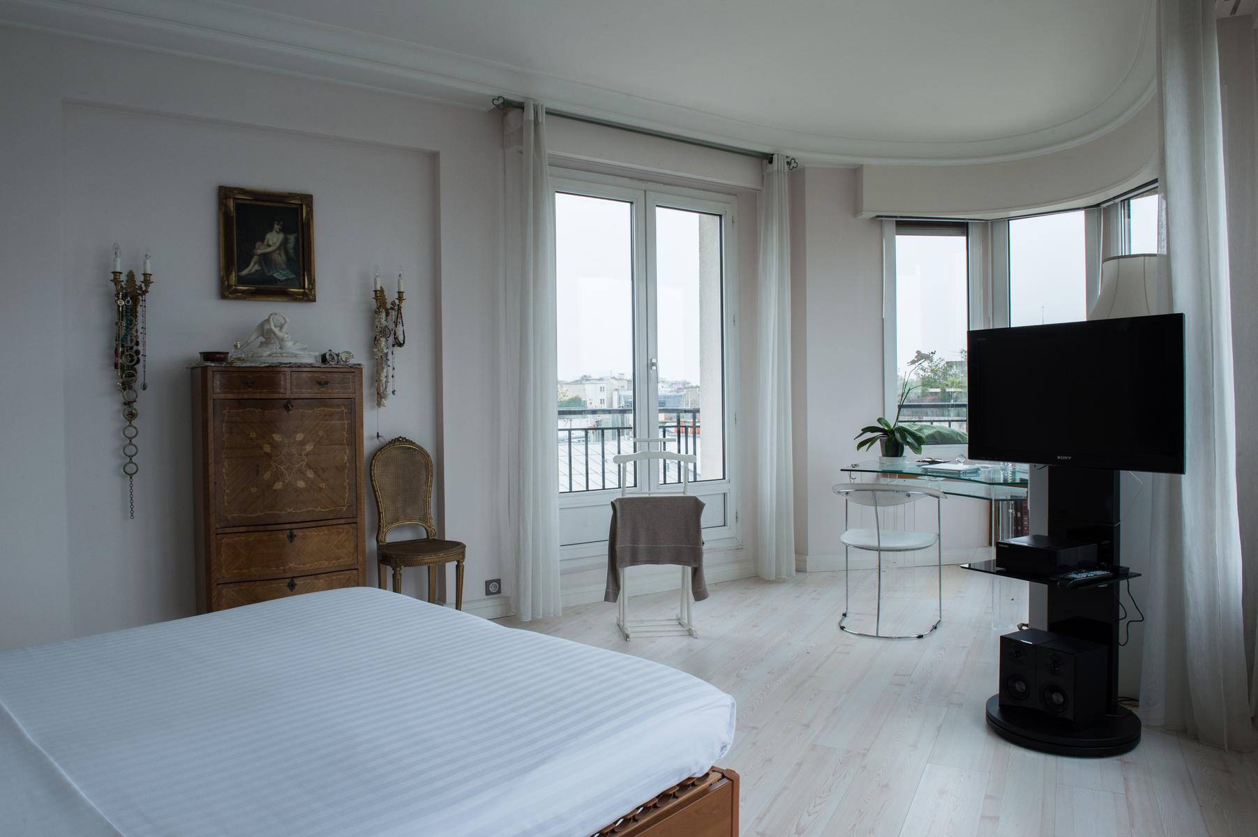 Tout droit devant le couloir se trouve un autre salon, plus moderne avec un canapé-lit et une table en plexiglas. Cette pièce mène au dressing et à la salle de bains, et enfin à la chambre des maîtres. Le lit double est placé dans une alcôve et fait face à des fenêtres sur trois côtés – la chambre se rétrécit jusqu’à un point de vue panoramique.