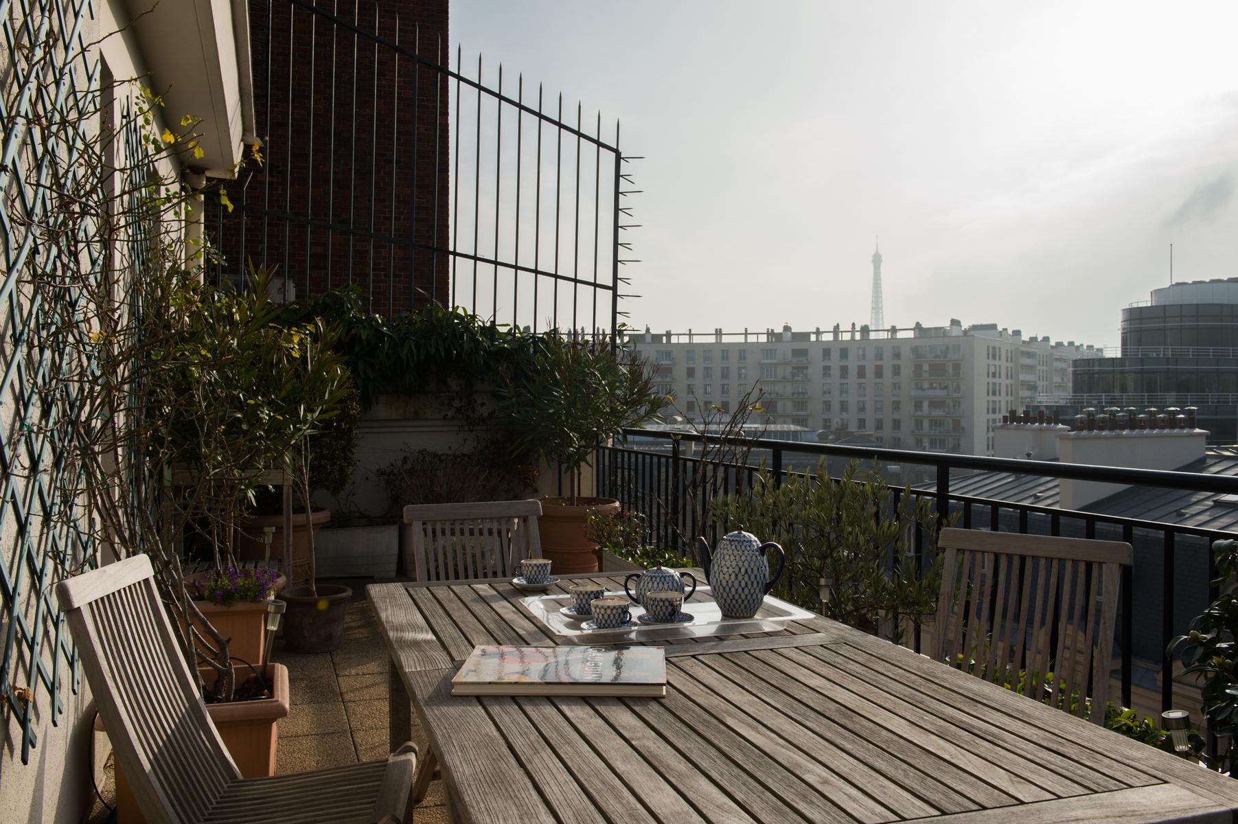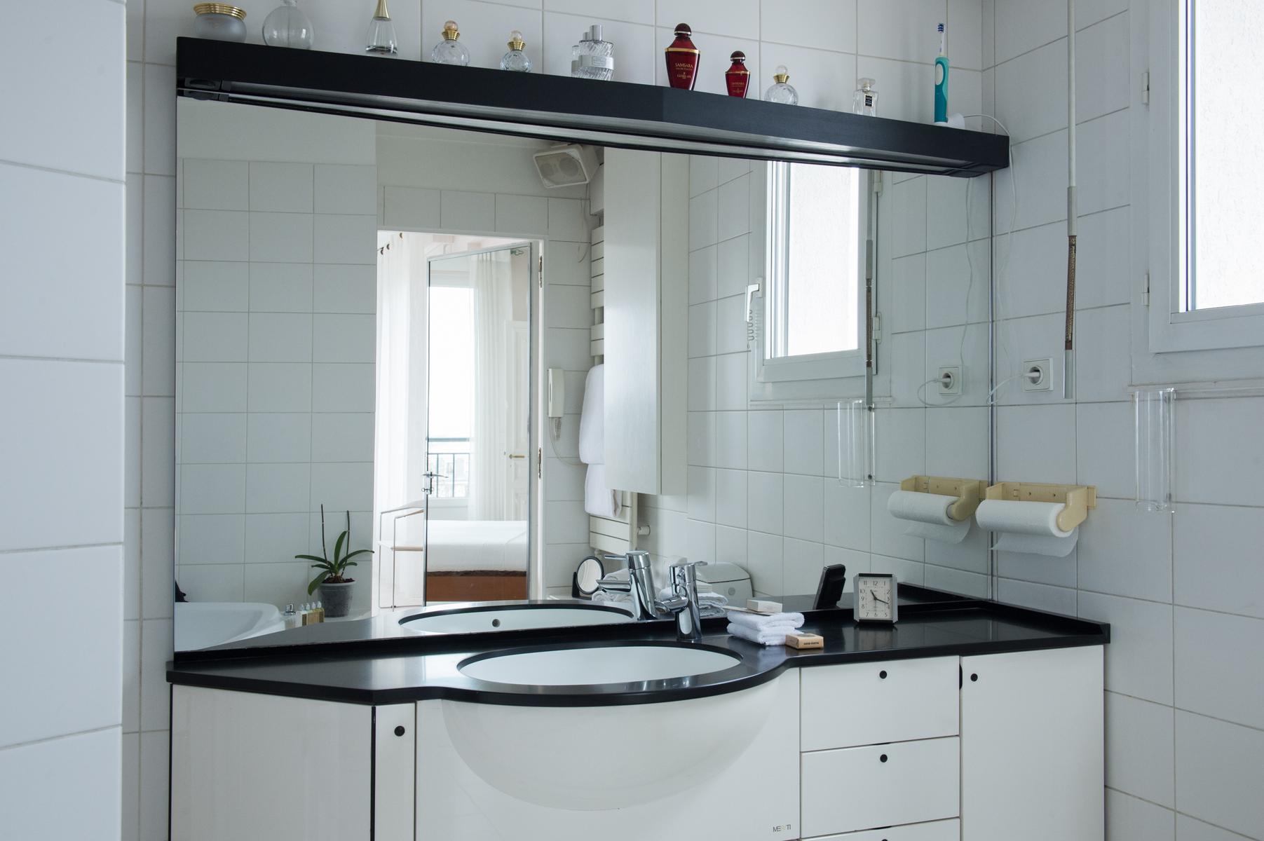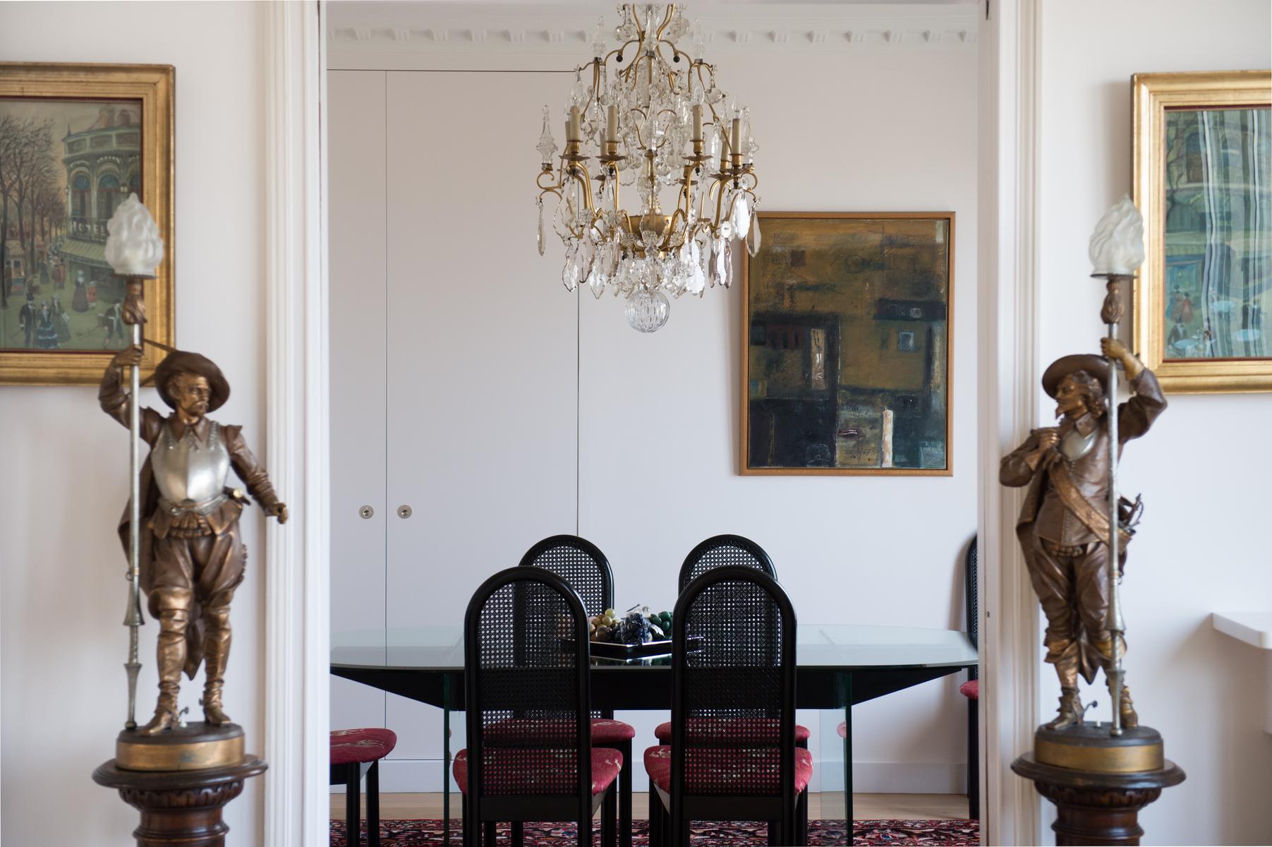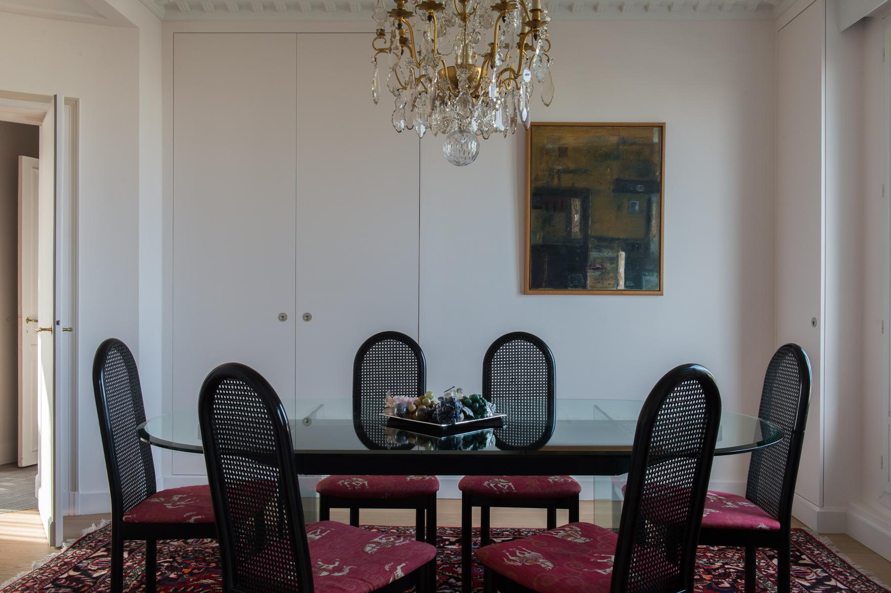 Seul appartement au septième et plus haut étage de l’immeuble, l’avenue Foch dispose d’une terrasse enveloppante conçue pour profiter pleinement de la vue. A droite du hall d’entrée se trouve le salon, où un charioteer est coulé en bronze sur la cheminée ornementale, entre les chaises anciennes. Cette pièce mène à la salle à manger éclairée par un lustre avec sa table en verre pour six personnes. Il y a aussi une petite table de petit déjeuner dans la cuisine, à gauche de l'entrée.