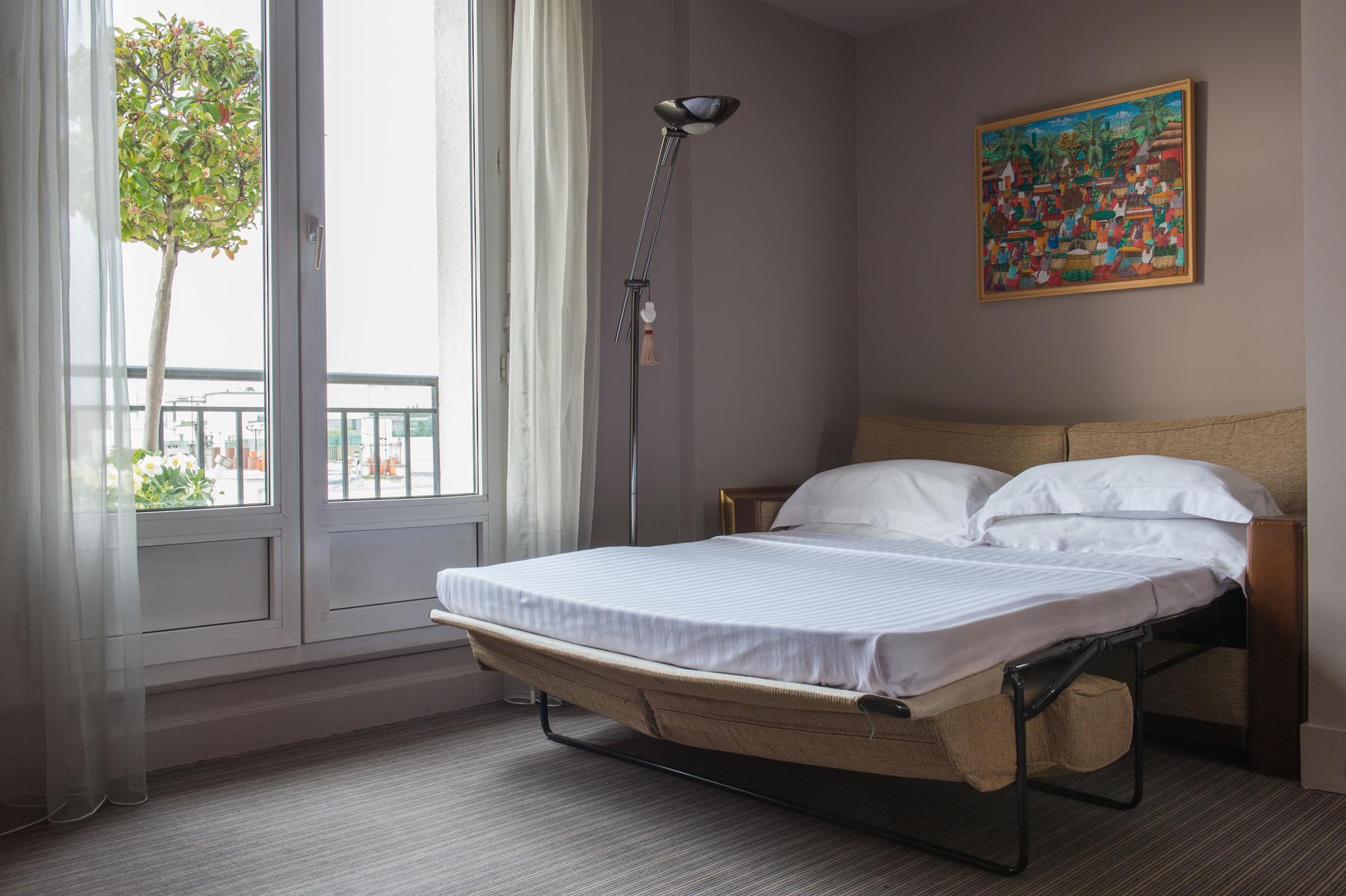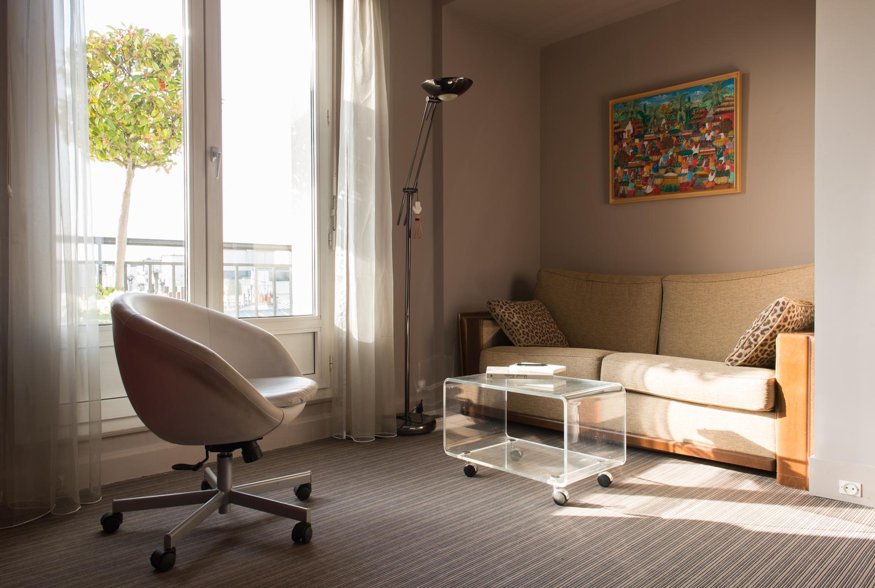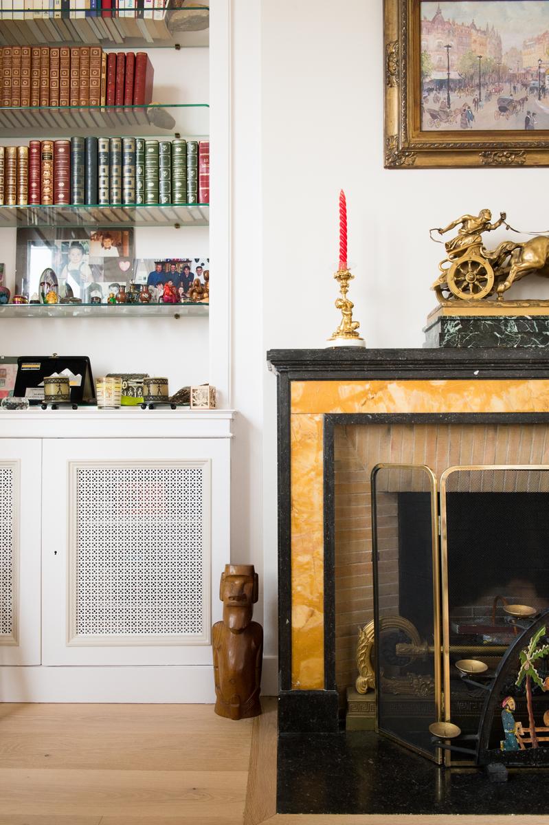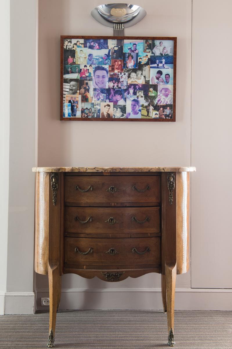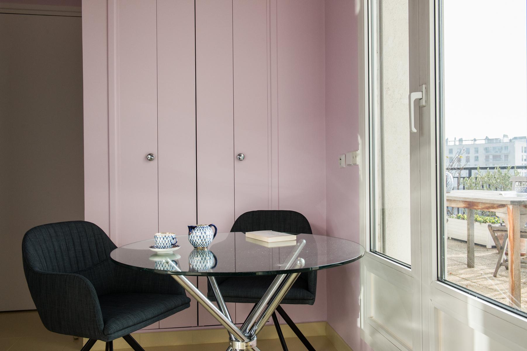 Seul appartement au septième et plus haut étage de l’immeuble, l’avenue Foch dispose d’une terrasse enveloppante conçue pour profiter pleinement de la vue. A droite du hall d’entrée se trouve le salon, où un charioteer est coulé en bronze sur la cheminée ornementale, entre les chaises anciennes. Cette pièce mène à la salle à manger éclairée par un lustre avec sa table en verre pour six personnes. Il y a aussi une petite table de petit déjeuner dans la cuisine, à gauche de l'entrée.
