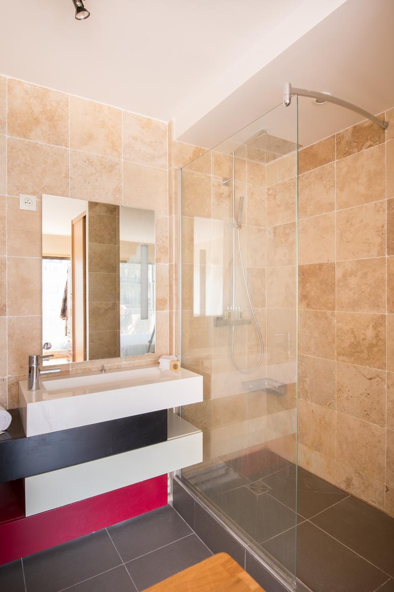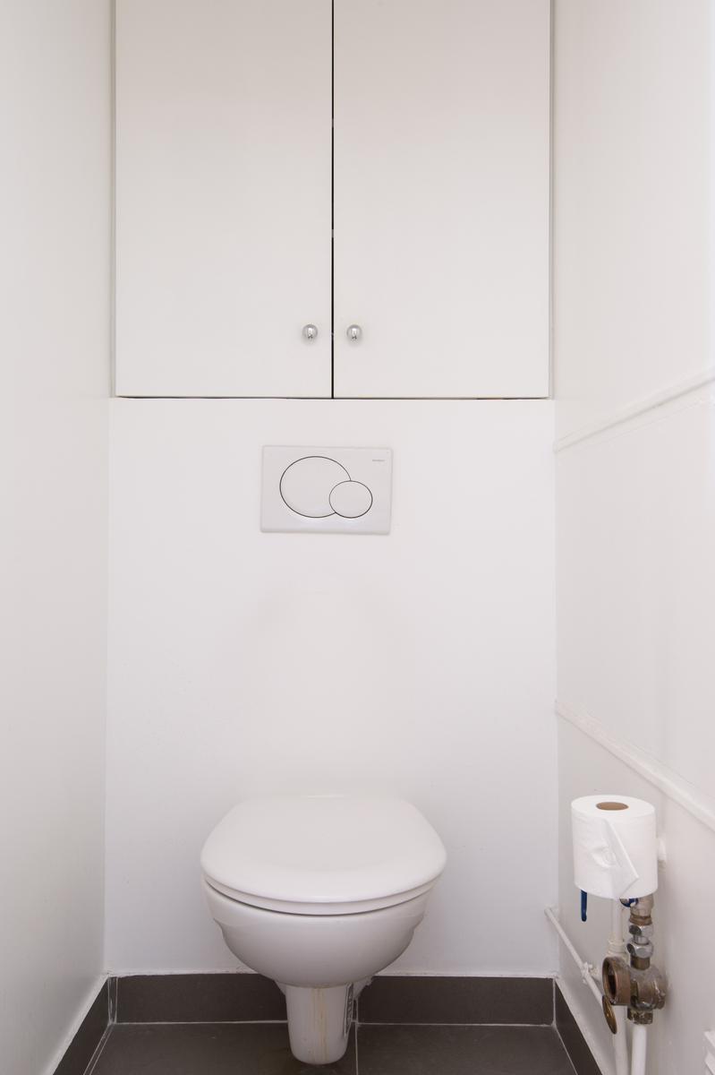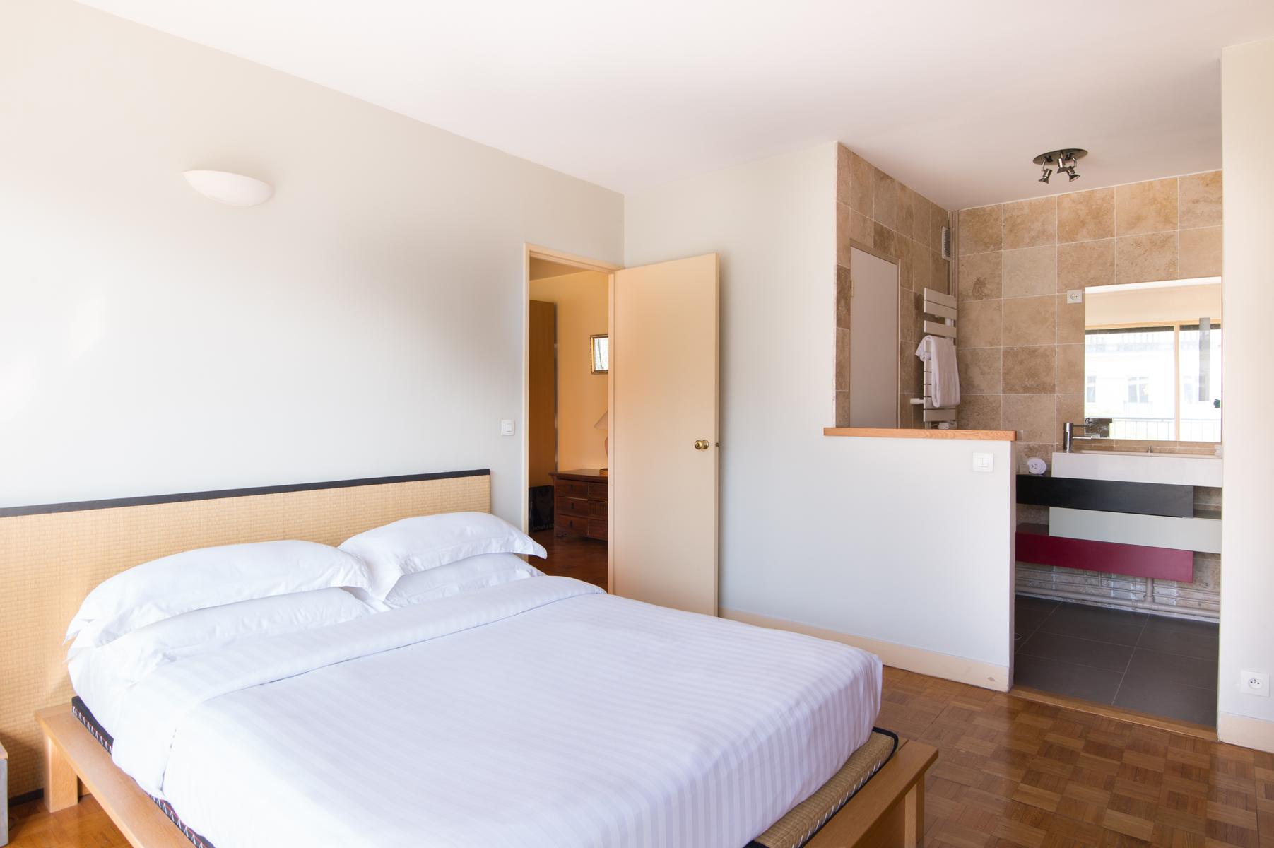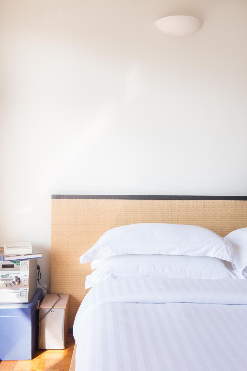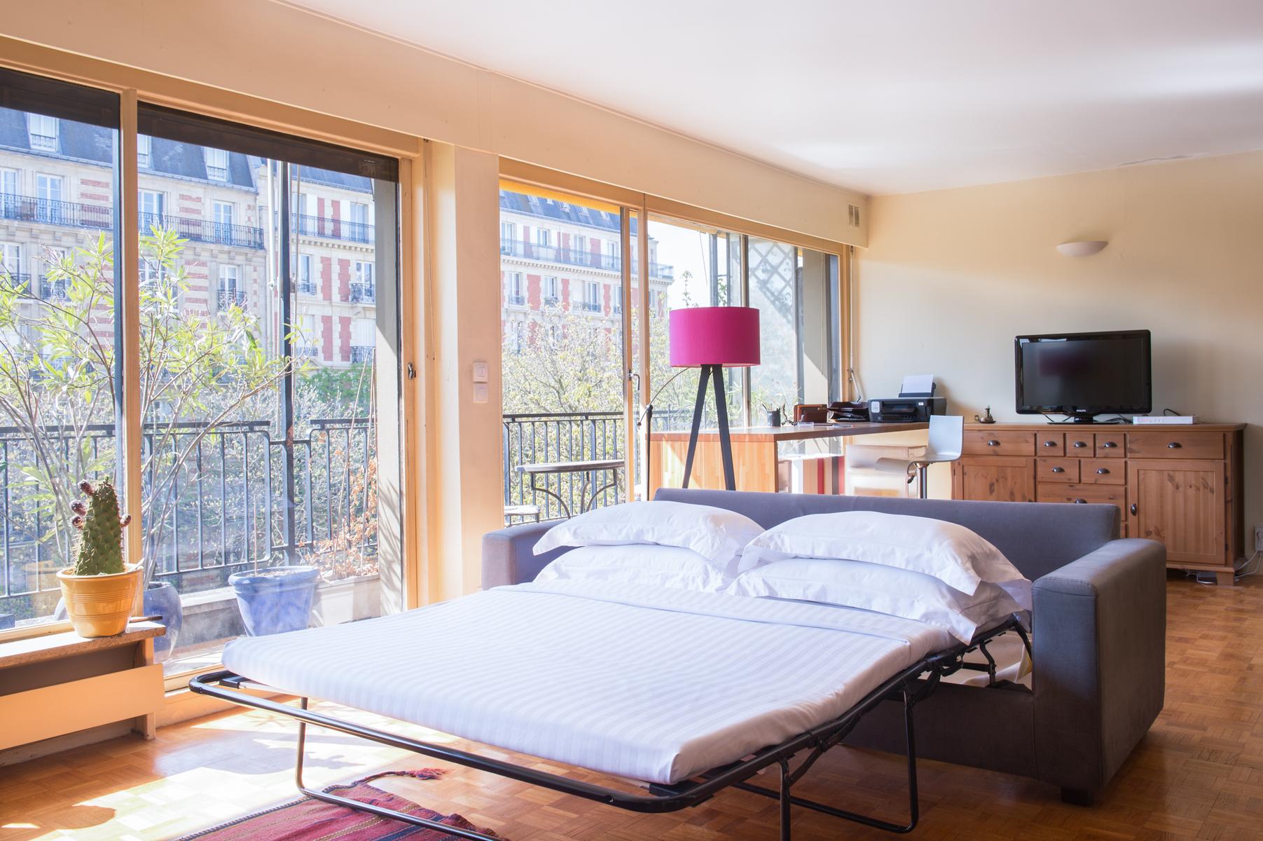 Il y a deux canapés sur le côté gauche (un qui se transforme en lit double) et un bureau à l’autre extrémité de la chambre, avec vue sur le boulevard. La cuisine soignée se trouve dans le coin droit de la pièce, ou, tournez à gauche pour atteindre la chambre des maîtres. Ici, l’accès à la douche est libre, tandis que la salle de toilette est séparée. Les murs sont blancs et une porte s’ouvre directement sur le balcon.