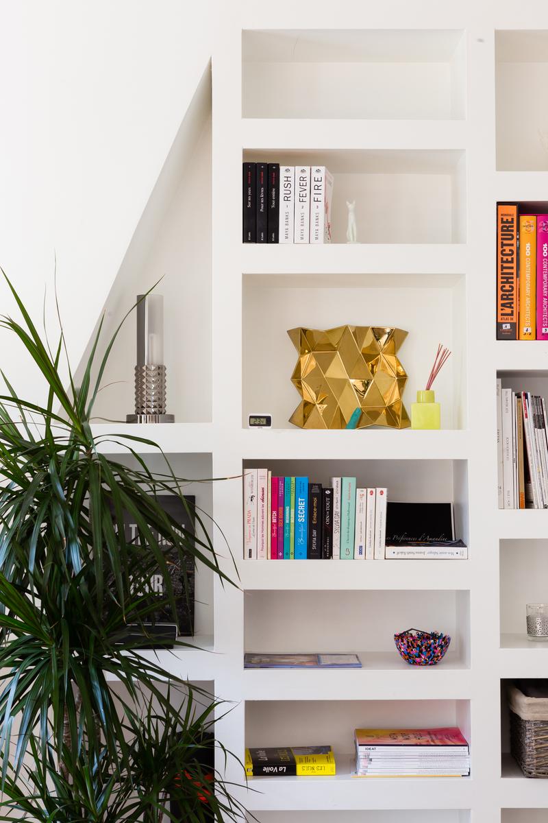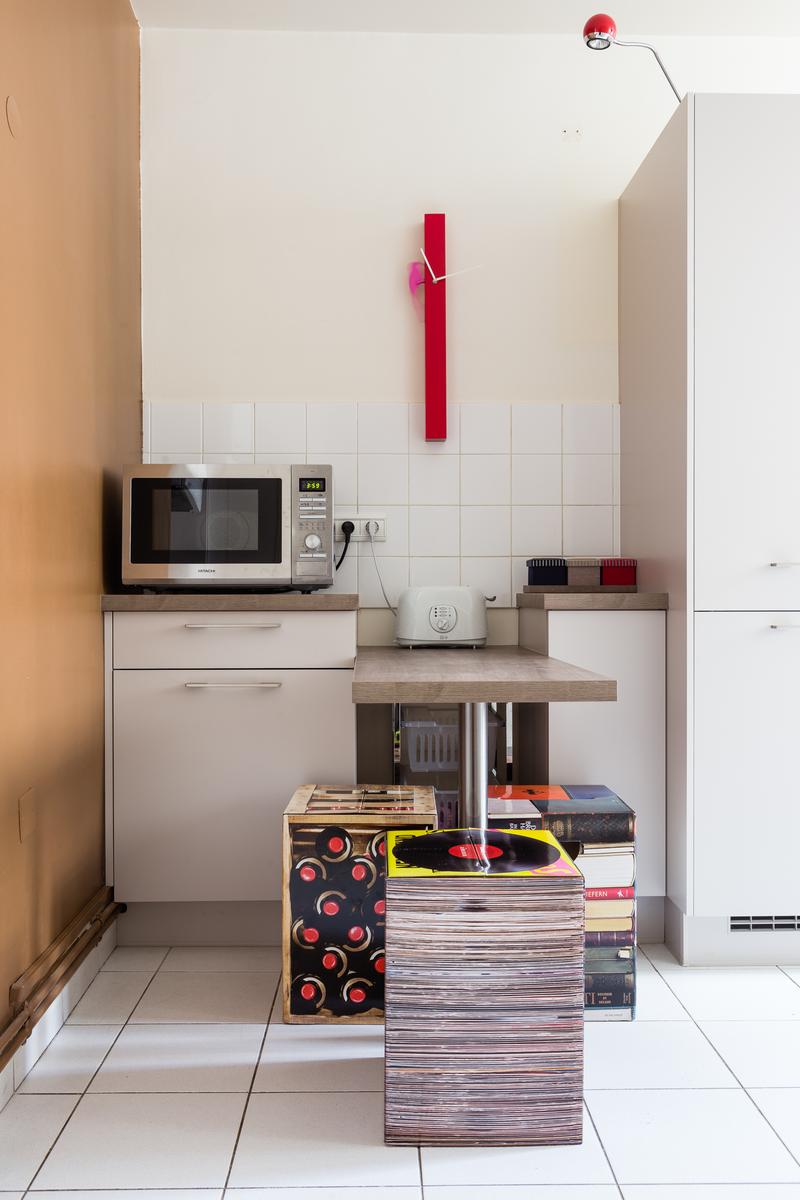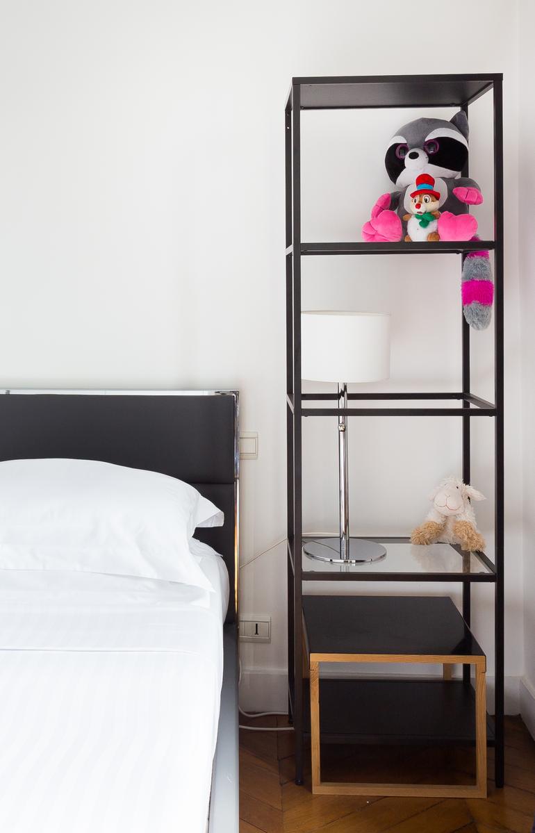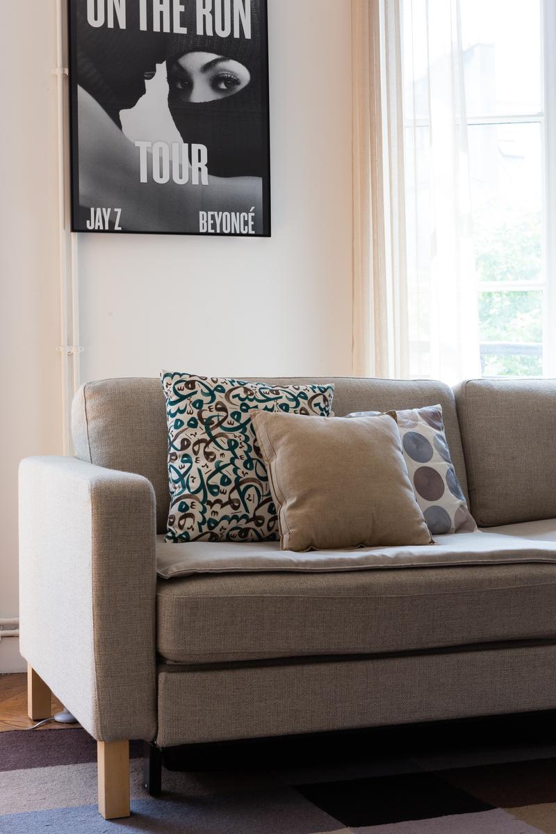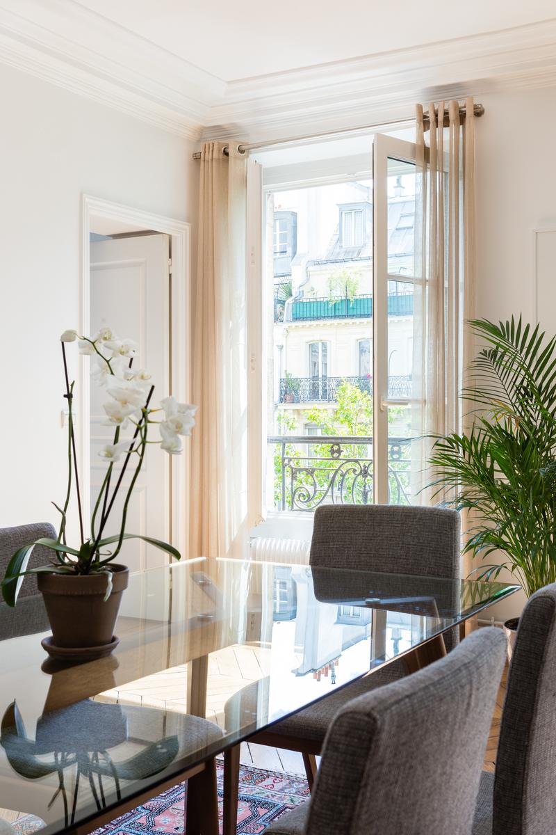 Une rue classique du Marais, où de grands arbres ombragent des boutiques et des cafés animés, mène à cette maison. Vous entrez au quatrième étage, dans un couloir. A droite, vous trouverez une salle de toilette et la cuisine, son bar à déjeuner entouré de tabourets imprimés. A gauche, il y a une salle de bain et la deuxième chambre à coucher, qui est simplement meublée et sereine.