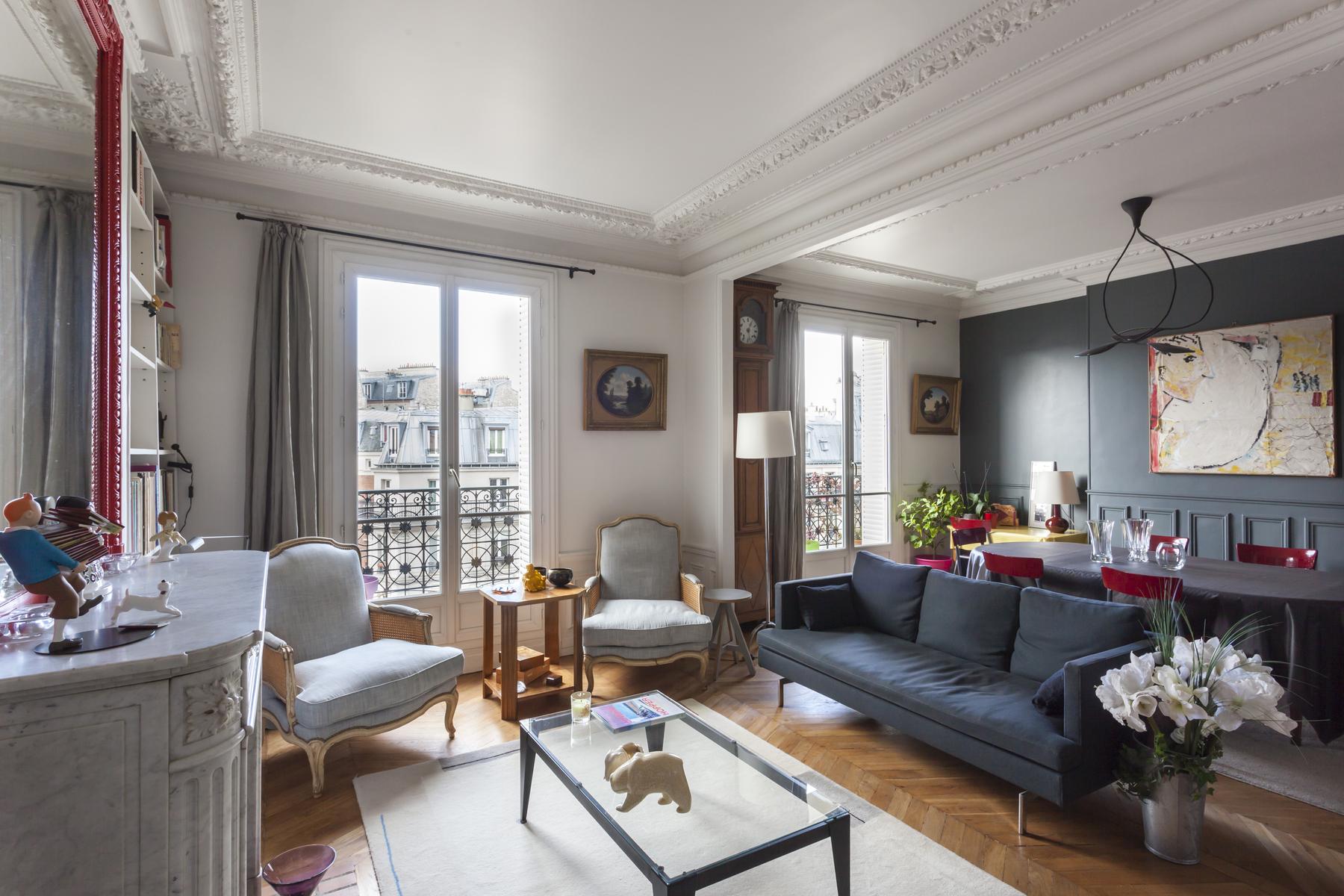 De retour dans le hall d’entrée, le salon est droit devant. D’un côté, il y a un coin salon bordé de livres, où un canapé et plusieurs fauteuils anciens s’assoient autour d’une table basse en verre et métal. Au-delà, sous une œuvre d’art moderne, il y a une table à manger avec des chaises rouges. Il y a aussi un balcon avec vue sur le Sacré-Coeur. Et puis, à côté, il y a la chambre des maîtres verte, qui a un lit queen-size et une salle de bain avec baignoire et douche.