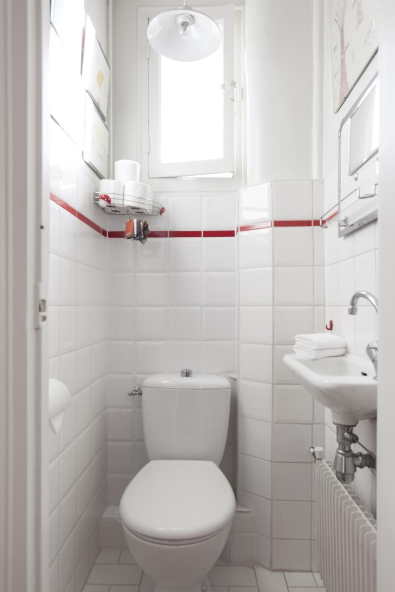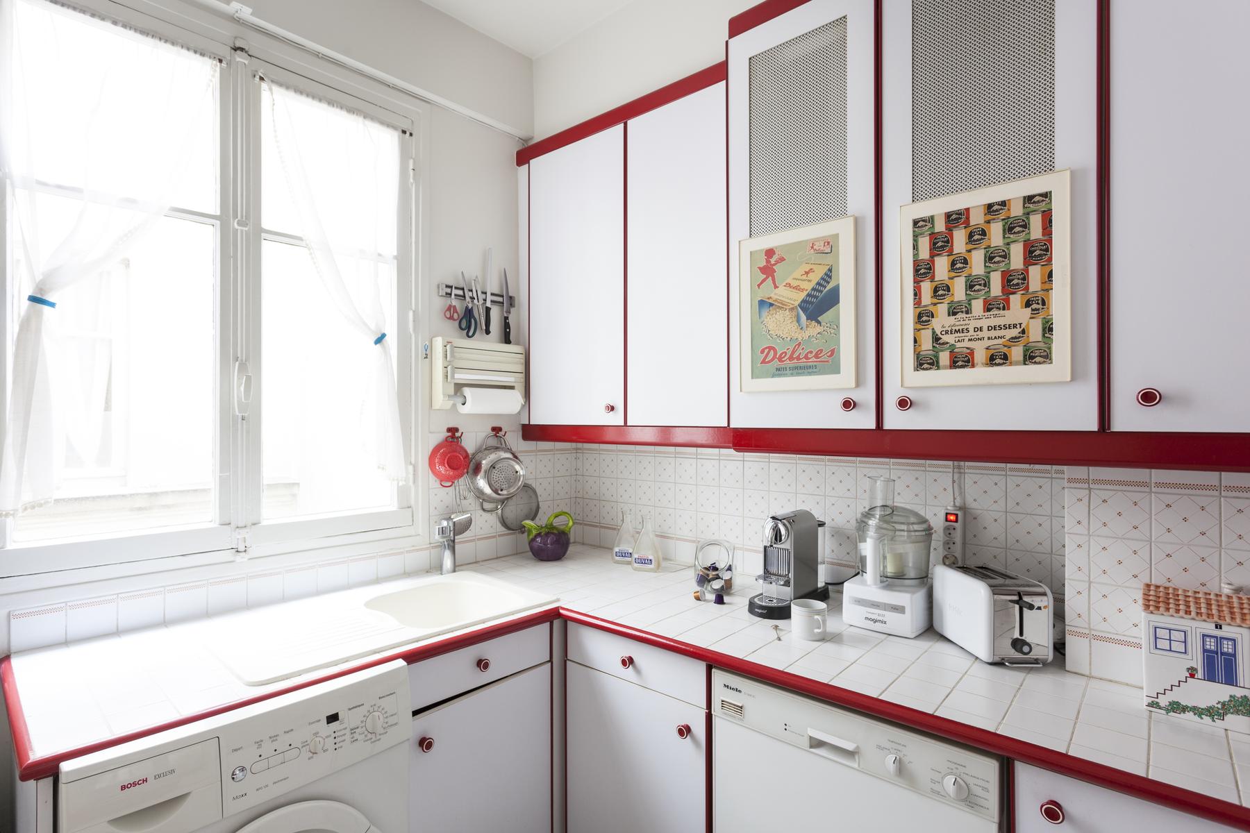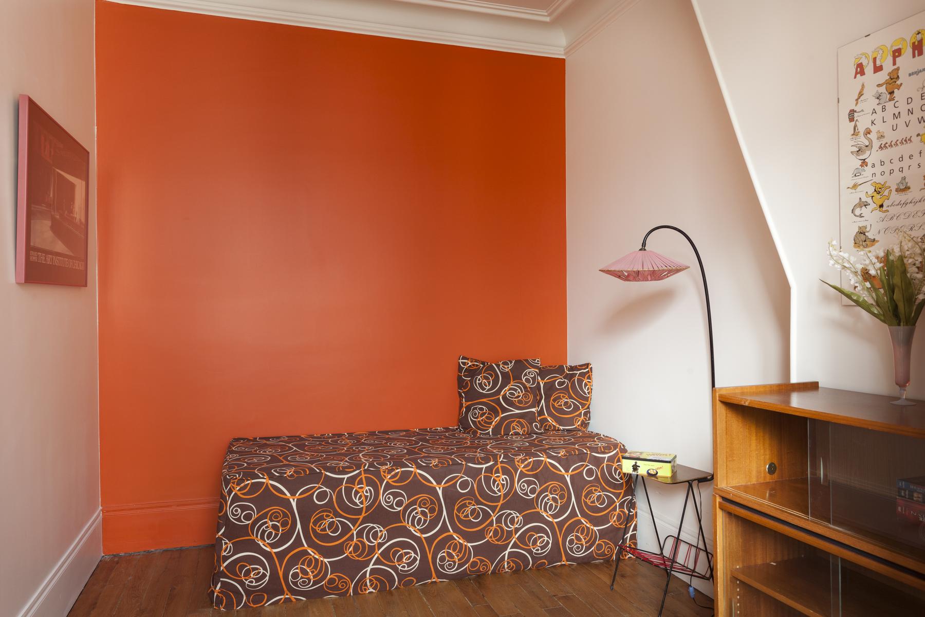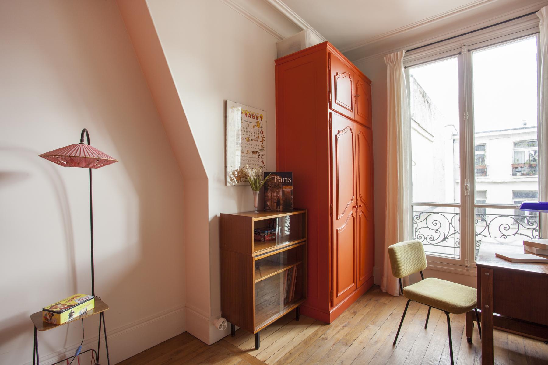 Boulevard Ornano a plus qu’un soupçon d’énergie de Montmartre – l’énergie de Pigalle Sud. La porte d’entrée (au cinquième étage) s’ouvre sur un couloir, où vous trouverez un passage juste à droite. Cela mène d’abord à la cuisine – une pièce rétro décorée en rouge et blanc – puis à une salle de toilette et à la deuxième chambre à coucher orange-orange, qui a un petit bureau et un lit simple (avec trundle).