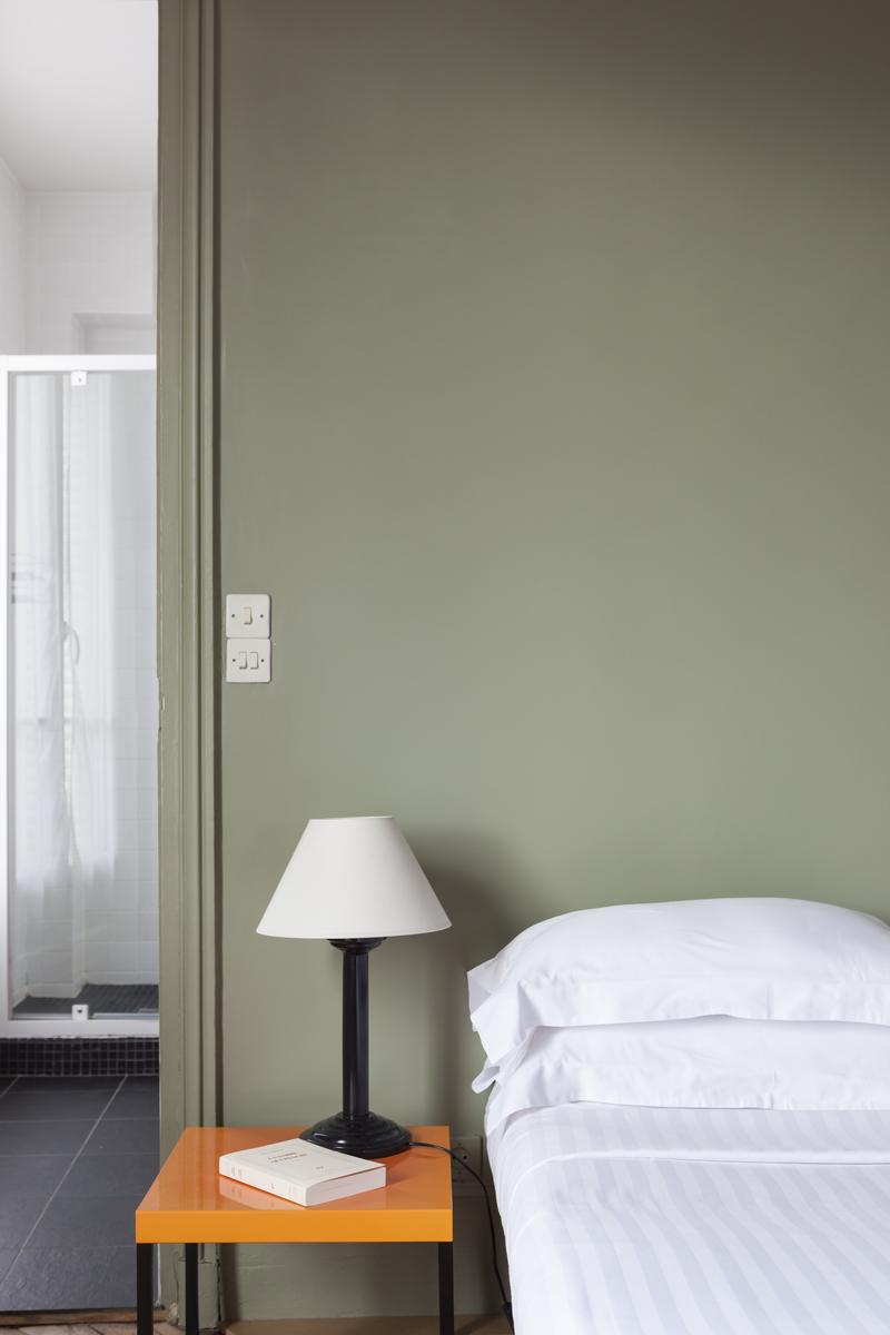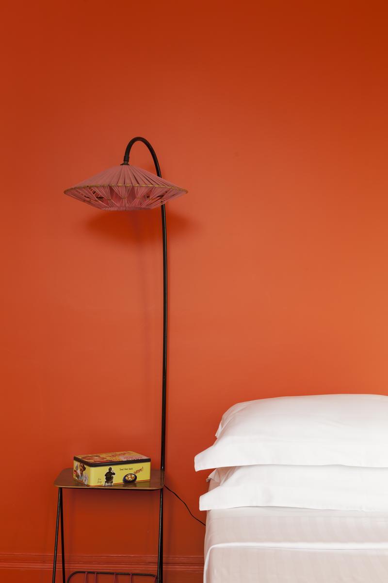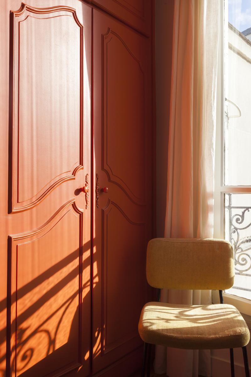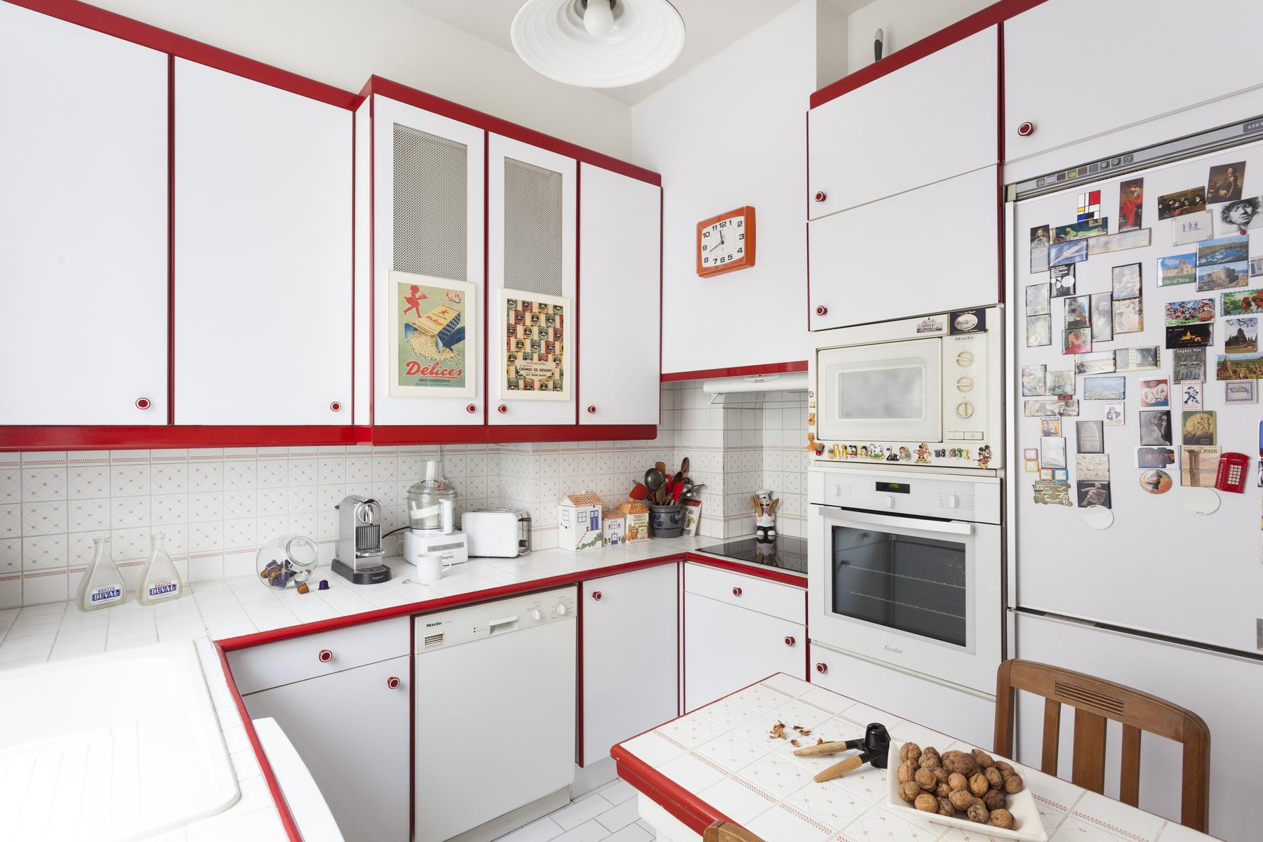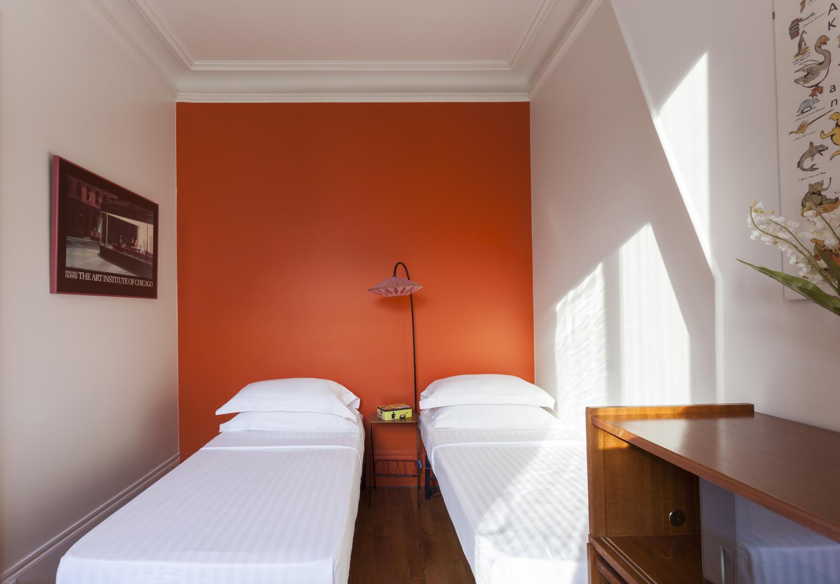 Boulevard Ornano a plus qu’un soupçon d’énergie de Montmartre – l’énergie de Pigalle Sud. La porte d’entrée (au cinquième étage) s’ouvre sur un couloir, où vous trouverez un passage juste à droite. Cela mène d’abord à la cuisine – une pièce rétro décorée en rouge et blanc – puis à une salle de toilette et à la deuxième chambre à coucher orange-orange, qui a un petit bureau et un lit simple (avec trundle).