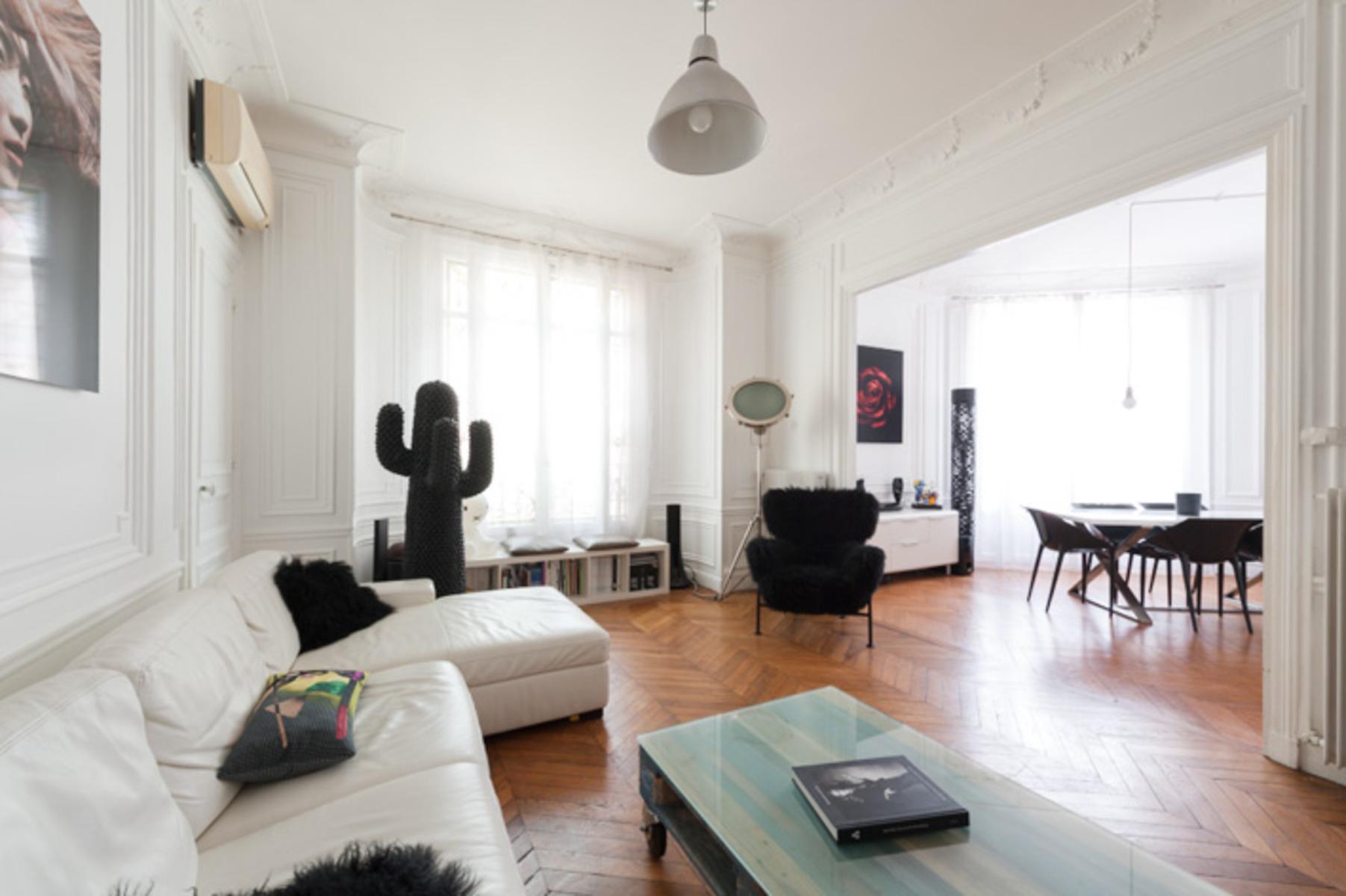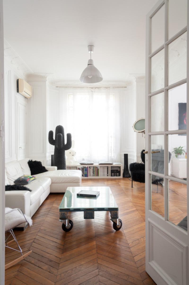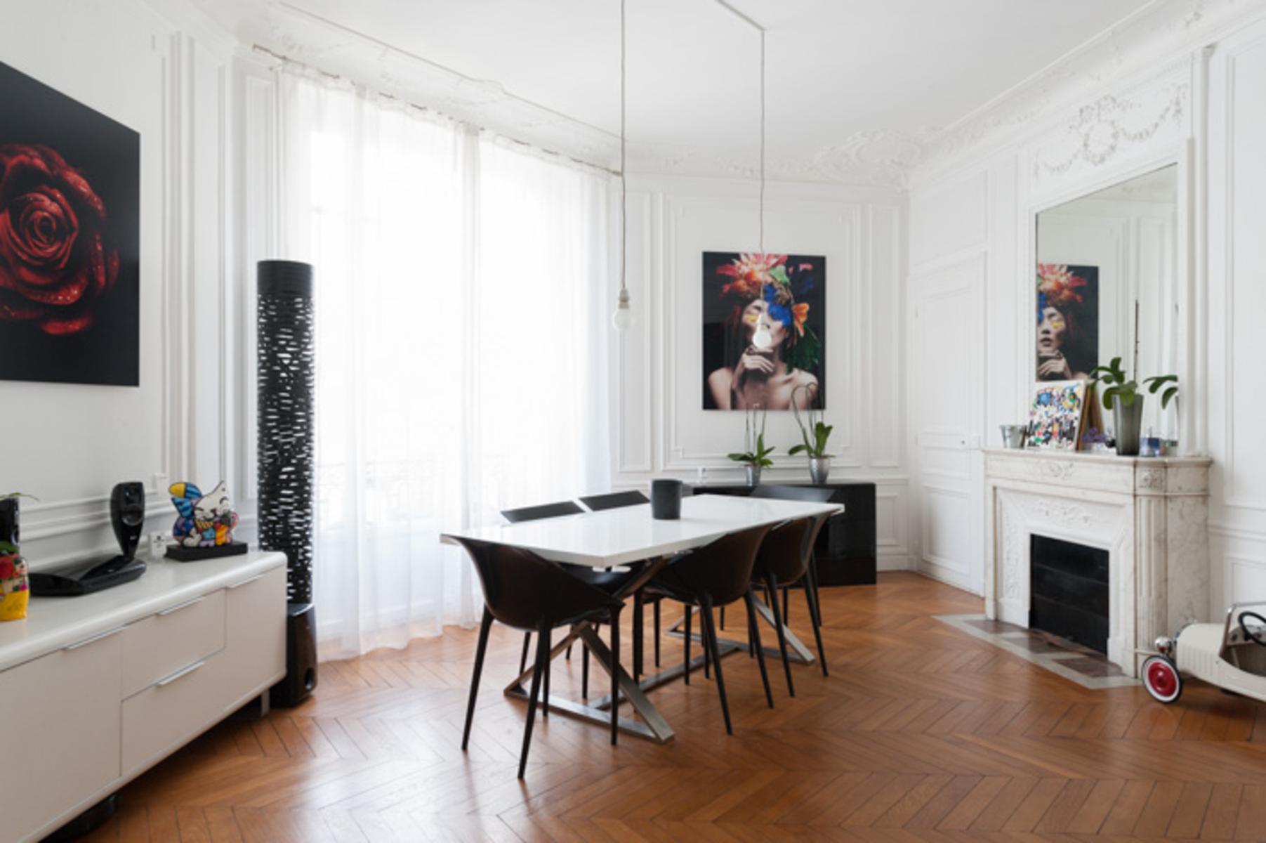 En flânant dans les brasseries et les boutiques du centre-ville de Saint-Germain-des-Prés, vous découvrirez cette maison du deuxième étage en retrait d’un boulevard classique. À l’intérieur, le salon et la salle à manger sont tout droit devant. Les plafonds en cornique et les parquets de cette chambre sont un charmant contrepoint à son ameublement kooky. Il y a un long canapé en cuir, un fauteuil en fourrure et une lampe de studio dans le coin salon, et une table blanche angulaire dans la salle à manger en face.