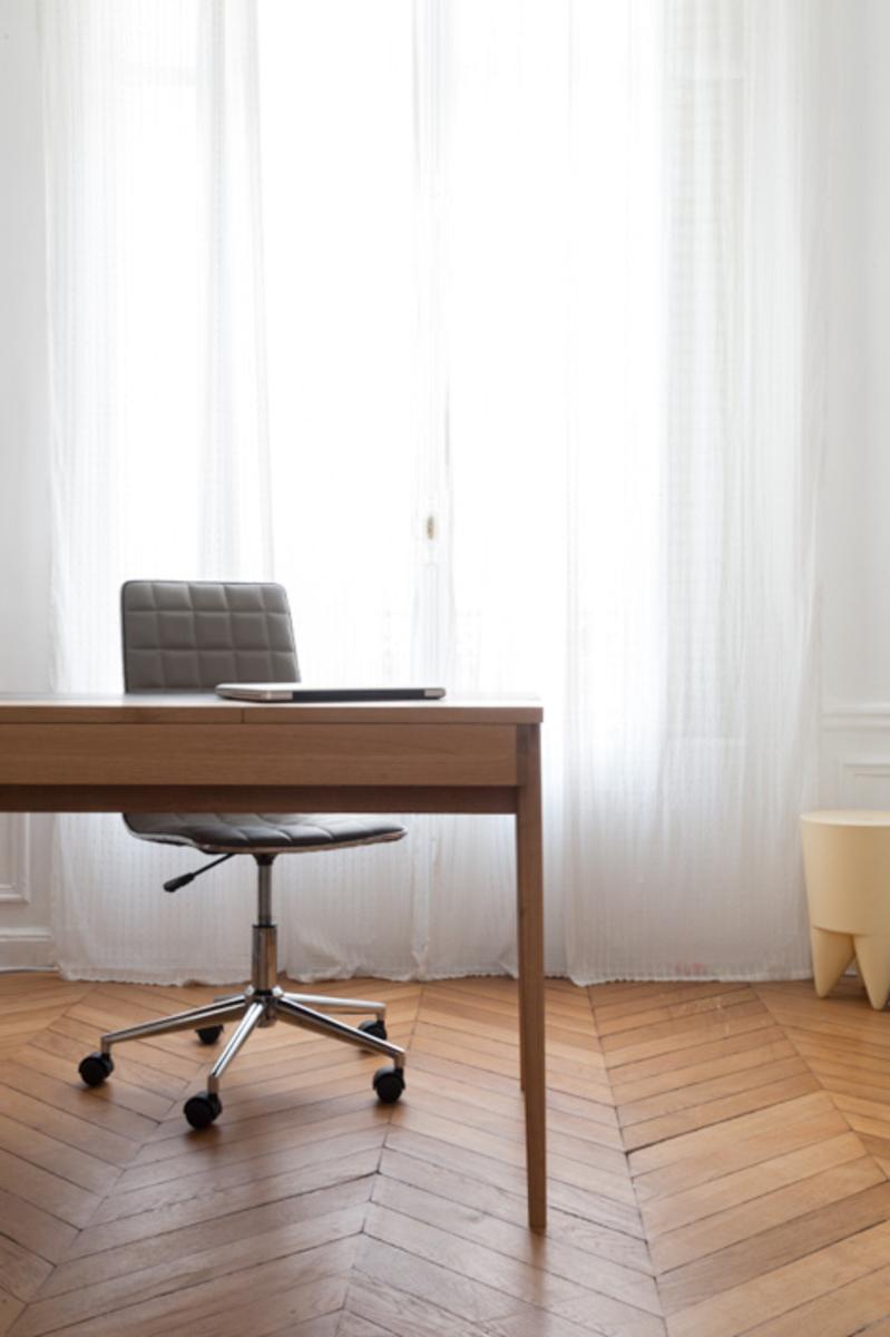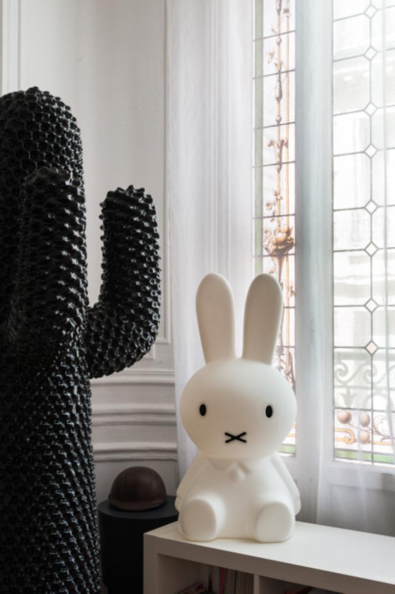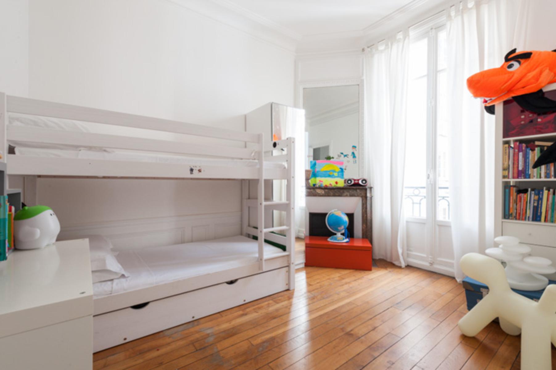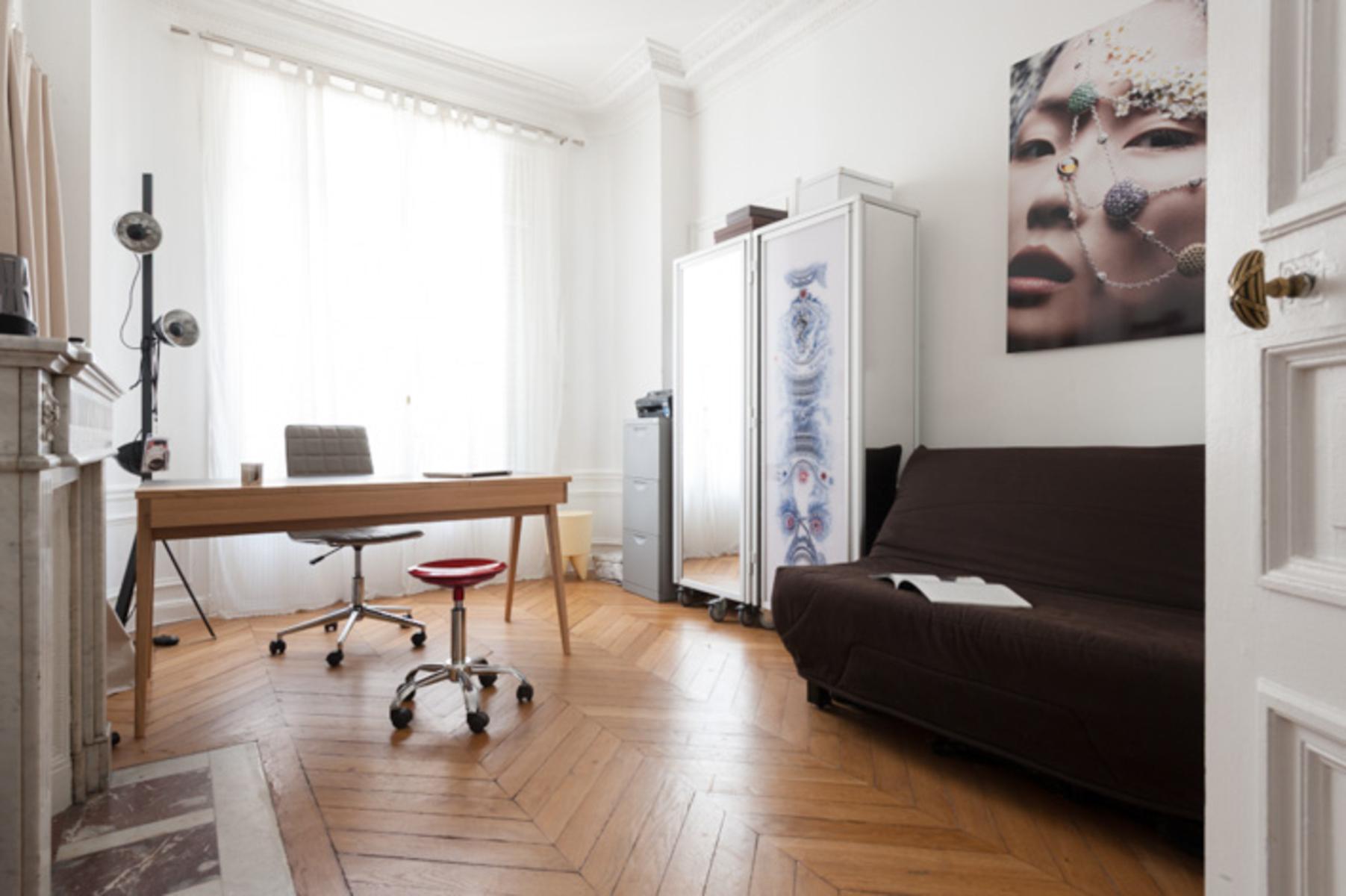 En flânant dans les brasseries et les boutiques du centre-ville de Saint-Germain-des-Prés, vous découvrirez cette maison du deuxième étage en retrait d’un boulevard classique. À l’intérieur, le salon et la salle à manger sont tout droit devant. Les plafonds en cornique et les parquets de cette chambre sont un charmant contrepoint à son ameublement kooky. Il y a un long canapé en cuir, un fauteuil en fourrure et une lampe de studio dans le coin salon, et une table blanche angulaire dans la salle à manger en face.