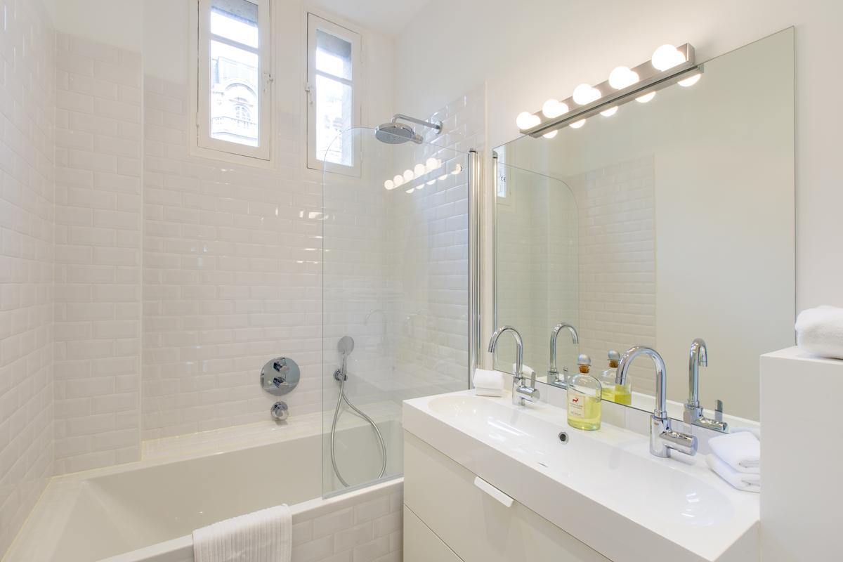 Le salon est assez grand et dispose d’une zone de refroidissement avec un canapé et un téléviseur et une autre partie avec une table à manger moderne (pour 6 personnes). La cuisine est moderne et totalement équipée. Vous trouverez tout ce dont vous avez besoin pour cuisiner un repas français. Il y a un grille-pain, une bouilloire, et encore mieux : une machine à café Nespresso ! La chambre des maîtres a un lit queen et une salle de bain avec douche. La deuxième et la troisième chambre ont aussi des lits queen et partagent une salle de bain.