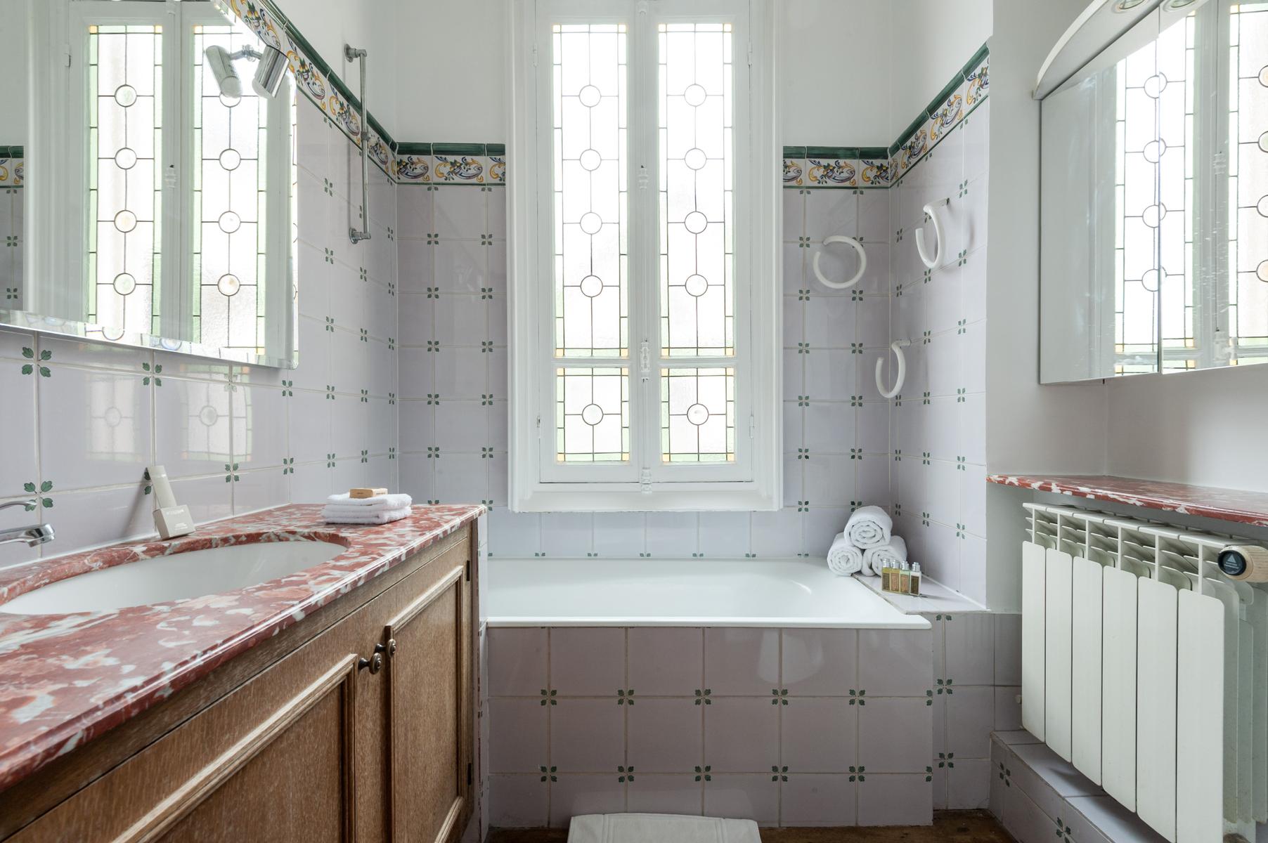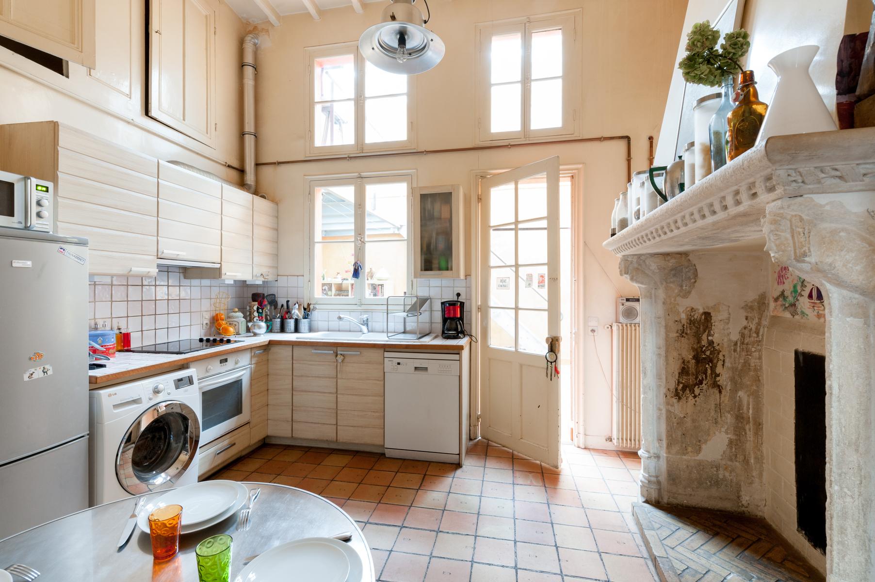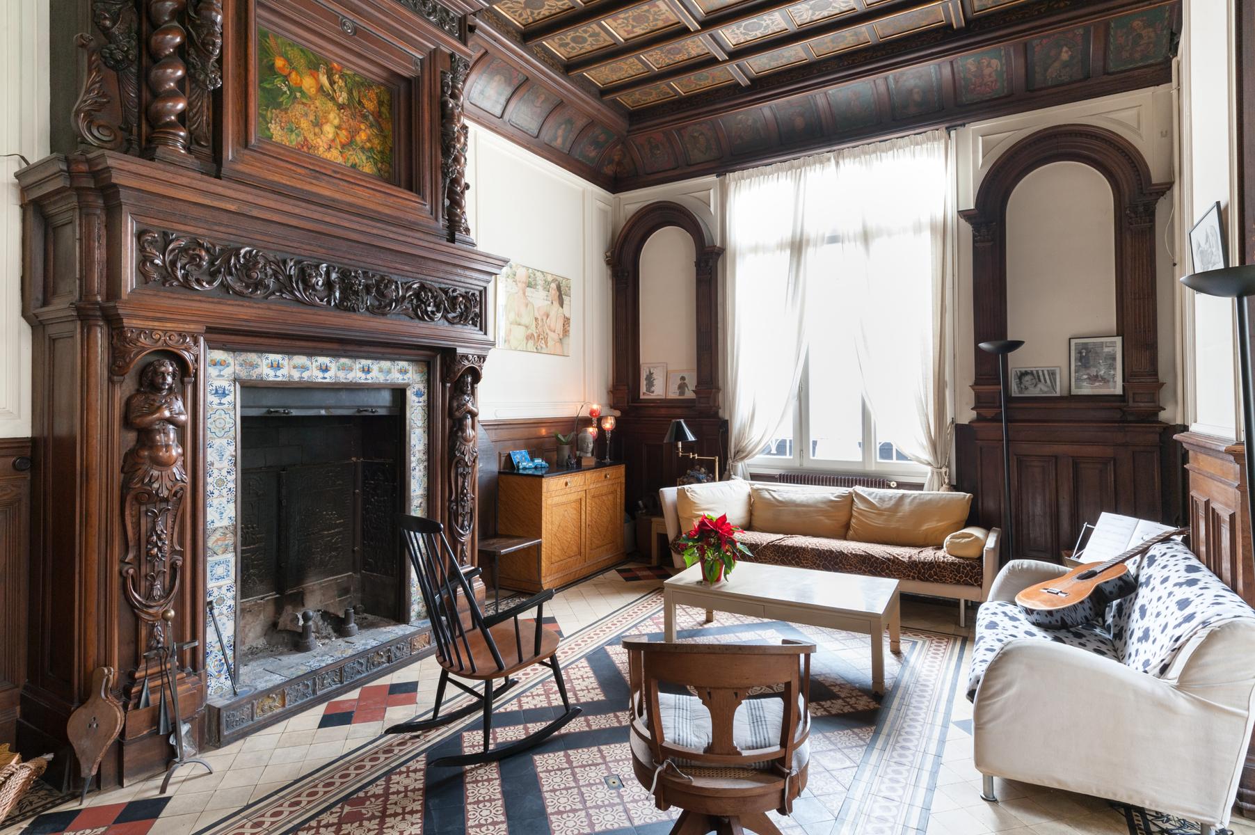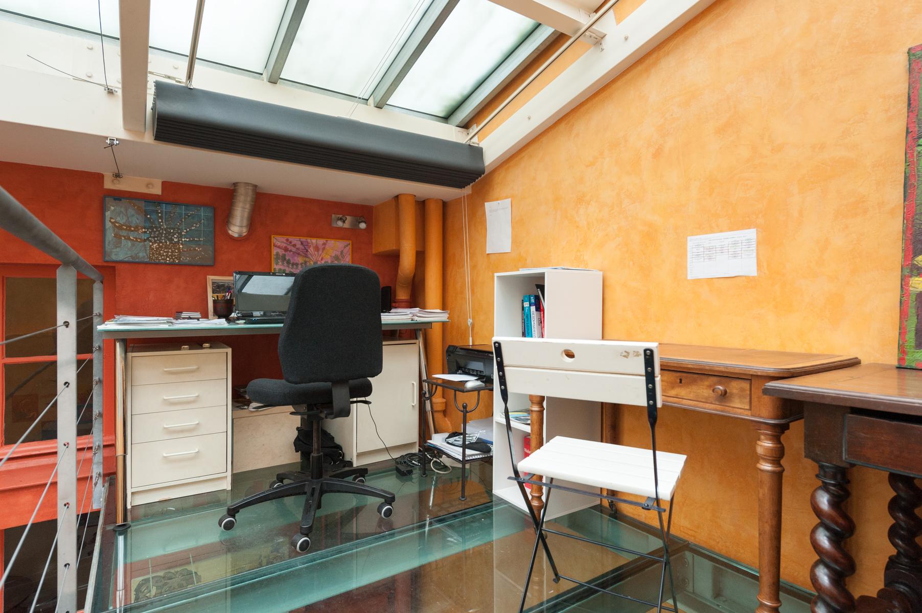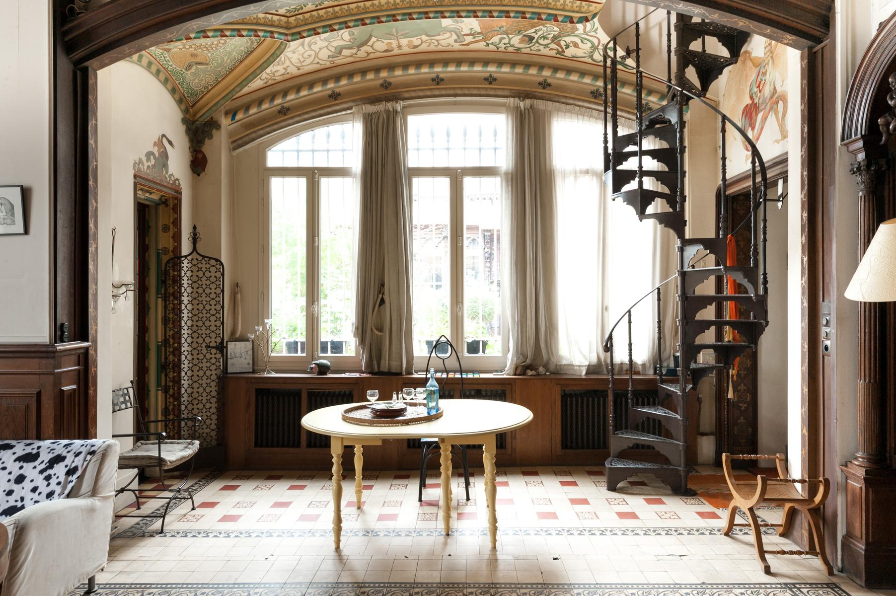Des carreaux de sol ornés de motif-ornement, un plafond à panneaux délicatement peint et des sculptures en bois complexes – le salon de l’Impasse Marie Blanche crée toute une impression. Cette maison néo-gothique unique au cœur de Montmatre est l’une des sept seules du genre à Paris et a été soigneusement préservée par vos hôtes. Un couloir de style médiéval mène à la cuisine, où un haut plafond surplombe une cheminée en pierre sculptée. Derrière la cuisine se trouve le seul ajout moderne – un bureau peint en tons orange vif avec un escalier industriel en acier menant à une mezzanine en verre.