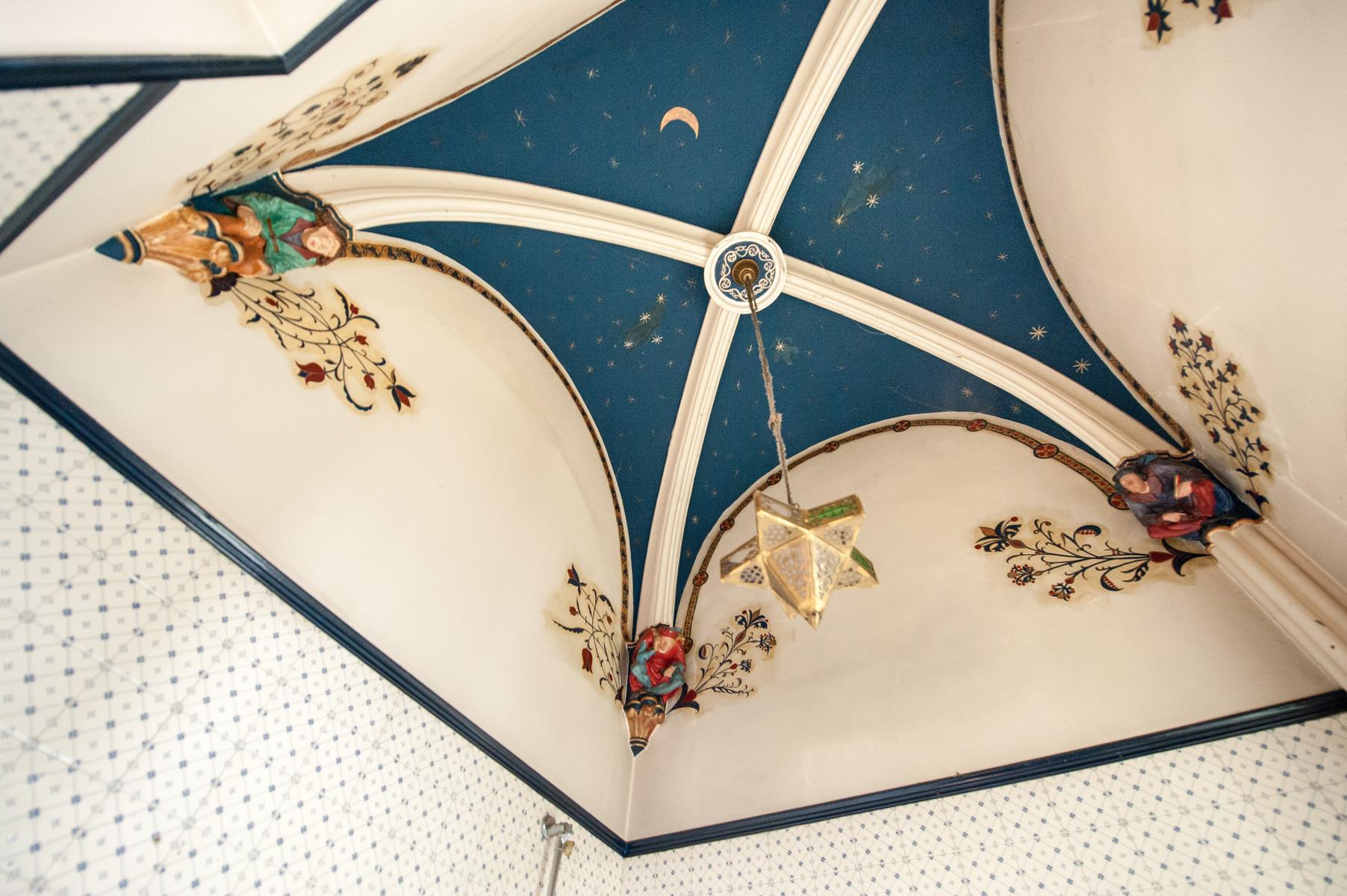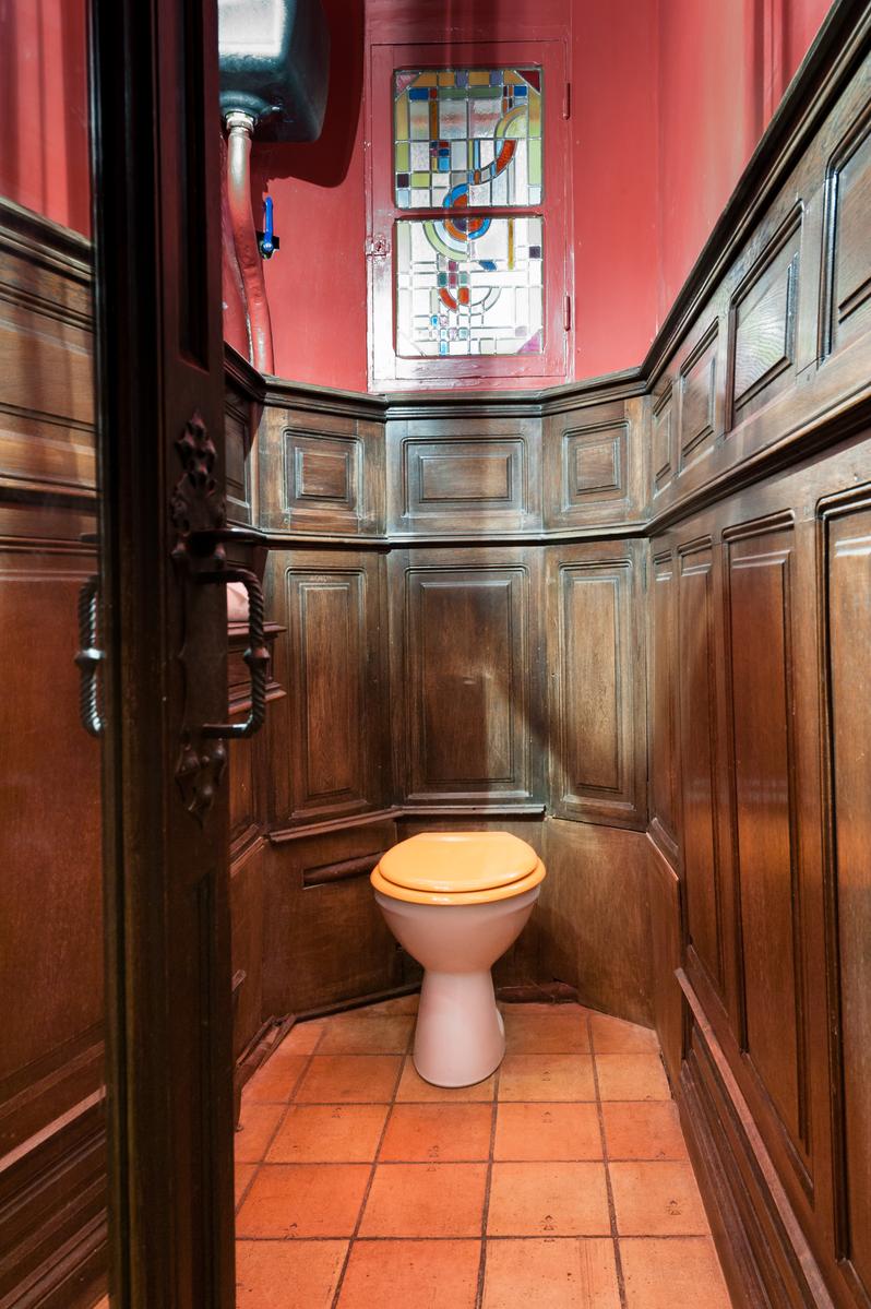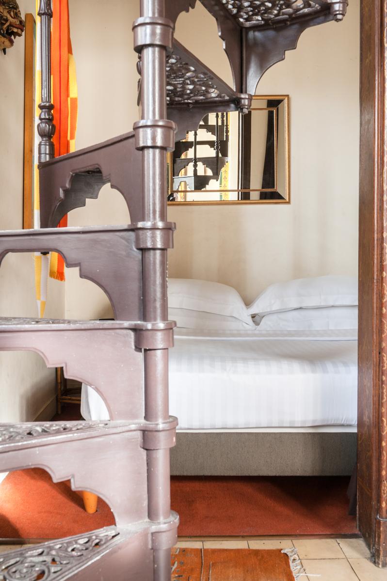 En haut de l’escalier en fonte du salon se trouvent les deux chambres du premier étage. Dans la chambre des maîtres, un vitrail surplombe le lit et une salle de bains blanche est un luxe moderne. Au rez-de-chaussée, à côté du salon, se trouve la salle de bains principale avec un plafond en dôme et une chambre double compacte. Et il y a aussi une salle de jeux au sous-sol.
