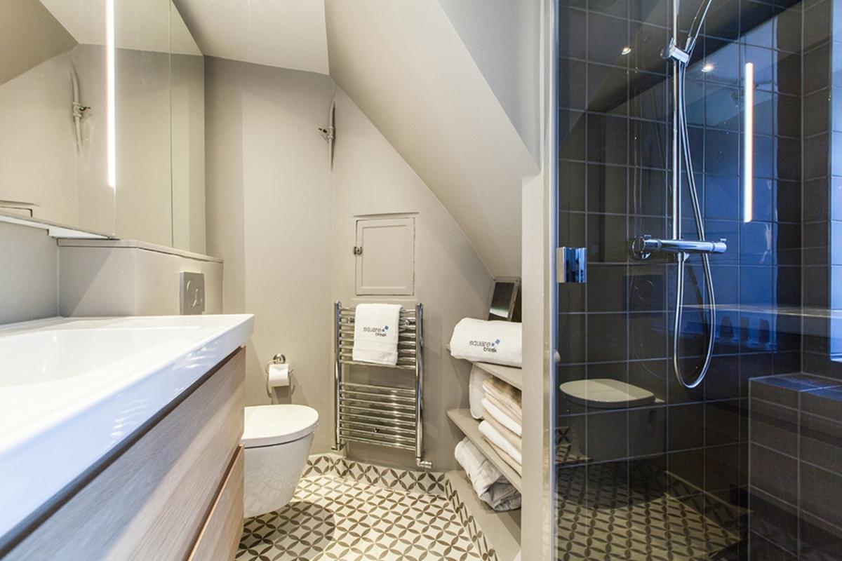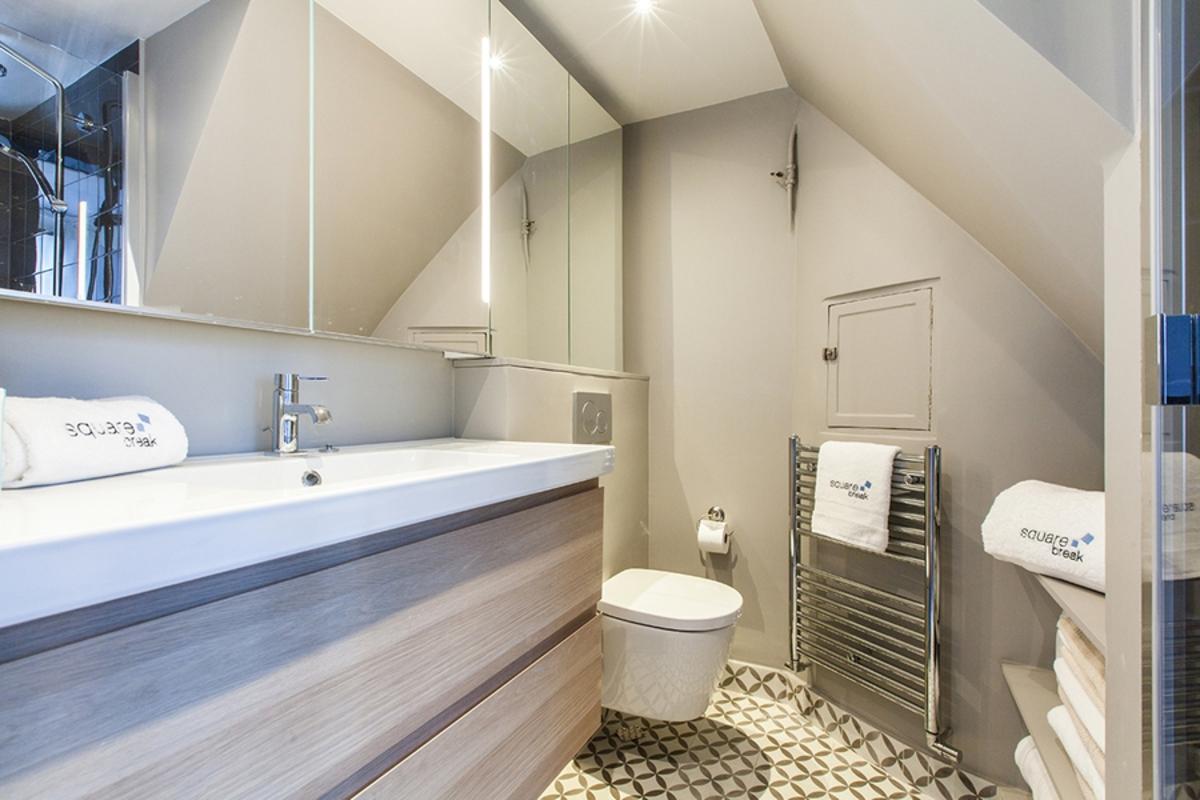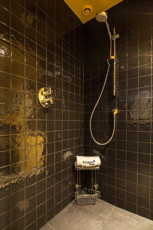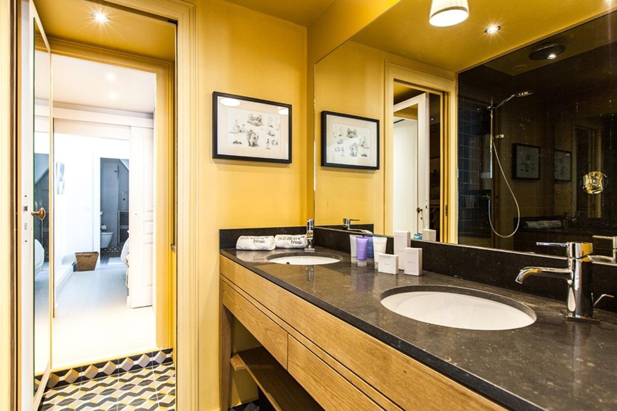 Par le salon et la salle à manger, on accède à une élégante salle de bain en jaune et noir, avec douche à l’italienne, deux lavabos et toilettes. Elle mène à un dressing dans le couloir qui est relié à la deuxième et dernière chambre, avec son lit king size, un téléviseur et sa salle de bain équipée d’un lavabo, d’une douche et d’un WC. Notez que cette chambre a sa propre entrée, ce qui est pratique pour l’intimité de chaque client.