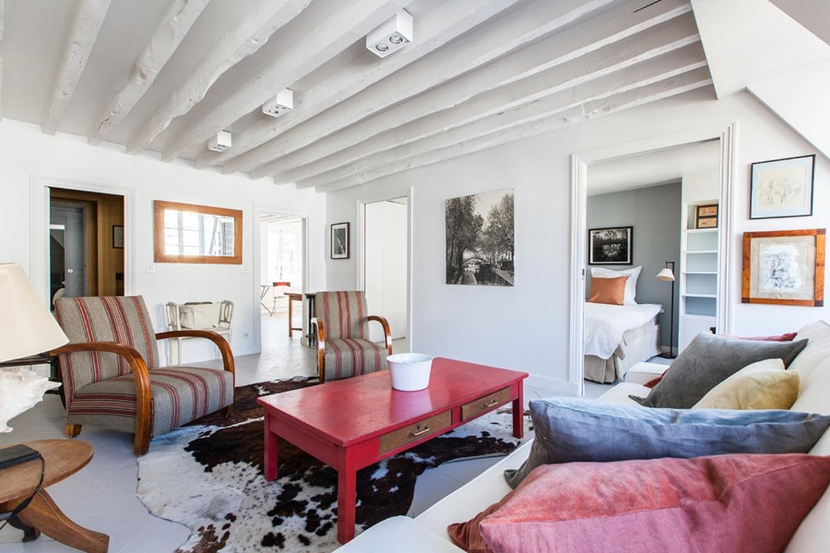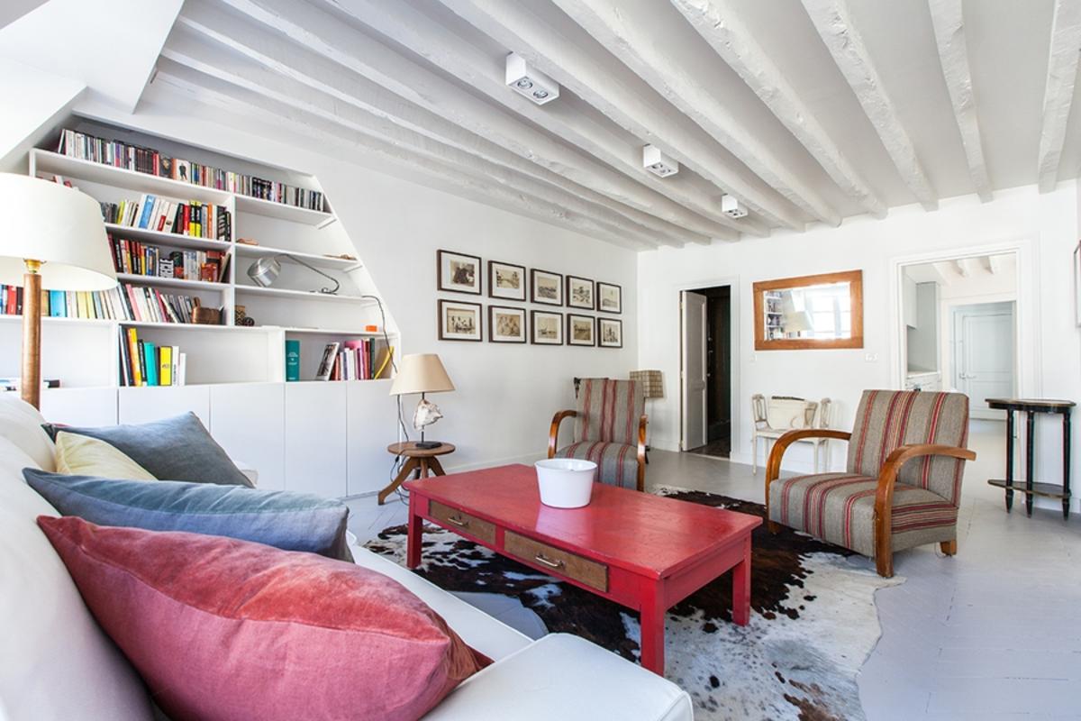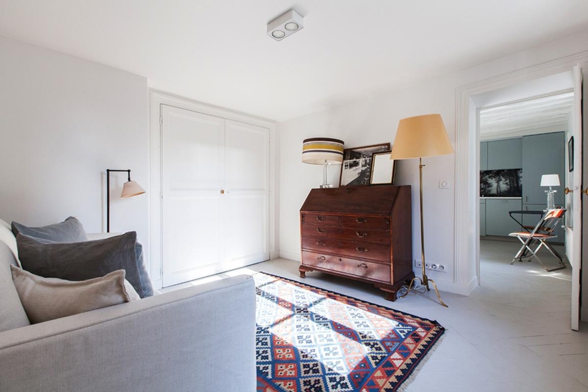 Réalisée en gris nacré et blanc nacré, avec poutres apparentes et parquet, cette pièce centrale vous donne accès aux différentes parties de l’appartement. En commençant par une chambre à coucher équipée d’un lit double, d’un espace de rangement et d’une télévision, avec vue sur la rue calme et à sens unique. Des portes coulissantes relient cette pièce à un salon accueillant avec des meubles anciens, des étagères et un canapé confortable, donnant également sur la rue en contrebas.