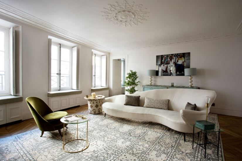 Devant la belle cheminée se trouve deux fauteuils vert olive et un canapé gracieux.