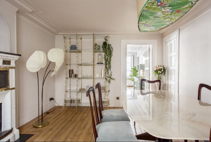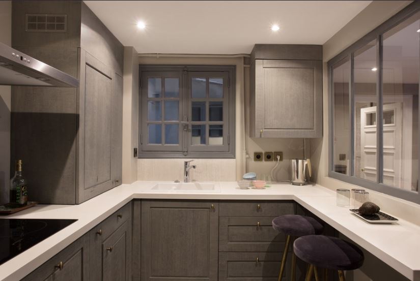 Vous arriverez d’abord dans la cuisine, petite et élégante, avec son bar à petit-déjeuner et ses tabourets en velours.