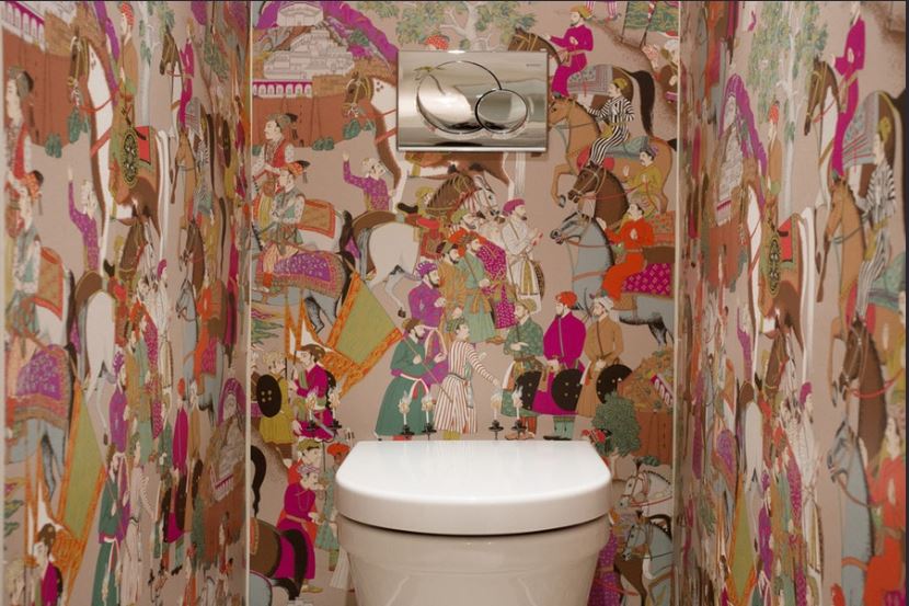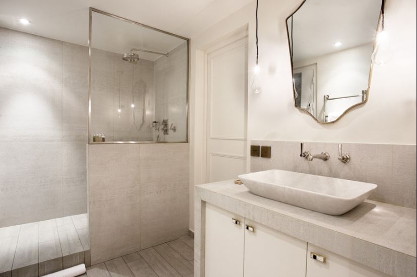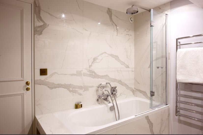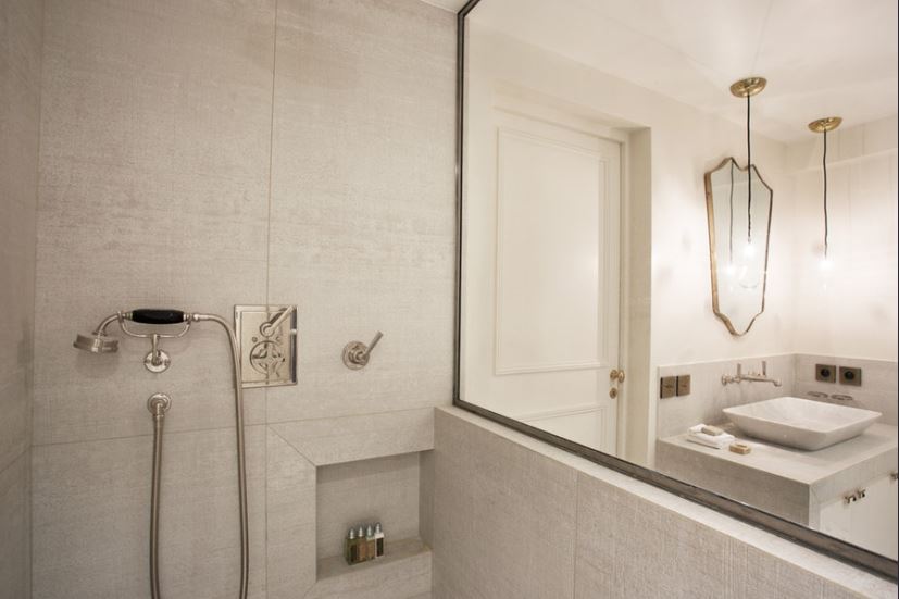 Une autre à la salle de bain tapissée de motifs, avec sa baignoire bordée de marbre et sa douche intégrée.