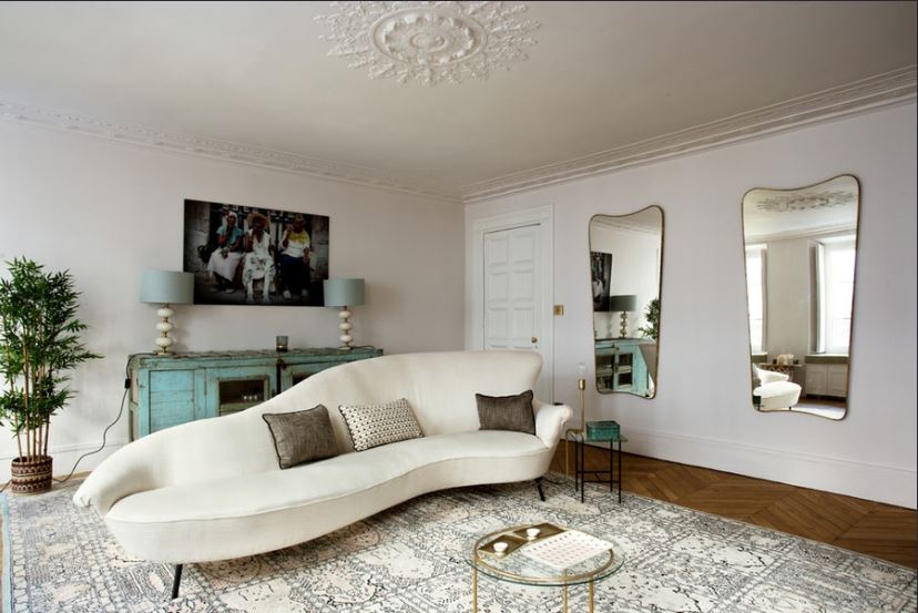 Une grande pièce avec du parquet, de nombreux miroirs et une cheminée décorative.