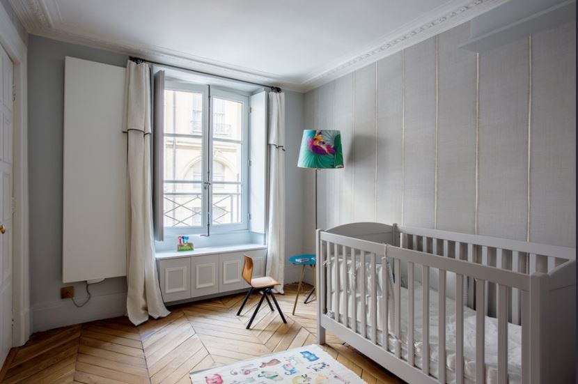 D’un côté se trouve la troisième chambre, d’un gris tendre, puis de l’autre la chambre des maîtres.