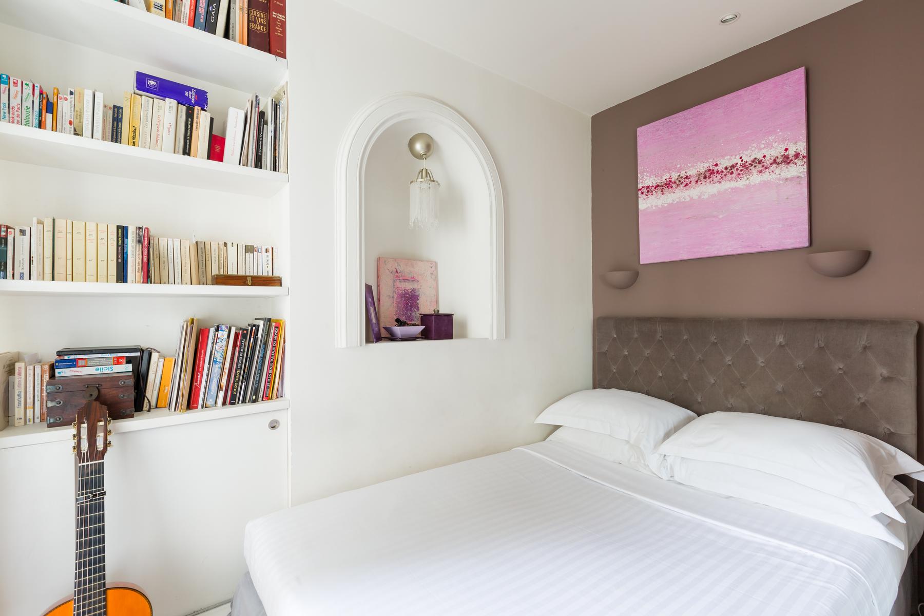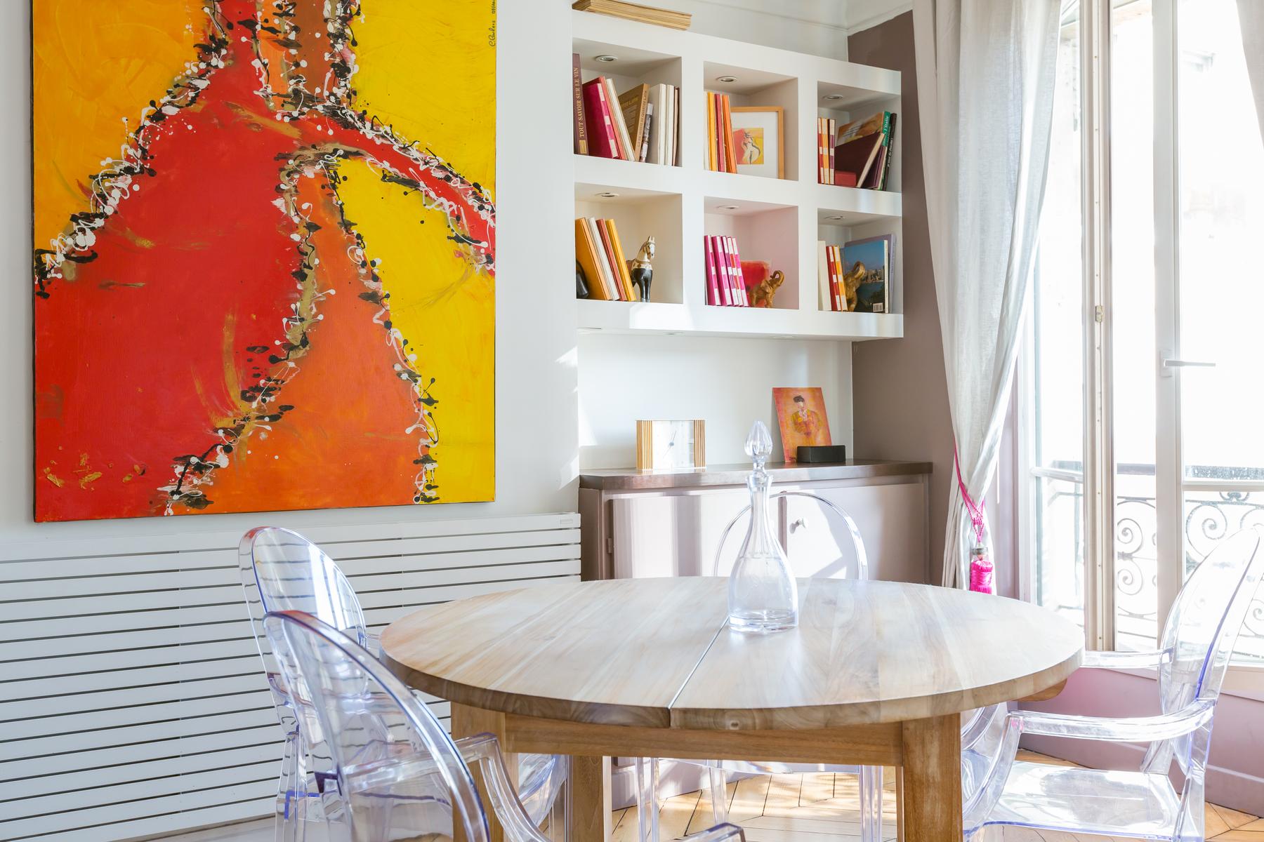 Le joli Jardin du Luxembourg, les grandes boutiques de Saint-Germain-des-Prés, la Closerie des Lilas, la Closerie des Lilas, tout est là pour stimuler l’imagination à Montparnasse. A l’intérieur de Place Bienvenüe, les œuvres d’art abstrait complètent l’ameublement – des peintures roses et des chaises en velours longues dans le salon à la dramatique toile orange à côté des armoires rouges de la cuisine. Vous trouverez la table de salle à manger entre les deux – elle est disposée avec quatre chaises en plexiglas et se trouve à côté des étagères modulaires empilées avec la collection de titres de vos hôtes.