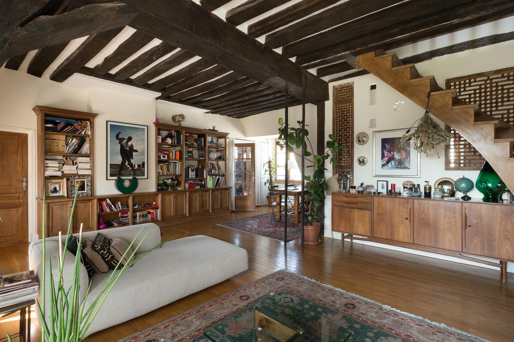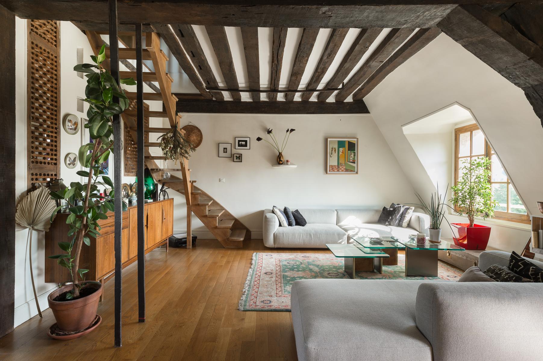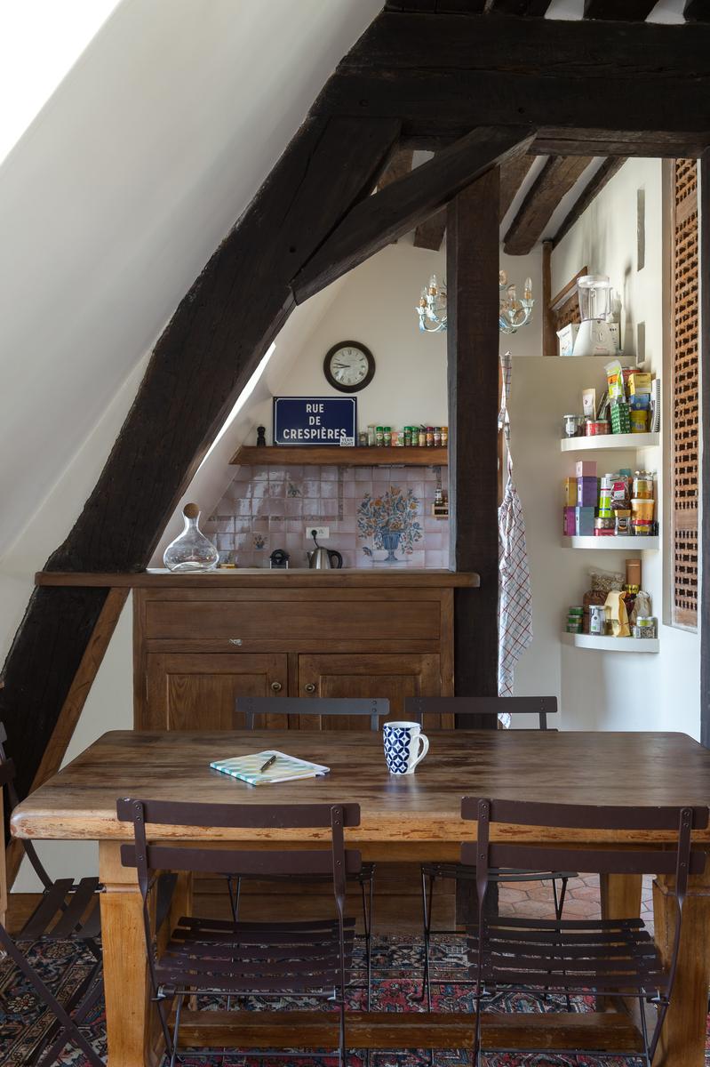 Avec ses poutres sombres et ses vues sur les fontaines et les châtaigniers, la Place des Vosges semble plus provençale que parisienne. En entrant au troisième étage, la salle de bains au sol en terre cuite se trouve à gauche, et tout droit devant vous arriverez au salon. Les plantes en pot complètent un buffet en bois et des poutres brutes, et il y a de la place pour quatre personnes dans la cuisine de style maison de ferme, à gauche.