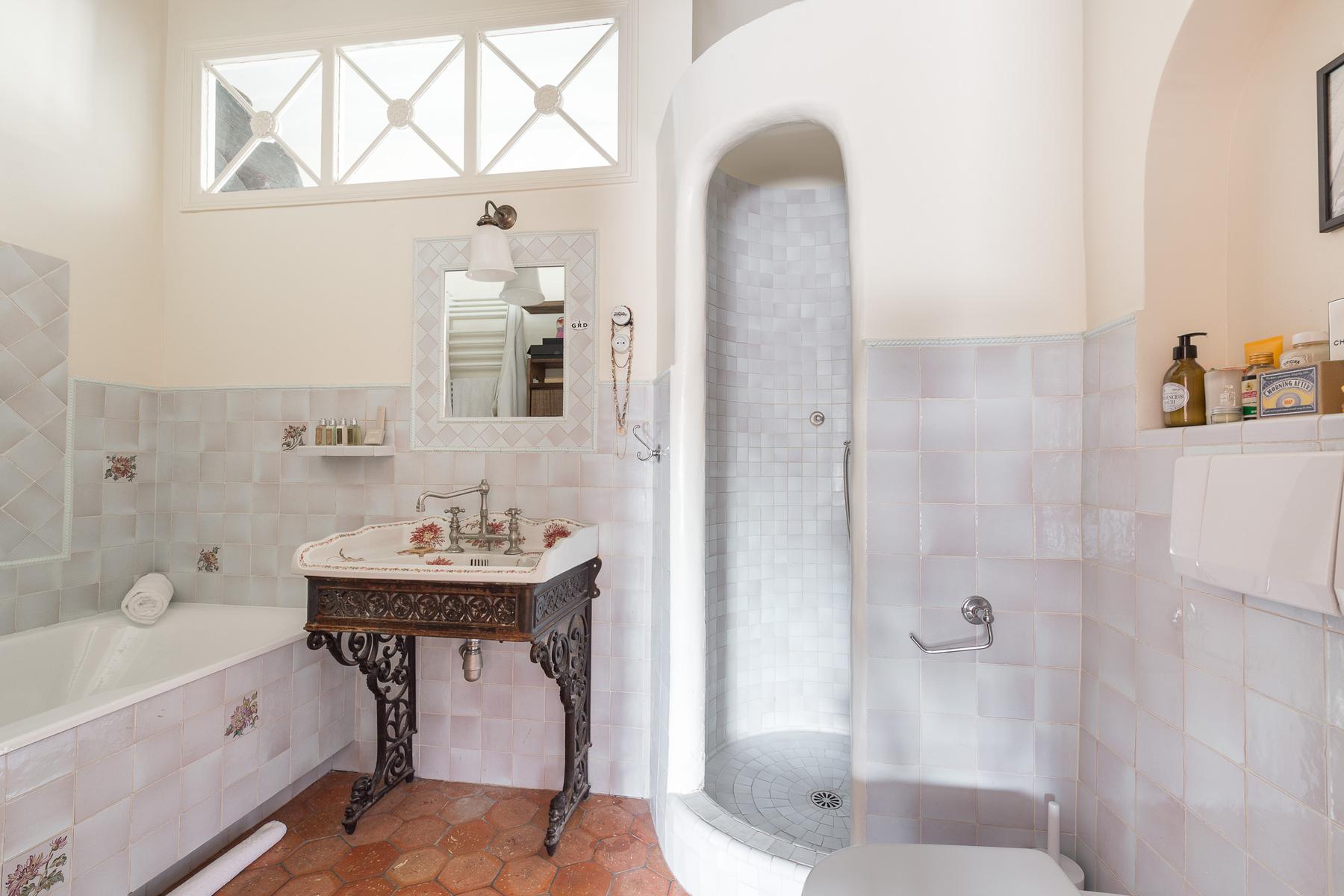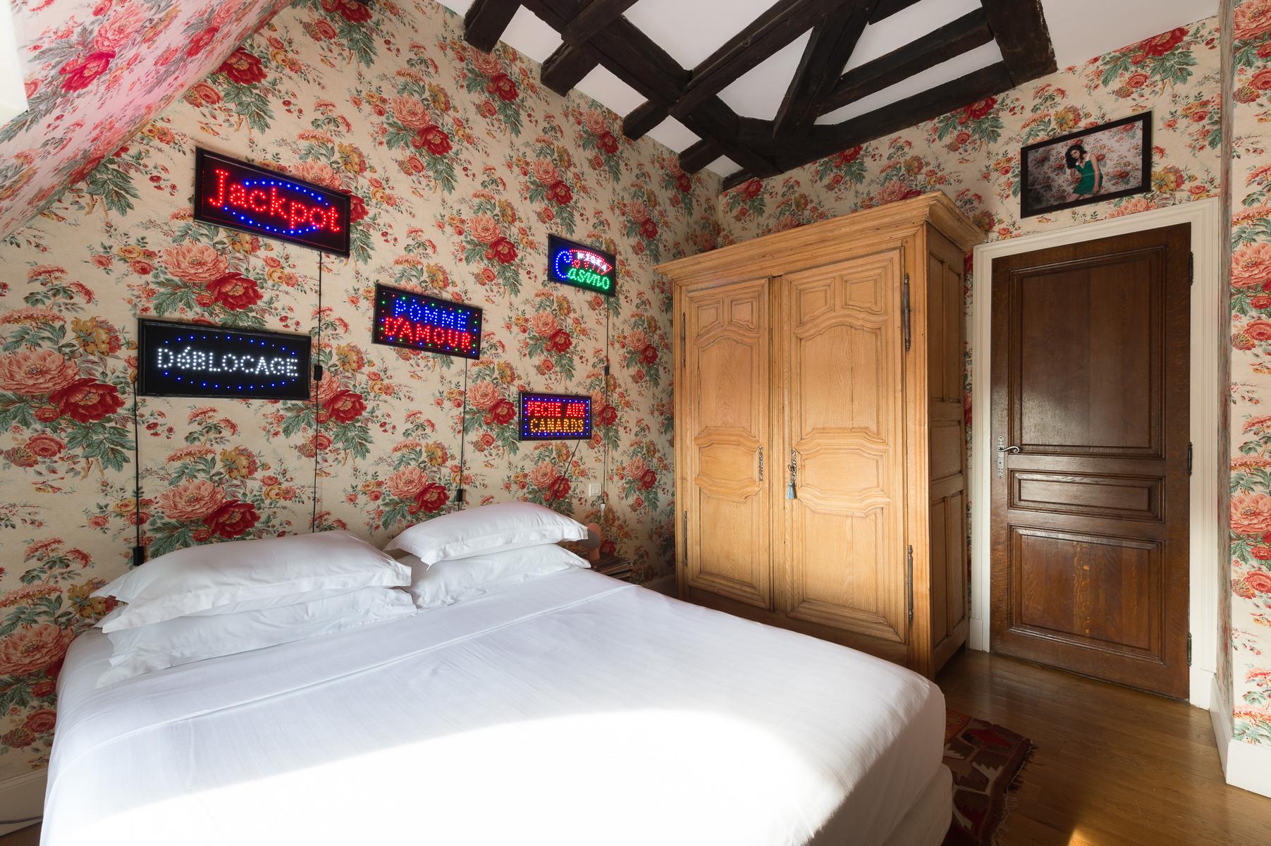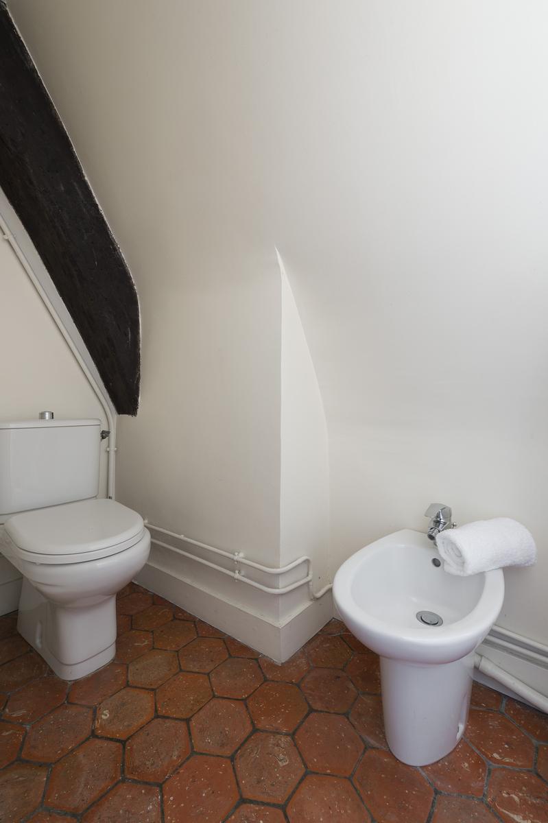 Avec ses poutres sombres et ses vues sur les fontaines et les châtaigniers, la Place des Vosges semble plus provençale que parisienne. En entrant au troisième étage, la salle de bains au sol en terre cuite se trouve à gauche, et tout droit devant vous arriverez au salon. Les plantes en pot complètent un buffet en bois et des poutres brutes, et il y a de la place pour quatre personnes dans la cuisine de style maison de ferme, à gauche.