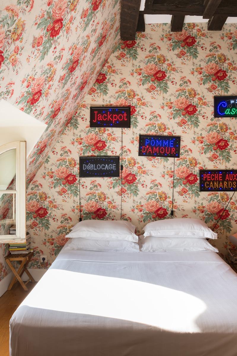 À droite du salon, la chambre des maîtres a une salle de bain attenante et un lit queen sous une rangée d’enseignes au néon. En montant l’escalier ouvert du salon, vous trouverez la deuxième chambre à coucher, son lit double sous les chevrons exposés.