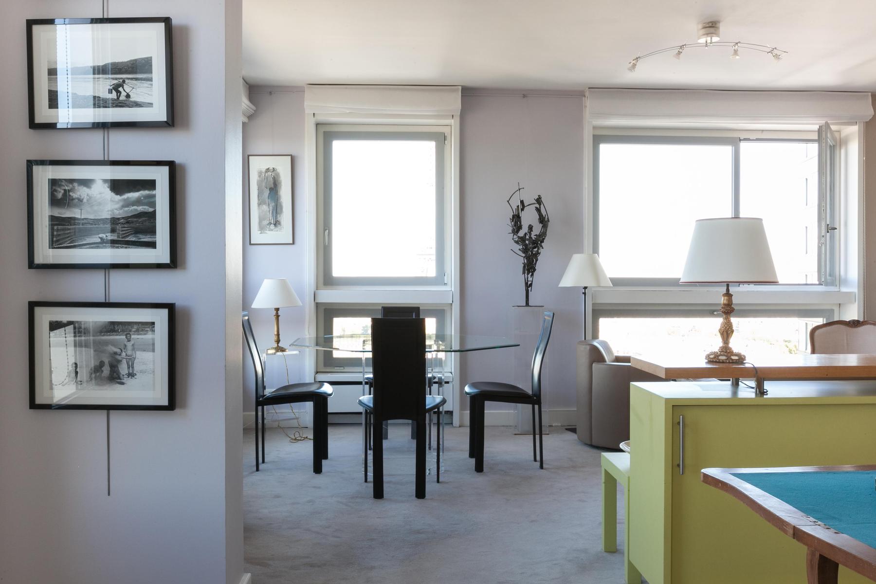 Dans le haut Quai de Grenelle II, l’agitation de la ville semble lointaine. Des teintes douces – jaune dans la chambre des maîtres, bleu ciel dans la salle de bains – ombragent les murs et des meubles raffinés sont disposés dans chaque pièce. Des miroirs ornés et des coffres antiques à une table de salle à manger octogonale en verre, il y a beaucoup de choses à voir à l’intérieur. Mais dehors, il y en a d’autres. Cette maison a une vue enviable à 180 degrés sur Paris : la Tour Eiffel, le Trocadéro et le Sacré-Cœur sont tous en vue. La Tour Eiffel scintille à l’heure tous les soirs et l’appartement offre le meilleur point de vue pour admirer ce spectacle de lumière. Les cafés et boutiques de Beaugrenelle sont à portée de main. 0A