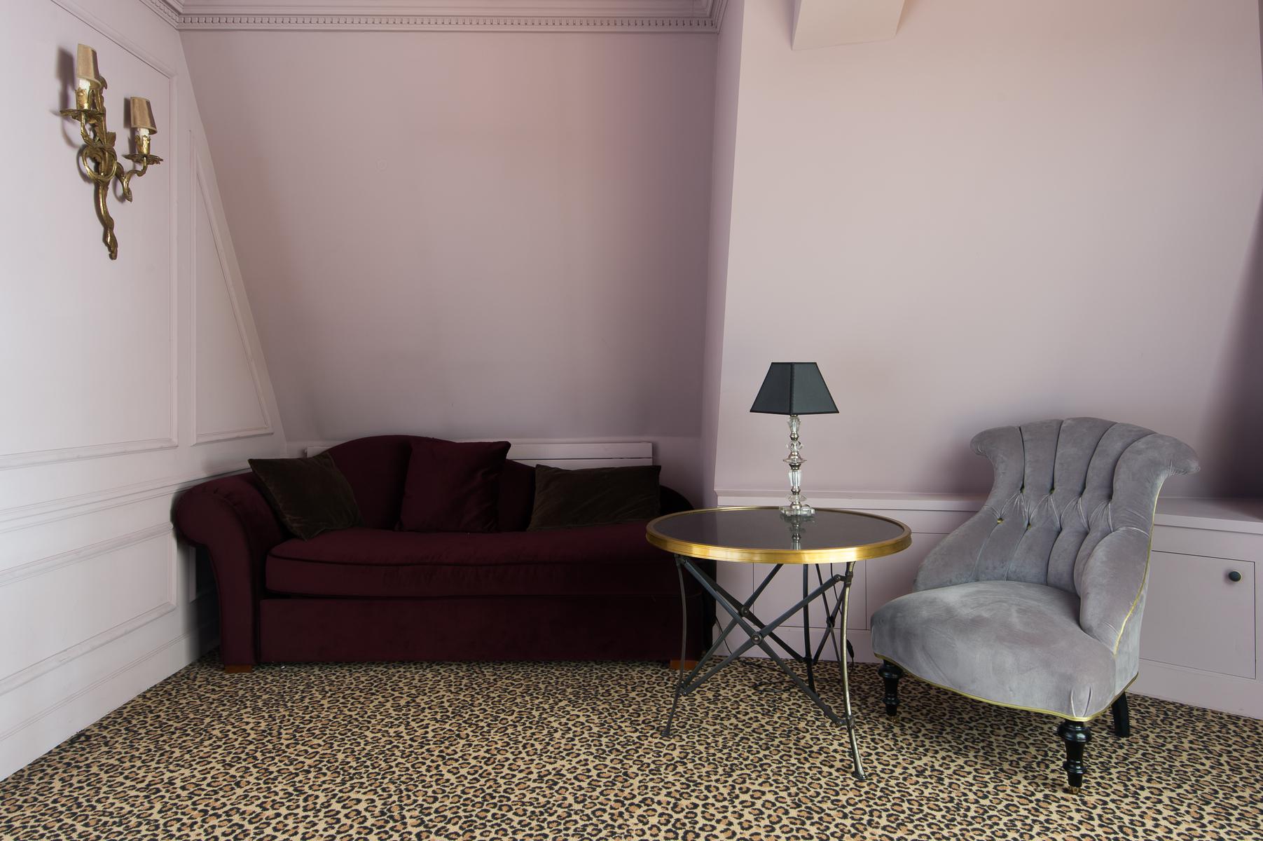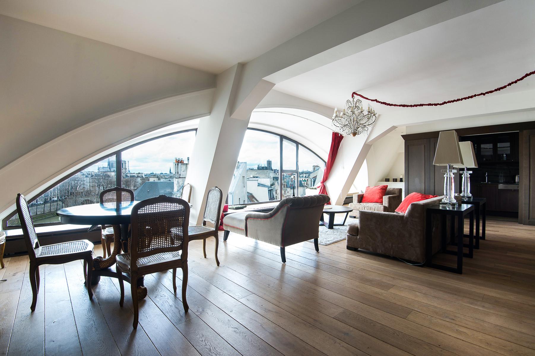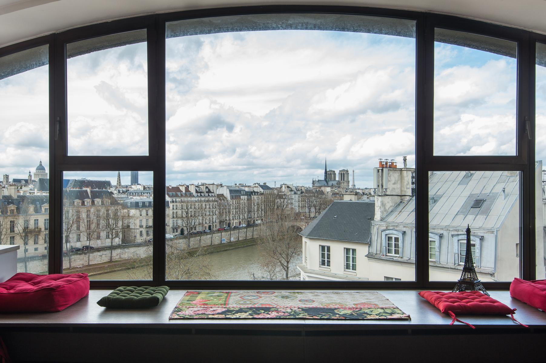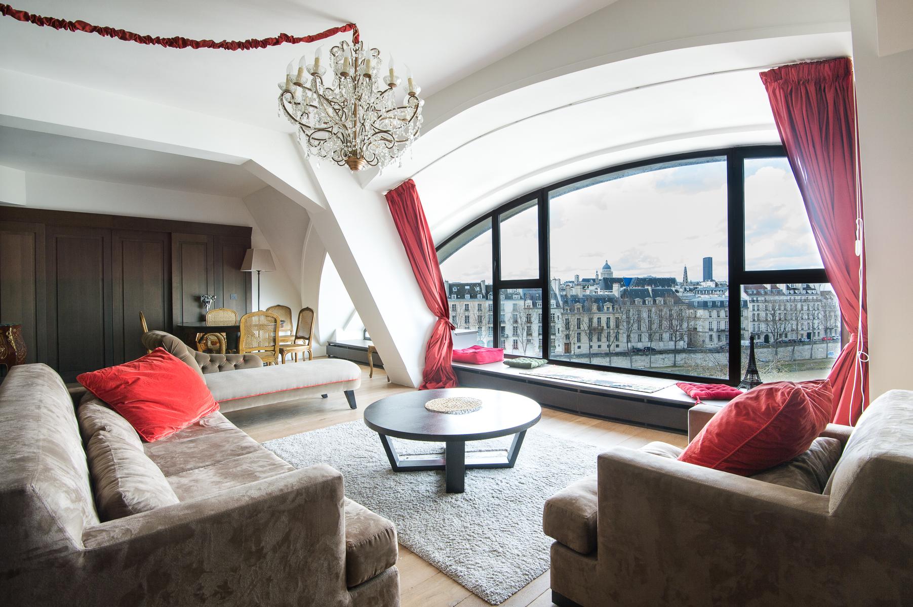 De son ameublement exquis à sa vue aérienne sur la Seine, le Quai des Célestins II est prêt à impressionner. Au sixième étage, vous entrez dans un couloir qui mène d’abord au salon à panneaux. Au centre, il y a un coin salon, où trois canapés en velours font face à une fenêtre en arche qui encadre la vue de cette maison sur la rivière. À droite de celle-ci se trouve la cuisine (petite, mais remarquablement décorée, avec des comptoirs de marbre veiné), et à gauche, une table à manger en noir et or. Au-delà, une porte mène à la deuxième salle de séjour, qui a des murs lilas, un tapis imprimé léopard et un canapé-lit.