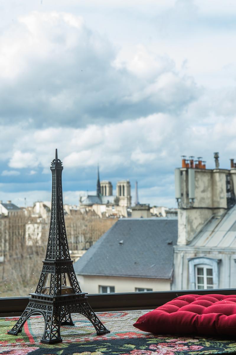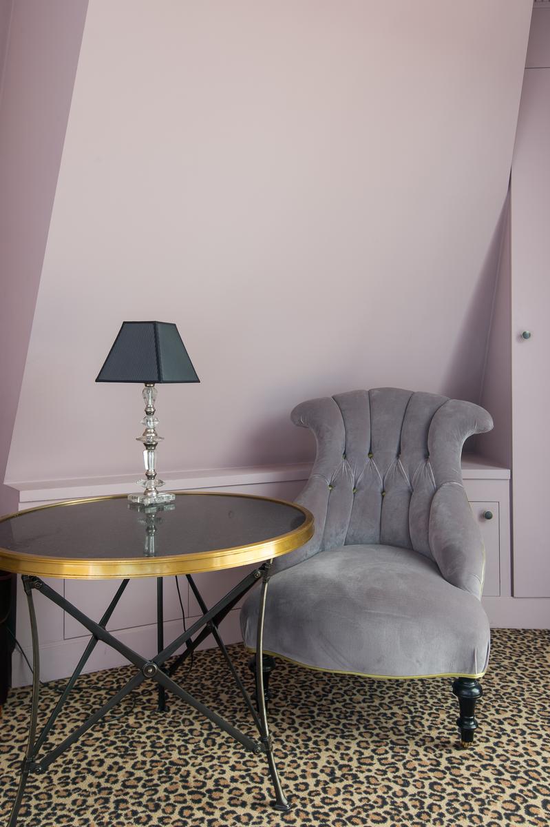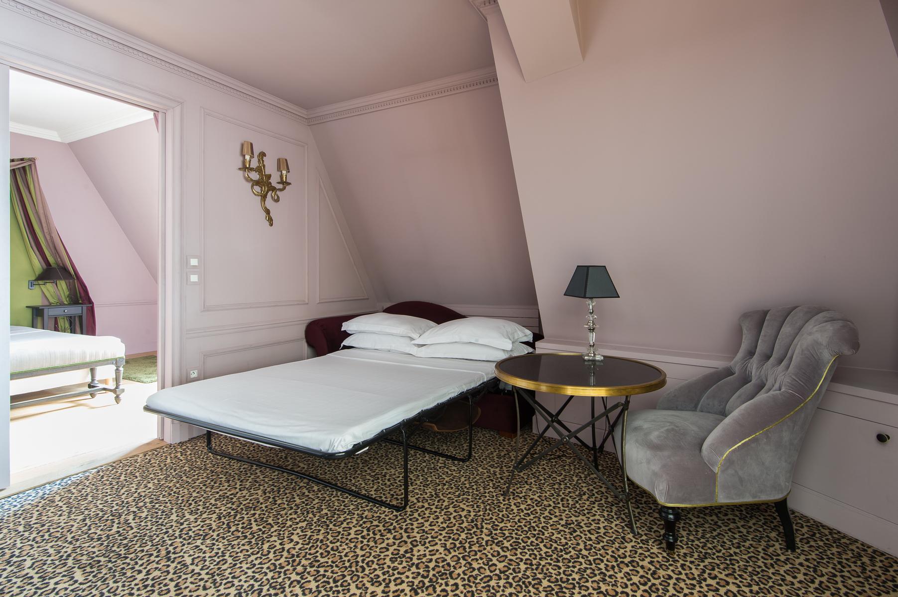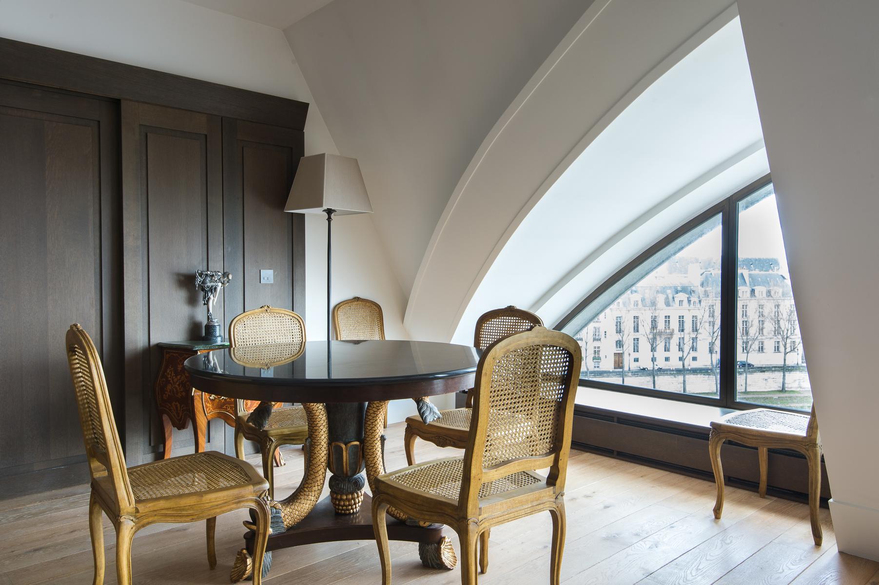 De son ameublement exquis à sa vue aérienne sur la Seine, le Quai des Célestins II est prêt à impressionner. Au sixième étage, vous entrez dans un couloir qui mène d’abord au salon à panneaux. Au centre, il y a un coin salon, où trois canapés en velours font face à une fenêtre en arche qui encadre la vue de cette maison sur la rivière. À droite de celle-ci se trouve la cuisine (petite, mais remarquablement décorée, avec des comptoirs de marbre veiné), et à gauche, une table à manger en noir et or. Au-delà, une porte mène à la deuxième salle de séjour, qui a des murs lilas, un tapis imprimé léopard et un canapé-lit.
