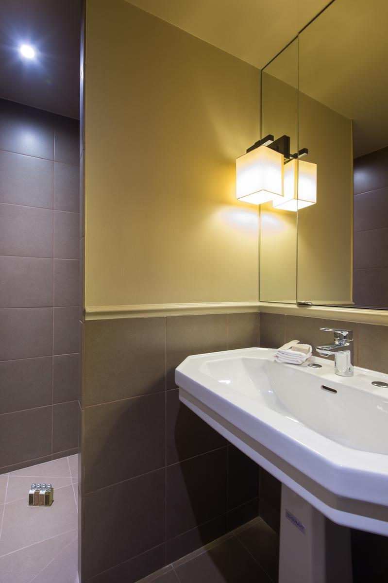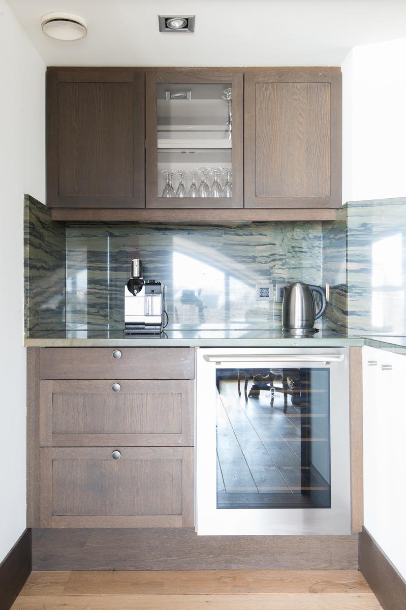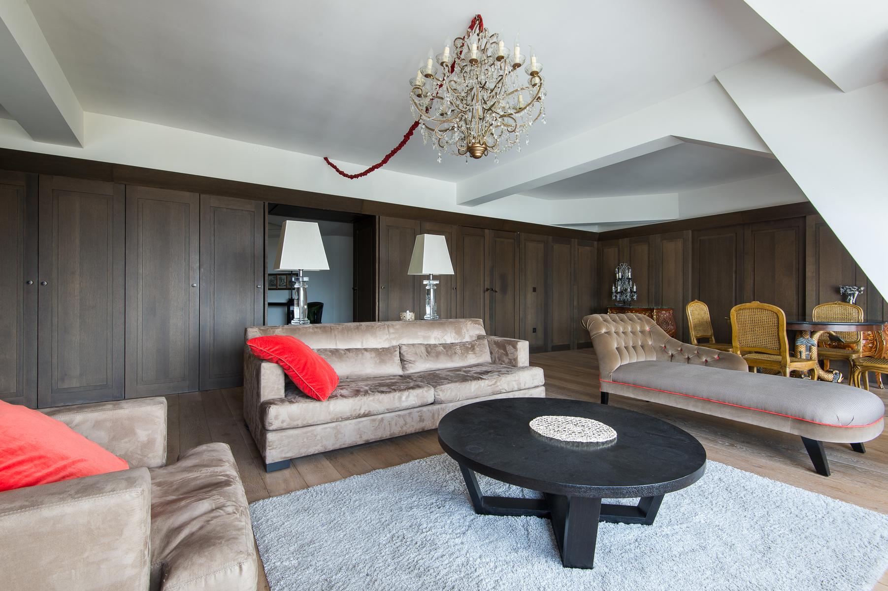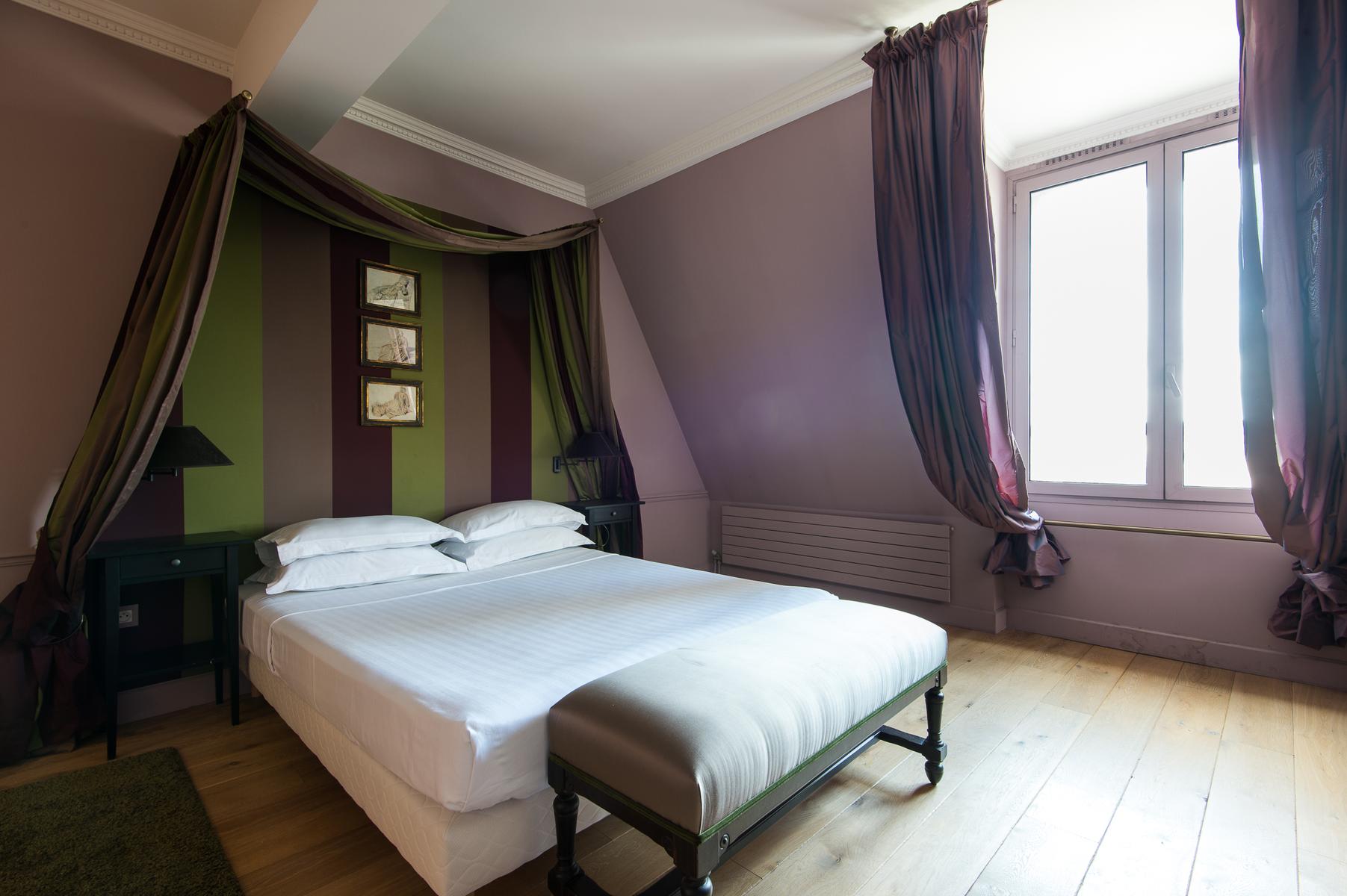 De son ameublement exquis à sa vue aérienne sur la Seine, le Quai des Célestins II est prêt à impressionner. Au sixième étage, vous entrez dans un couloir qui mène d’abord au salon à panneaux. Au centre, il y a un coin salon, où trois canapés en velours font face à une fenêtre en arche qui encadre la vue de cette maison sur la rivière. À droite de celle-ci se trouve la cuisine (petite, mais remarquablement décorée, avec des comptoirs de marbre veiné), et à gauche, une table à manger en noir et or. Au-delà, une porte mène à la deuxième salle de séjour, qui a des murs lilas, un tapis imprimé léopard et un canapé-lit.