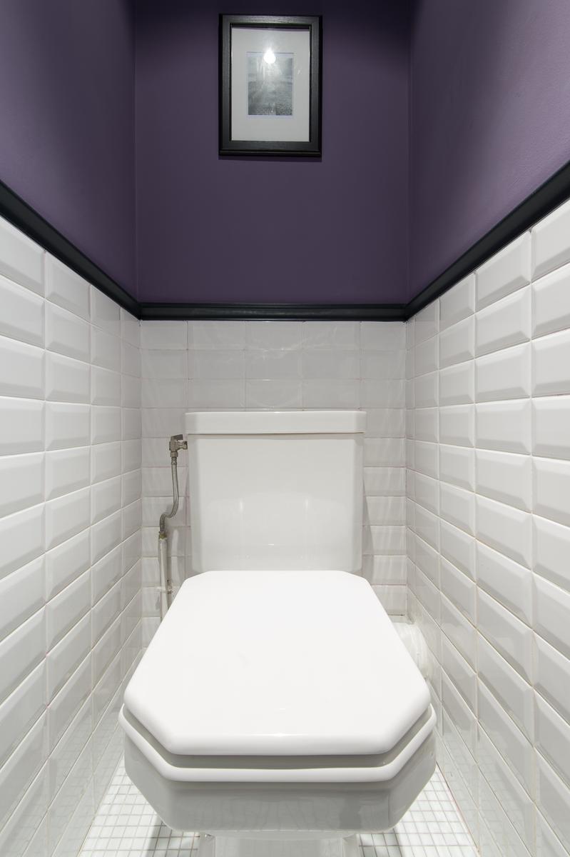 Ensuite, le hall d’entrée passe devant deux salles de bains (l’une classique, l’autre à la décoration audacieuse, avec baignoire sur roulettes) et longe la chambre des maîtres. Sans surprise, cette dernière pièce est un espace dramatique, avec un lit queen à baldaquin et des rideaux de soie assortis.