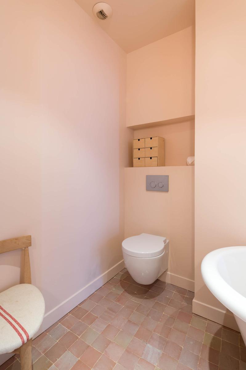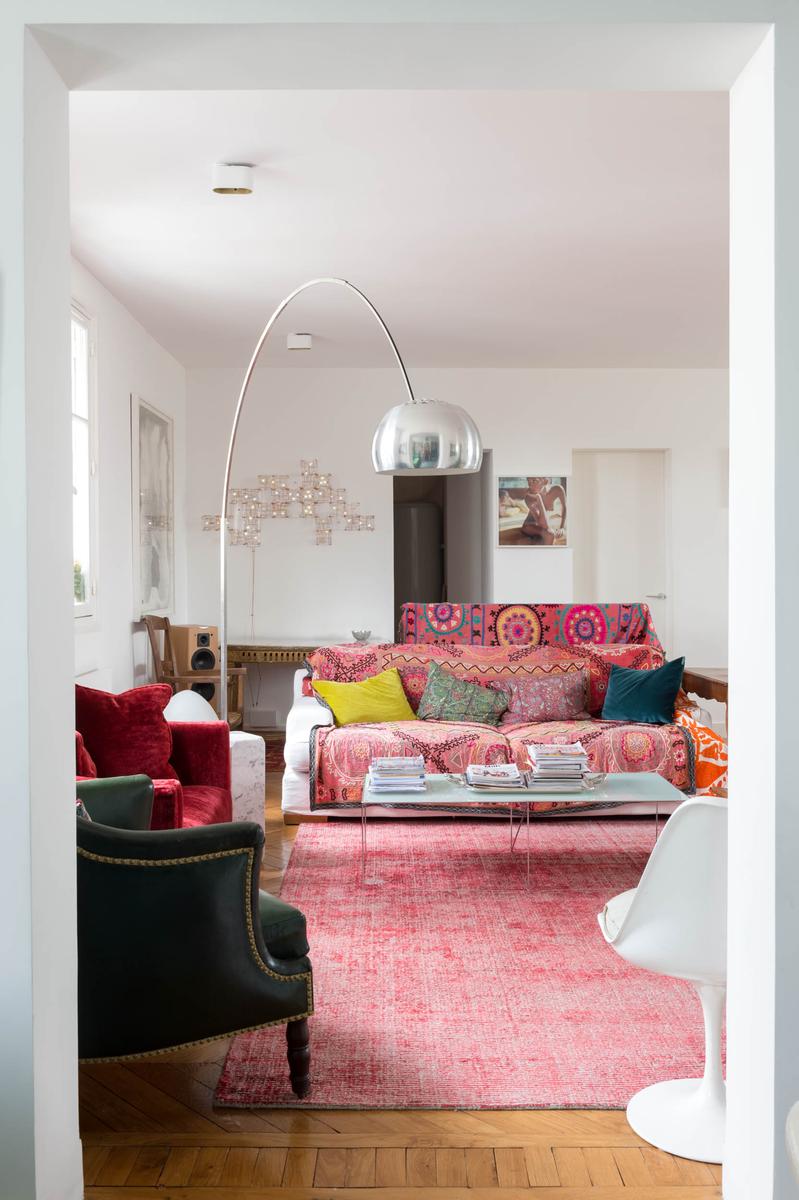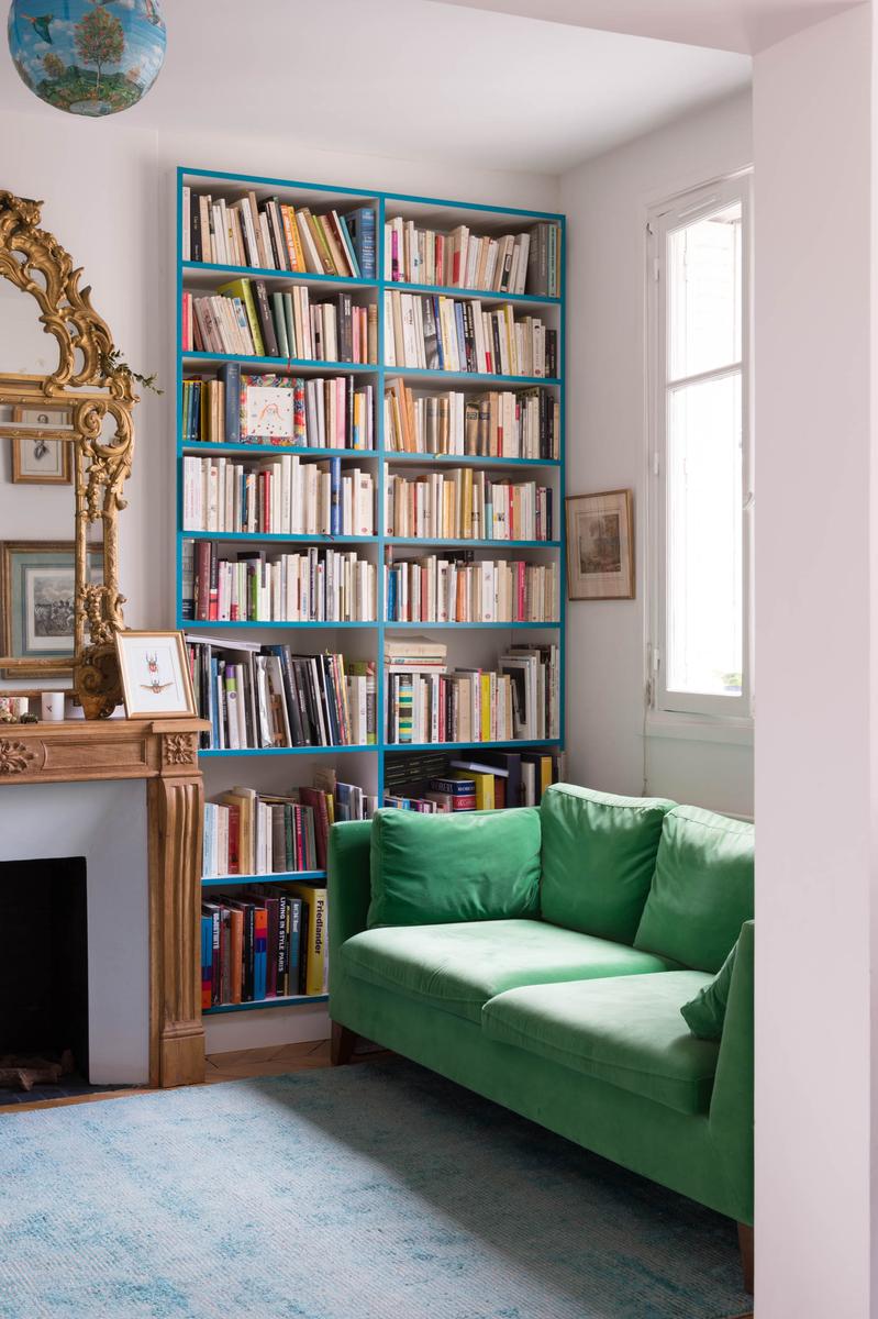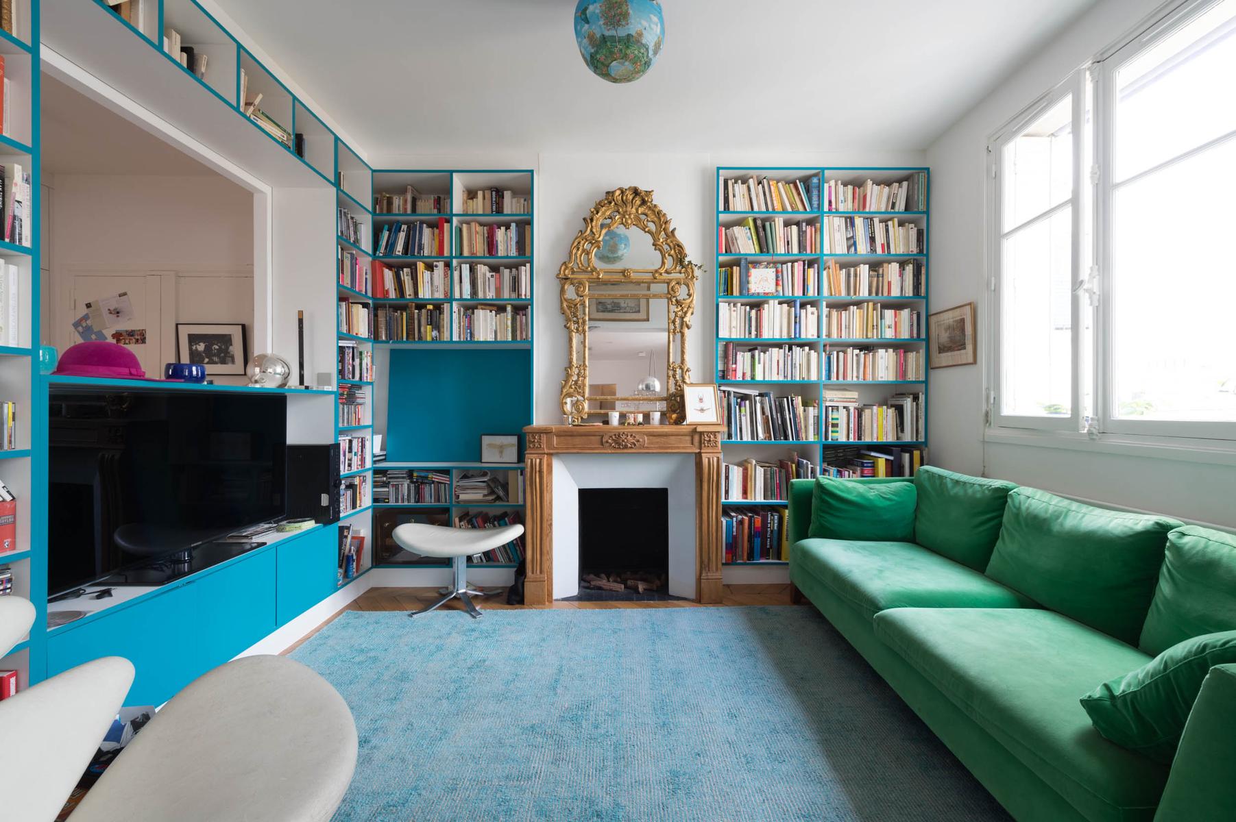 Cette maison a toute l’élégance de Saint-Germain-des-Prés, plus un peu de zeste. Le hall d’entrée passe devant un cabinet de toilette et mène directement au salon ouvert. À droite, un coin cuisine blanc élégant avec une table à manger contemporaine et des lampes pastel ombragées. Puis, à gauche, un coin salon aux couleurs contrastées, où des canapés et des fauteuils au rembourrage brillant sont posés sur un tapis rose pâle. Par la porte, vous trouverez ici le deuxième salon – encore plus richement décoré en turquoise et vert, avec une cheminée ornementale classique et des murs tapissés de livres.