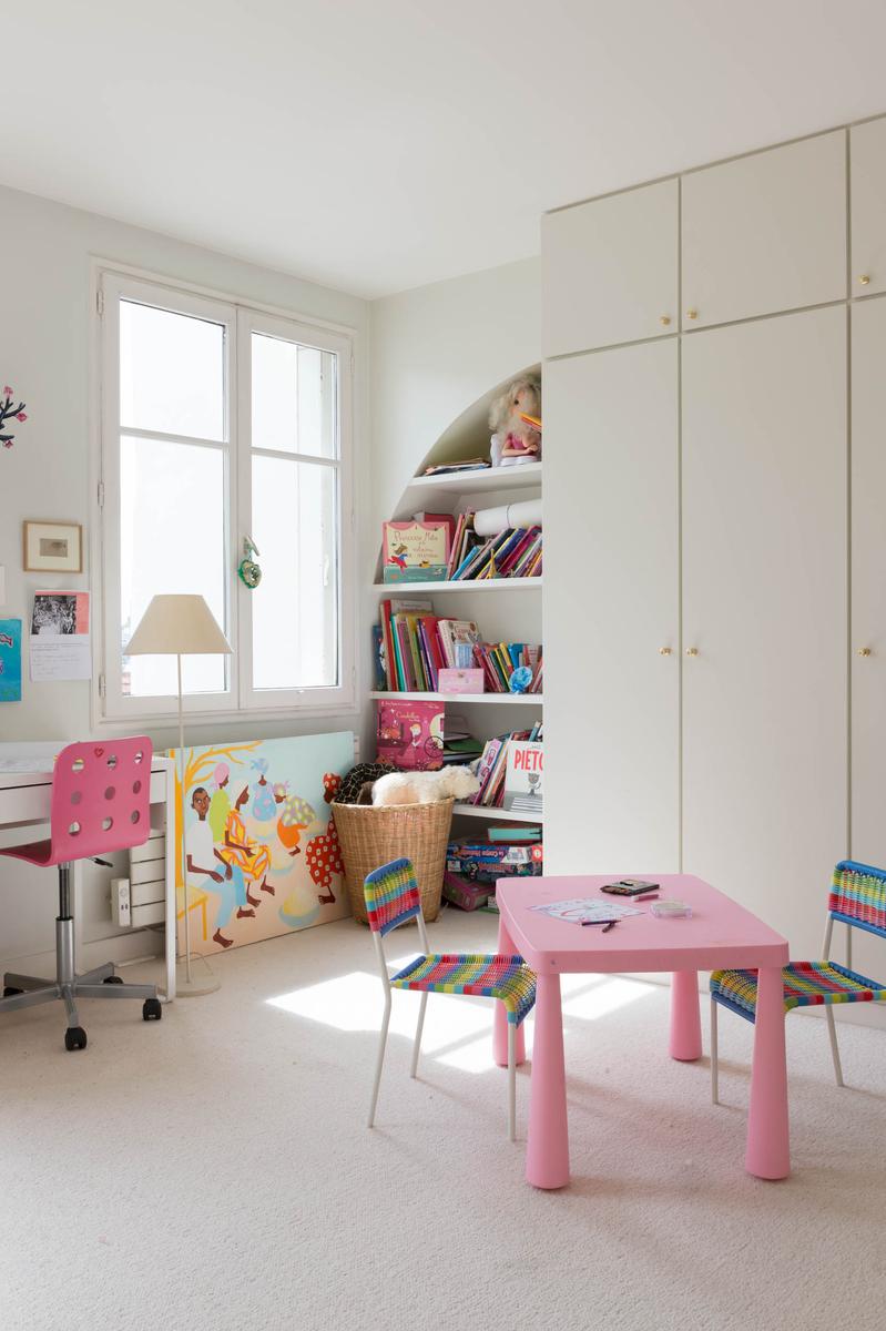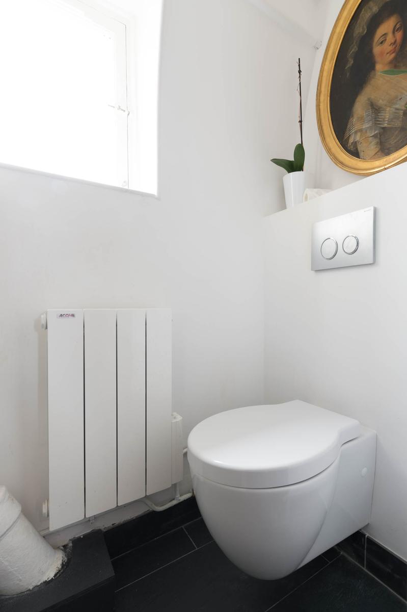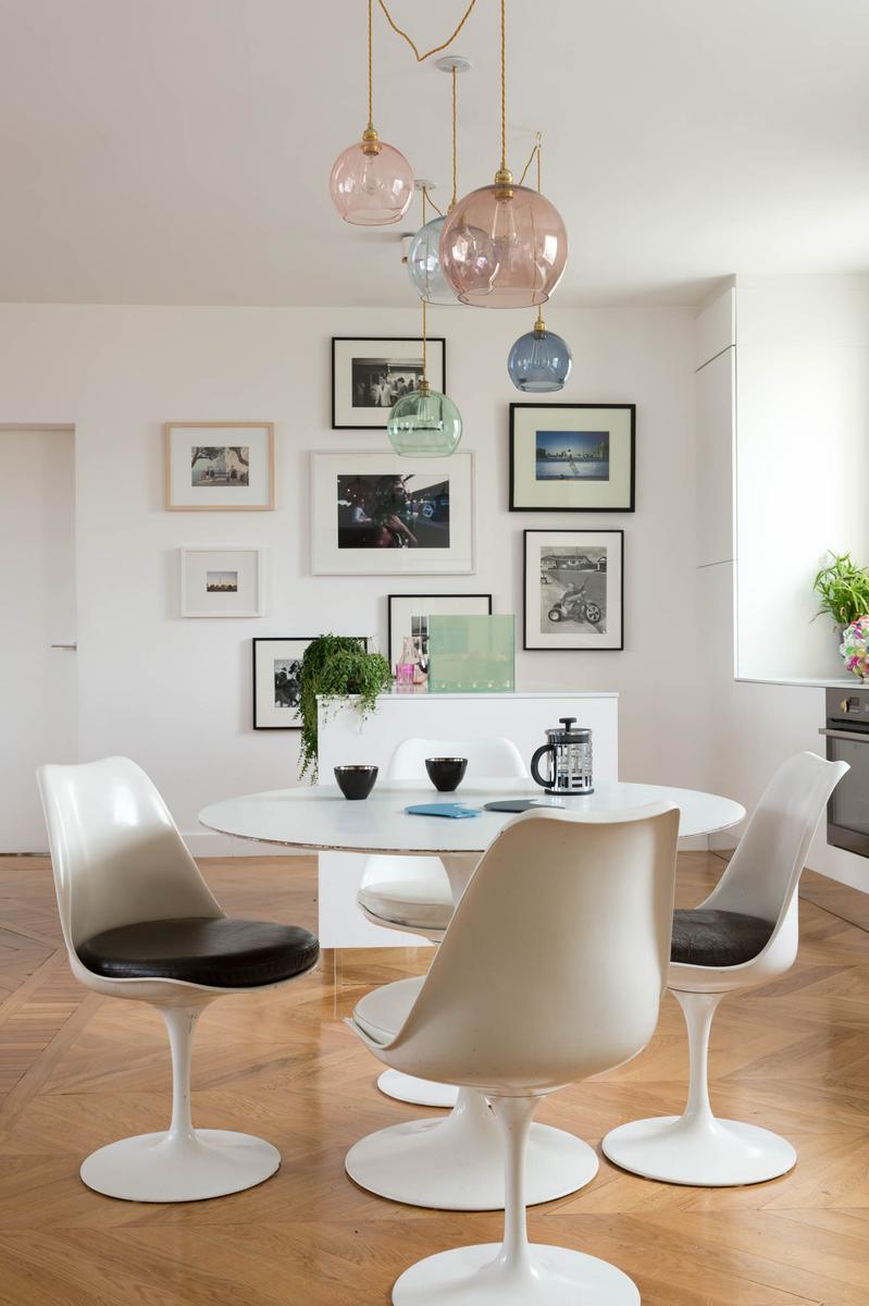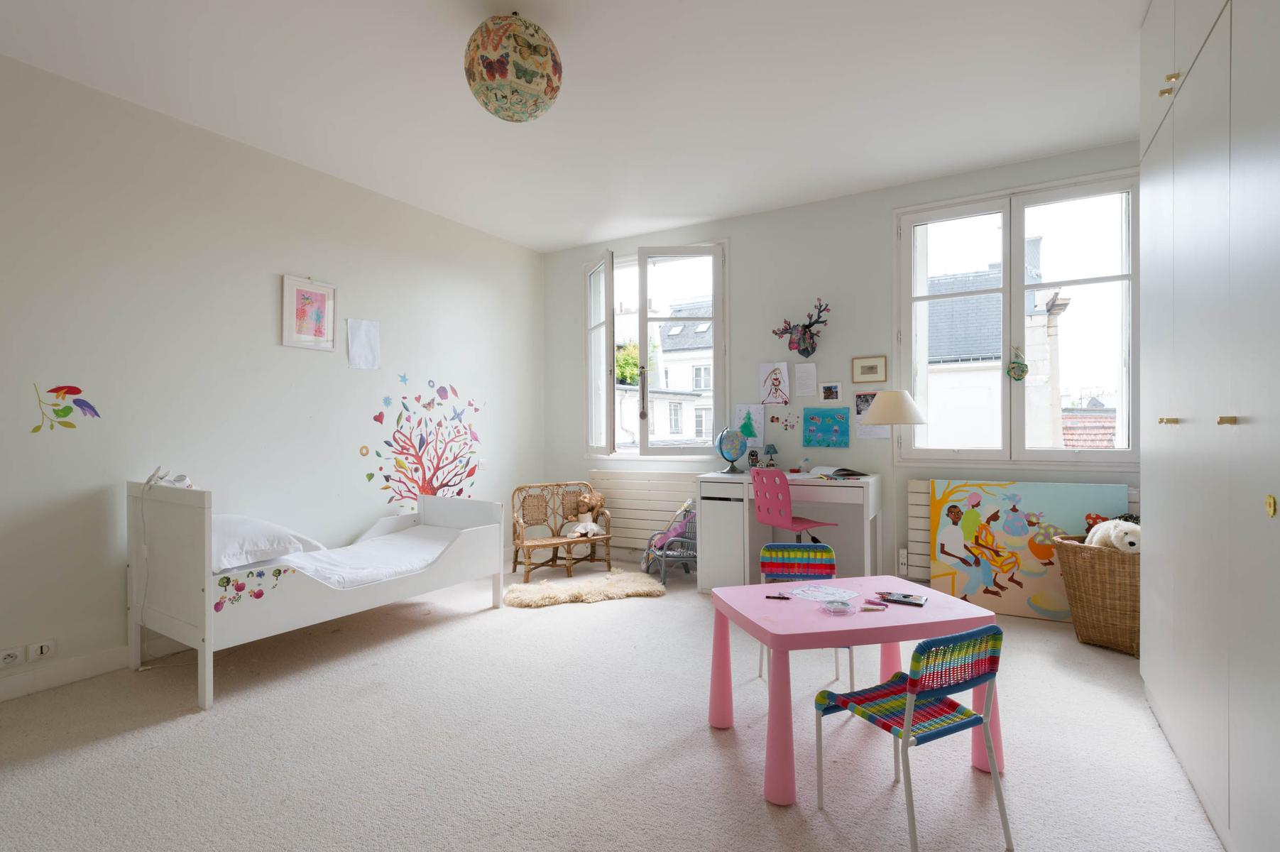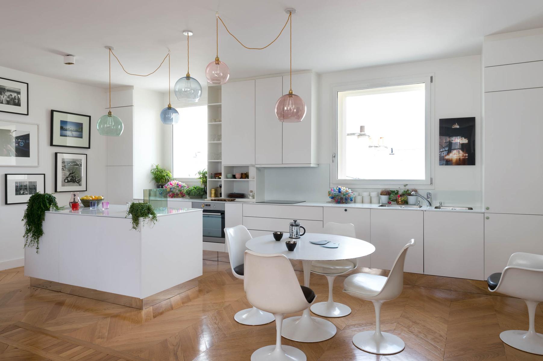 Cette maison a toute l’élégance de Saint-Germain-des-Prés, plus un peu de zeste. Le hall d’entrée passe devant un cabinet de toilette et mène directement au salon ouvert. À droite, un coin cuisine blanc élégant avec une table à manger contemporaine et des lampes pastel ombragées. Puis, à gauche, un coin salon aux couleurs contrastées, où des canapés et des fauteuils au rembourrage brillant sont posés sur un tapis rose pâle. Par la porte, vous trouverez ici le deuxième salon – encore plus richement décoré en turquoise et vert, avec une cheminée ornementale classique et des murs tapissés de livres.