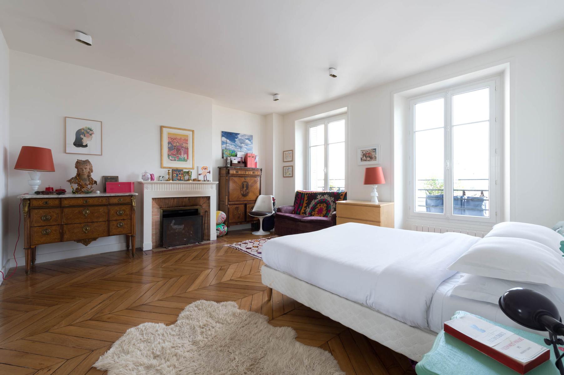 A l’extrême droite du salon, une porte s’ouvre sur la chambre principale. Elle est peinte en blanc et parquetée, agrémentée d’antiquités et d’œuvres d’art insolites, ainsi que d’une suite peinte en rose. Enfin, vous trouverez la salle de bain principale et trois autres chambres à coucher de caractère, la dernière avec une salle de bain aux carreaux jaunes.
